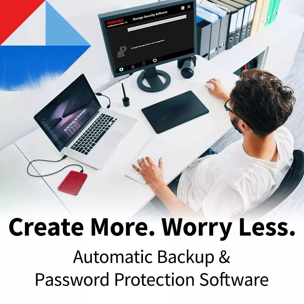 Product Page 4TB Red External Hard Drive USB 3.0 Auto Backup Password Protection Windows Only Description: Features: Compact design with stylish, textured finish and color options to fit your lifestyle. Automatic backup software to easily back up your content (free download, for Windows PC only). Password protection software to help prevent unauthorized access to your data (free download, for Windows PC only). USB 3.0 and USB 2.0 compatible. This product is formatted for Windows PC only. The user will need to reformat the drive for use with other operating system.