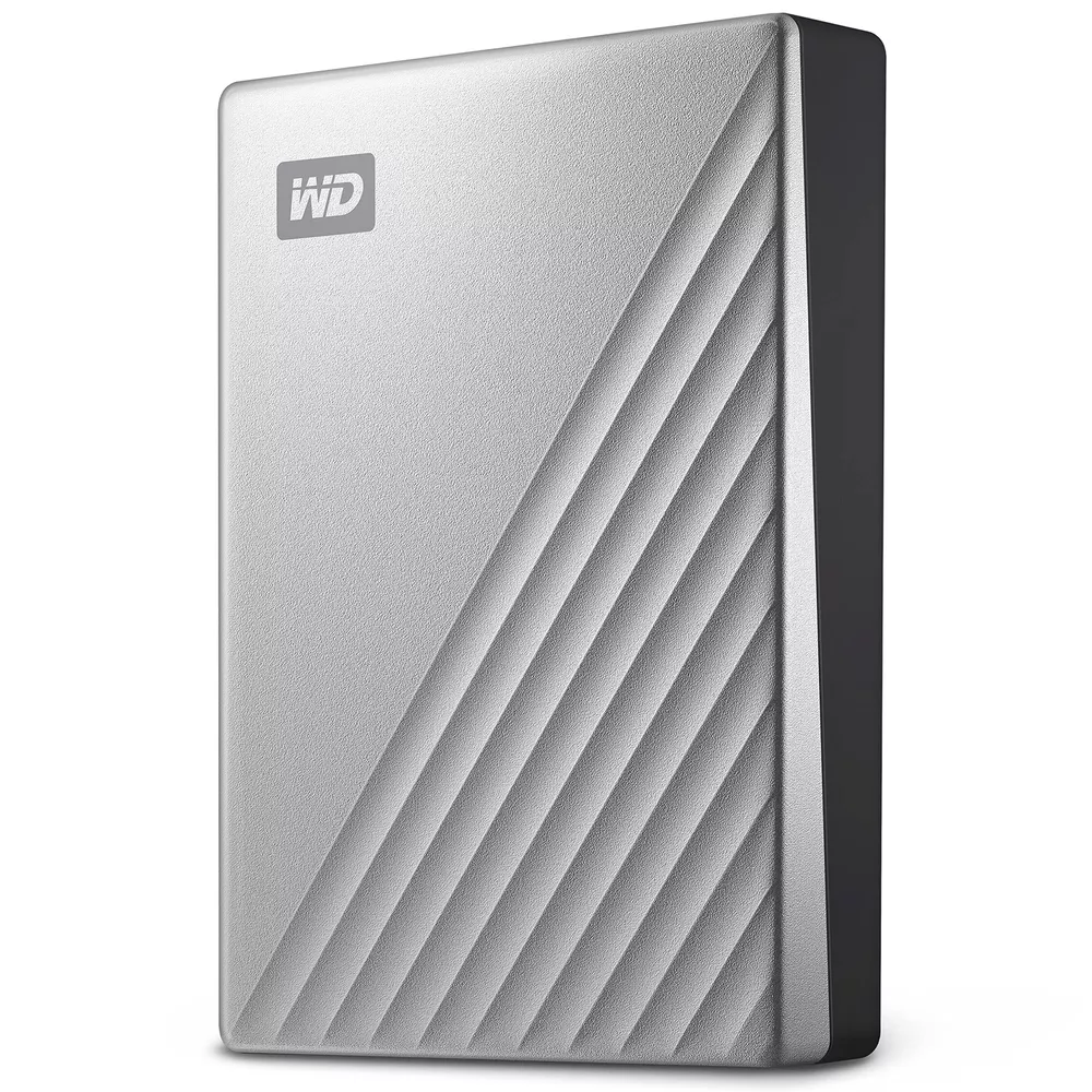 Product Page 4TB Silver Portable External Hard Drive USB C USB 3.1 with Password Protection Description: The My Passport Ultra is trusted, portable storage in a design that brilliantly pairs metal and matte finishes to create a sophisticated style. It has plenty of space to store all the content you love. Social media and cloud storage import, WD Backup software and password protection help keep all your memories safe and secure. Easy to use, just plug it in to start saving and backing up. Compatible with: WD's My Passport Ultra delivers quick and easy storage for your Windows 10, 8.1, or 7 system with its 5 Gb/s USB 3.0 Type-C port, while the included USB 3.0 Type-C to Type-A adapter helps ensure compatibility with older machines. This drive is also compatible with Windows 8.1 and 7.• System Requirements: Windows 10, 8.1 or 7 • Downloadable NTFS driver to readwrite on macOS. • Reformatting required to use Time Machine on macOS. Compatibility may vary depending on user’s hardware configuration and operating system.Interface: USB-C ready, USB 3.0 compatible. Features: USB-C and USB 3.1 compatible Innovative style with refined metal cover Password protection with 256-bit AES hardware encryption Formatted for Windows 3-year manufacturer's limited warranty