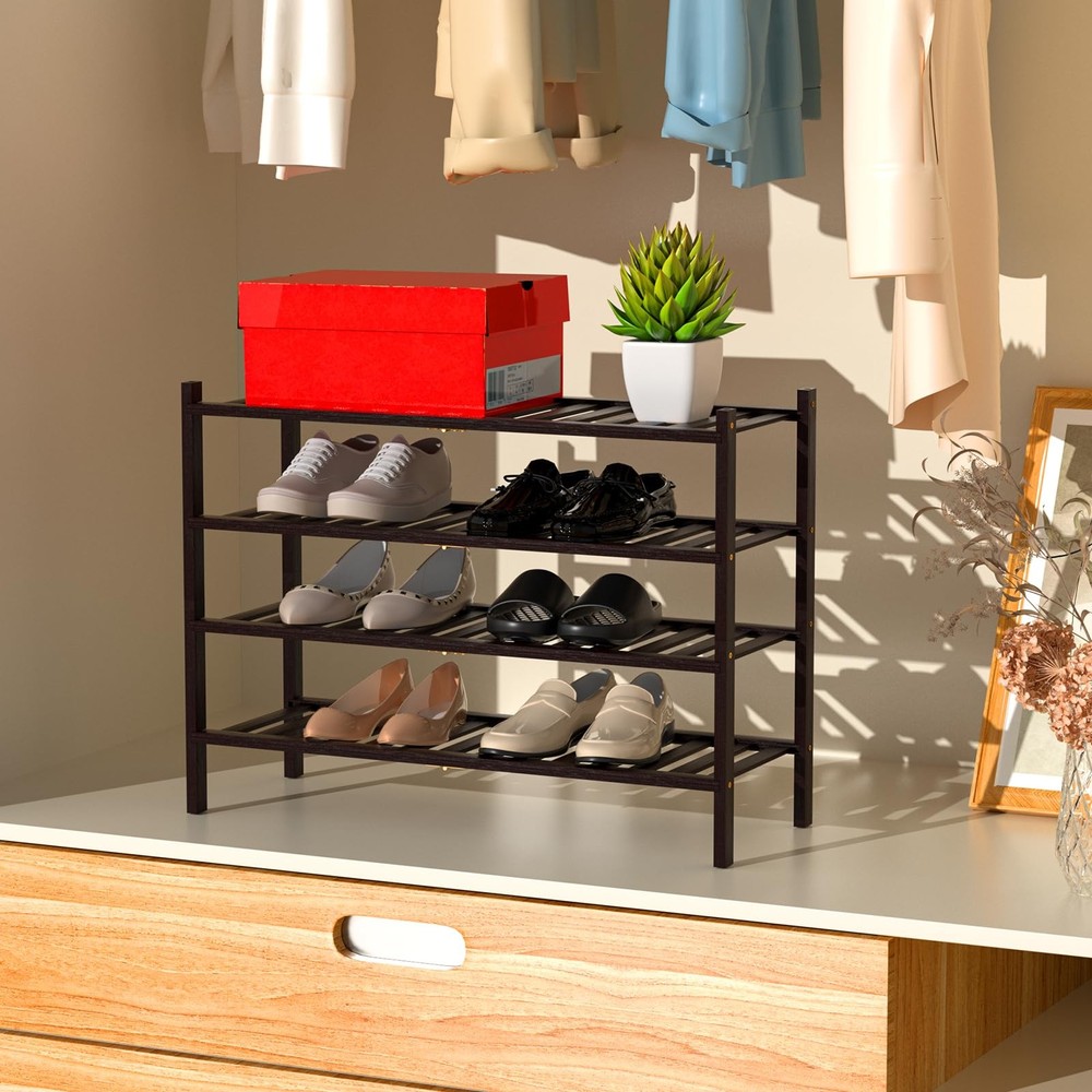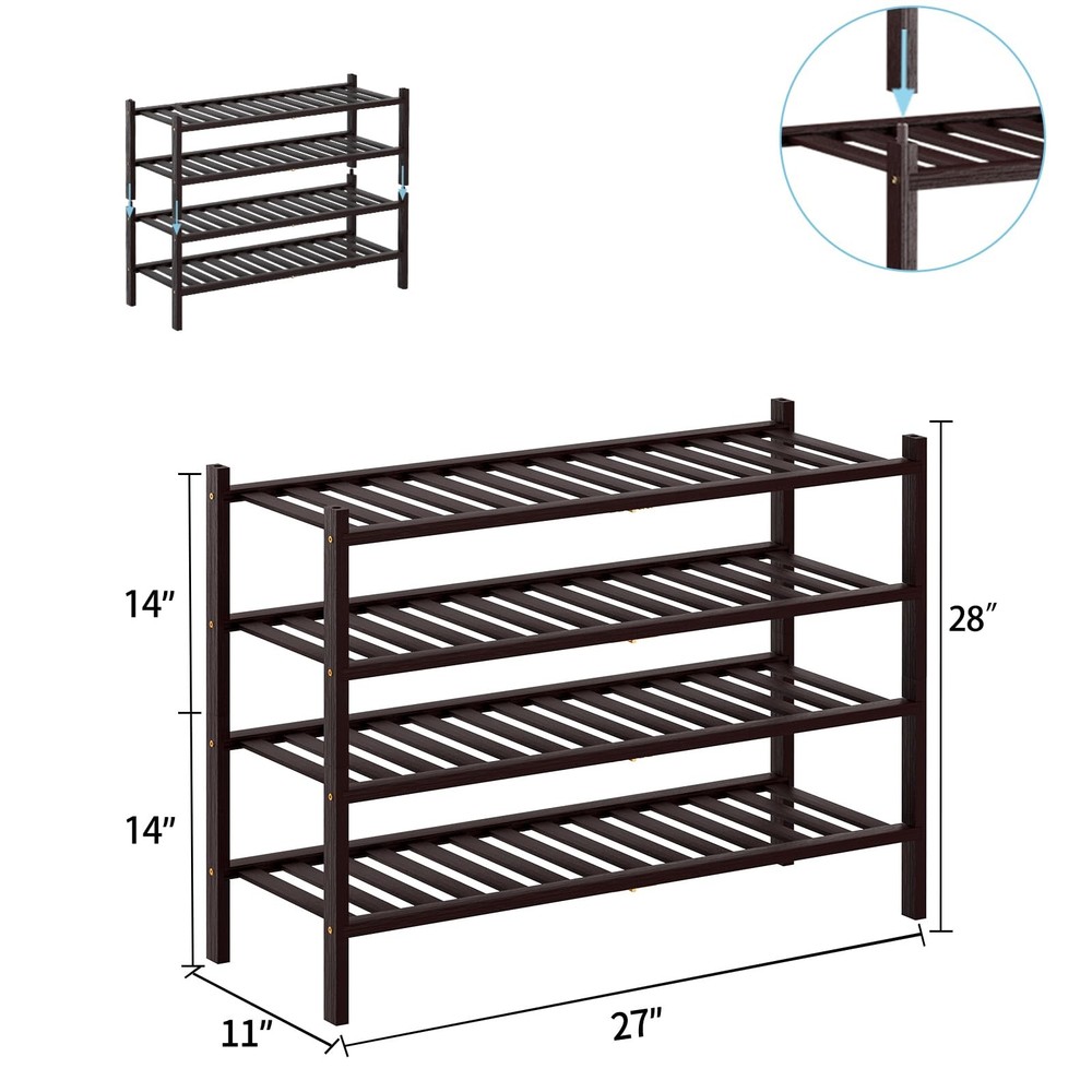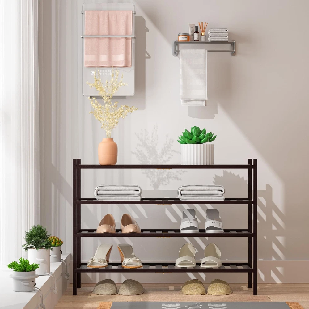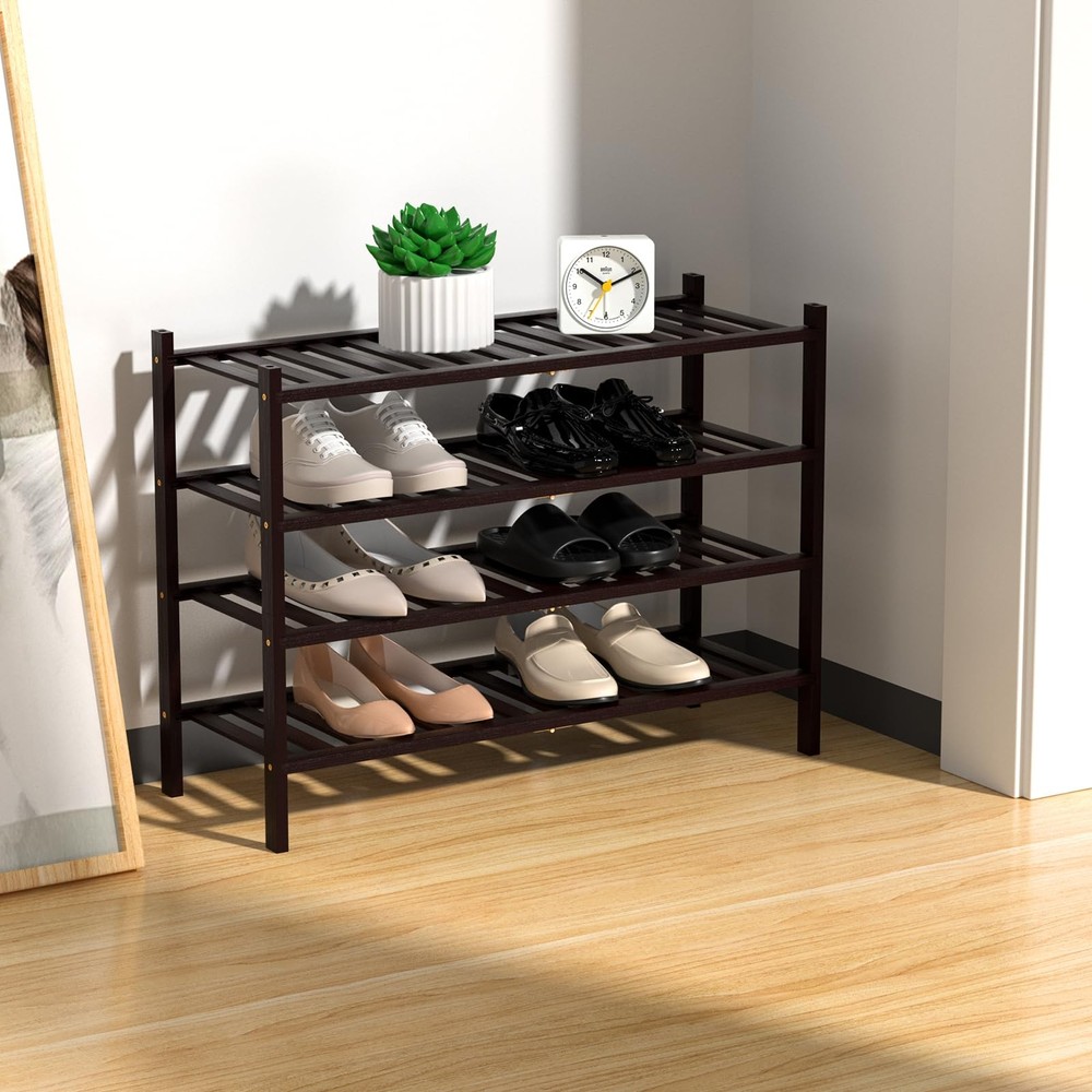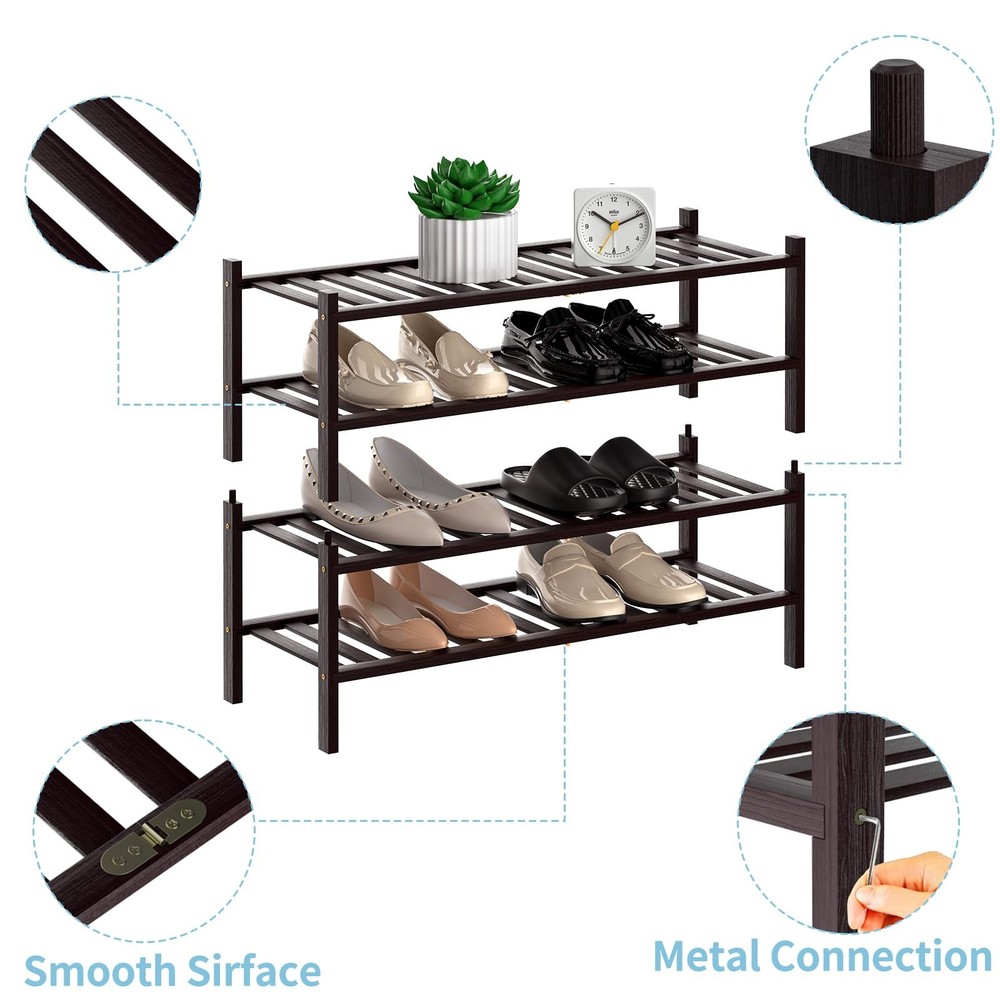 Free Standing Bamboo Shoe Rack for Closet HIGH-QUALITY BAMBOO MATERIAL: Our bamboo shoe rack is made of high-quality natural bamboo material, which has excellent durability and sturdiness. Bamboo is an eco-friendly material that not only brings natural beauty to your home environment but also reduces its impact on the environment. STACKABLE DESIGN - Each type of outdoor shoe rack is stackable, and the combinations are constantly changing. For example, two 2-tier shoe rack units can be stacked into a 4-tier shoe rack, additionally, You can DIY your shoe rack tiers to get a more suitable storage space according to the space in your home. EASY TO CLEAN AND MAINTAIN: Our bamboo shoe rack features a smooth surface and high-quality craftsmanship, making it not only easy to clean but also durable. Just wipe it with a damp cloth to keep it clean. MULTIFUNCTIONAL STORAGE RACK: Bamboo shoe rack can also be used as a decorative shelf or home organizer for other purposes.Also, this floor shoe rack has multiple uses to help you organize everyday items in your bathroom, living room, office, kitchen, such as toiletries, towels, clutter, decorations, books, plants, shoes and small appliances. SPACE-SAVING: Our bamboo shoe rack is perfect for small homes, with its vertical design saving valuable floor space. You can place it in small spaces like hallways, entryways, or next to your closet to make your home more tidy and organized.