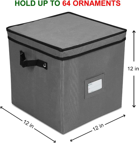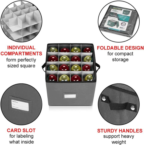 ProPik Christmas Ornament Storage Box, 4 Tier Holds Up to 64 Holiday Ornaments Decoration Balls, Storage Container with Dividers, Made with Durable 600D Oxford Polyester Material (Gray) LuxeFusion Product Description Features PROPIK Durable Ornament Storage Box & Organizer, Strong tear-proof material Heavy duty polyester construction Dimensions: 12" Height X 12" Wide X 12" Length, Large enough to hold up to 64 Accessories & Xmas Tree Decorations Individual compartments - 4 Trays with 4 panels set horizontally & diagonally are included with the storage box to form perfectly sized square 64 compartments Storage Cube comes with a Removable lid that is easy to open and close keeping insects and dust out Built-in Heavy duty reinforced Handles for easy Carrying when fully loaded, includes Plastic tag compartment on side Product Details Brand: âProPik Color: âGray Material: âPolyester Special Feature: âlockable, shatterproof, portable, stackable, Durable Removable Style: âCover Top Recommended Uses For Product: âDecoration Product Dimensions: â12"L x 12"W x 12"H Water Resistance Level: âNot Water Resistant Opening Mechanism: âLift-Off Lid Shape: âSquare Pattern: âSolid Number of Items: â1 Number of Compartments: â64 UPC: â810036551496 Manufacturer: âProPik Item Weight: â4.02 pounds Number Of Pieces: â1 Special Features: âlockable, shatterproof, portable, stackable, Durable Removable Usage: âornament storage Batteries Included?: âNo Batteries Required?: âNo Brand: ProPik Color: Gray Material: Polyester Special Feature: lockable, shatterproof, portable, stackable, Durable Removable Style: Cover Top ð Free Shipping All orders ship free and fast to your doorstep. ð Easy Returns Satisfaction guaranteed. 30-day returns, no questions asked. ð¬ 24/7 Support Contact us anytime; weâre here to help, day or night. Brought to you by LuxeFusion â Quality you can trust.