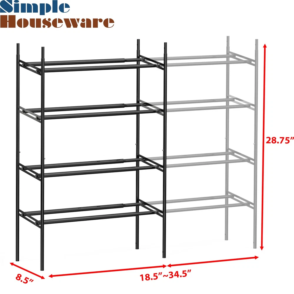 4-Tier Expandable and Stackable Shoe Racks with Shelves for 16 Pairs of Shoes, Black Expandable And Stackable Design. Stores up to 16 pairs of shoes, additional bottom storage for slippers. Sturdy Metal Construction with Elegant Silver Coating, each shelf holding up to 30 lbs. Easy Assembly Personalized Storage: Purchase more units to build your storage. Build and Organize with multiple 4-Tier Metal Panel Utility Shoe Racks. Dimension: 18.25" - 34.5" W (extendable) 8.5" D 28.75" H.