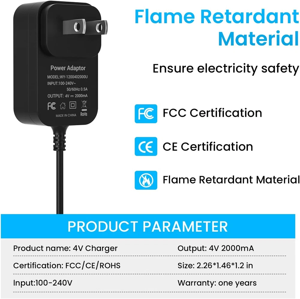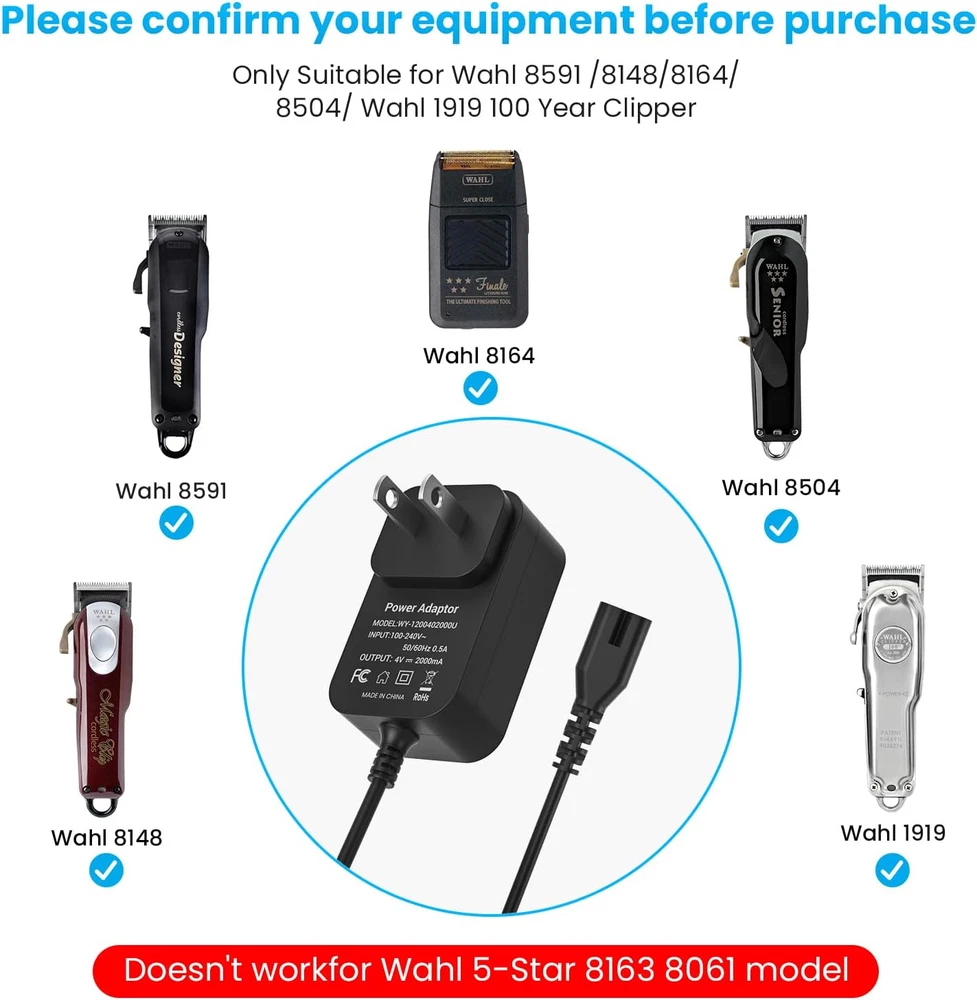 Store New Arrivals Add to Favorite View Feedback Contact 4V for Wahl Magic Clip Cordless Charger, 4V Wahl Clipper Charger for Wahl Shaver 8148/8591/8164/8504, Wahl 1919 100 Year Hair Clipper, Wahl 5-Star Magic Clip Cordless Shavers. Description Item model number 4v 2 A Power Adaptor Manufacturer SHENZHEN WOYUAN ELECTRONICS CO.,LTD Mounting Type Wall Mount Color black Is Discontinued By Manufacturer No Product Dimensions 2.17 x 1.38 x 0.98 inches Connector Type Barrel Connector Compatible Devices function(f) {var _np=(window.P._namespace("DetailPageProductOverviewTemplatesJava"));if(_np.guardFatal){_np.guardFatal(f)(_np);}else{f(_np);}}(function(P) { P.when('A').execute(function(A){ A.on('a:truncate:po-attribute-truncate-3:updated', function(data) { var isTruncated = !data.truncateInstance.getIfTextFits(); var seeMoreElement = document.getElementById('po-attribute-see-more-id-3'); if(seeMoreElement) { seeMoreElement.style.display = isTruncated ? '' : 'none'; } }) }); })); Wahl 5-star Magic Clip Cordless Hair Clipper 8148/ 8148L 8148-308 8504 8164 Shaver ,Wahl 1919 100 Year Clipper, Wahl Cordless Senior 08504-400 Shaver, Wahl 8591 Electric Cordless Clipper Trimmer, such as 8591L,8591-001 / 8591-1235 / 8591-016 / 8591-018 See more Item Weight 3.52 ounces Connectivity Technology USB Input Voltage 4 Volts (DC) Compatible Phone Models function(f) {var _np=(window.P._namespace("DetailPageProductOverviewTemplatesJava"));if(_np.guardFatal){_np.guardFatal(f)(_np);}else{f(_np);}}(function(P) { P.when('A').execute(function(A){ A.on('a:truncate:po-attribute-truncate-4:updated', function(data) { var isTruncated = !data.truncateInstance.getIfTextFits(); var seeMoreElement = document.getElementById('po-attribute-see-more-id-4'); if(seeMoreElement) { seeMoreElement.style.display = isTruncated ? '' : 'none'; } }) }); })); Wahl 5-star Magic Clip Cordless Hair Clipper 8148/ 8148L 8148-308 8504 8164 Shaver, Wahl 1919 100 Year Clipper, Wahl Cordless Senior 08504-400 Shaver, Wahl 8591 Electric Cordless Clipper Trimmer, such as 8591L,8591-001 / 8591-1235 / 8591-016 / 8591-018 See more Special Feature Travel, Short Circuit Protection Brand NFGEKT Included Components Charger Safety Design: Charger Fit for Wahl Cordless Magic Clipper Tested, approved and certified by FCC and CE and ROHS. built in smart chip,Over current protection, Over temperature protection ,Short circuit protection,Over voltage protection. Compatible With: Wahl 5-star Magic Clip Cordless Hair Clipper 8148/ 8148L 8148-308 8504 8164 Shaver ,Wahl 1919 100 Year Clipper, Wahl Cordless Senior 08504-400 Shaver, Wahl 8591 Electric Cordless Clipper Trimmer, such as 8591L,8591-001 / 8591-1235 / 8591-016 / 8591-018( please check the compatible models before your purchasing) Notice: ❌❌NOT COMPATIBLE with Wahl New Model 8171 8148L1 8504L1 8591L1 97624-002 97624-800 90302-100 97618-2200 shaver,❌❌Wahl 8163 9818 8061 9649 shaver,❌❌Wahl SS2L trimmer and other brands clipper/shaver. Input: 100-240V AC, 50-60Hz. Output: DC 4V 2A. Cable length: 1.8M/6FT. The extremely long Wahl power cord allows you to use indoor convenient. AFTER-SALE SERVICE: This product can be replaced or refunded within 30 days, if you have any questions about our products, Please contact NFGEKT promptly by email. Thank you for your support. Product Description Compatibility: 4V Clipper Compatible with Wahl Magic Clip Cordless Charger Cord with Wahl 5 Star Cordless Premium Hair Clipper 8148. Professional 5 star cordless magic clip hair clipper charger for Wahl 5-Star 8164 Shaver. Charger Fit for Wahl Cordless Magic Clipper 97225-002 Clip Shaver AC Adapter Power Cord Supply forS010AZM0400200. NFGEKT Charger Compatible with Wahl 8591 Electric Cordless Hair Clipper Trimmer. NFGEKT 4V 2A clippers magic clips charger for Wahl 1919 100 Year Hair Clipper. This Wahl clipper charger replacement is only for our listed models, please check our listed compatible models and make sure your clipper model matches it. 4V charger replace with Wahl 5-star Cordless Senior Hair Clipper 8504. Please check your Wahl Trimmer model number or original Wahl Trimer charger connector before purchasing to make sure the charger is compatible with your Trimmer. Note: Clippers shaver charger for wahl not applicable to Wahl 8163 / 9818 / 8061 / 9649 / Whal Model 8171 (Not Work Andis Clipper or Foil shaver). If there is any problem with the product received andyou can ask us through Amazon at any time. We care about only putting out high quality products that satisfy your needs. Please check whether the charger you need matches the compatible model listed in the picture and title before purchase; Because some models of this product have different versions of the interface, if you are not sure whether it matches, please provide the product model and take a picture of the device interface to ask us, we will give you suggestions. Safety & Reliable: The 4V charger for wahl groomer clipper supports over current protection, Over voltage protection, Short circuit protection, Over temperature protection which will keep dangers away from charging your wahl clipper, CE/FCC/RoHS listed.It is normal for the temperature of the wahl charger to increase during charging of wahl trimmer clipper. ABOUT US We offer the best prices around on high quality products. Our E-store includes media such as books, movies, music and games while offering electronics, toys, sporting apparel, clothing, tools, general home, garden items and more. SHIPPING We are always working hard to ensure your package arrives as soon as possible. Please understand that some factors like weather, high postal traffic, and the performance of shipping companies are outside of our control. We offer free shipping to the lower 48 states and ship within 2 business days of payment, usually sooner. We do not accept P.O. Boxes. Please provide a physical address. RETURNS We offer a 30-Day Return Policy on items which you are not completely satisfied with. You have the optio
