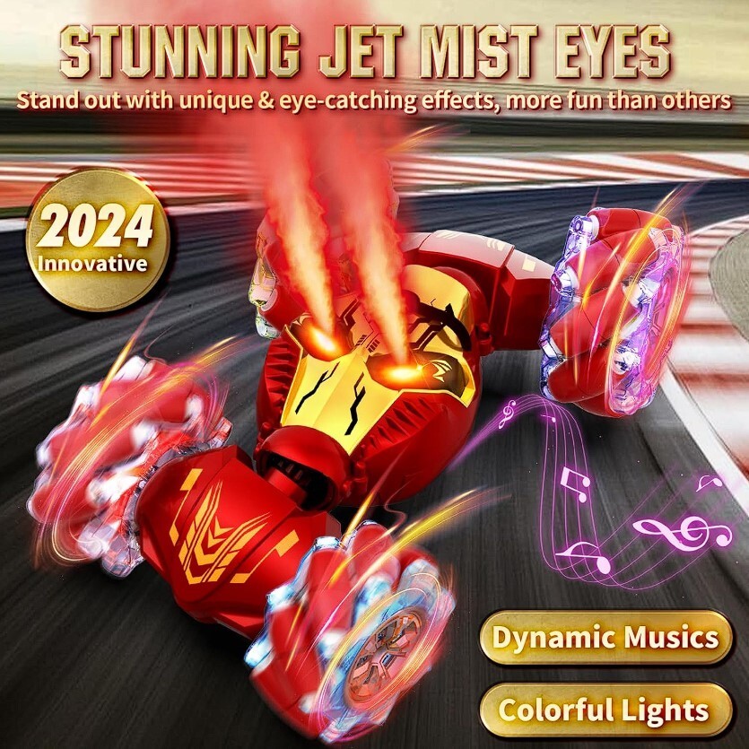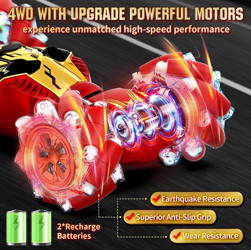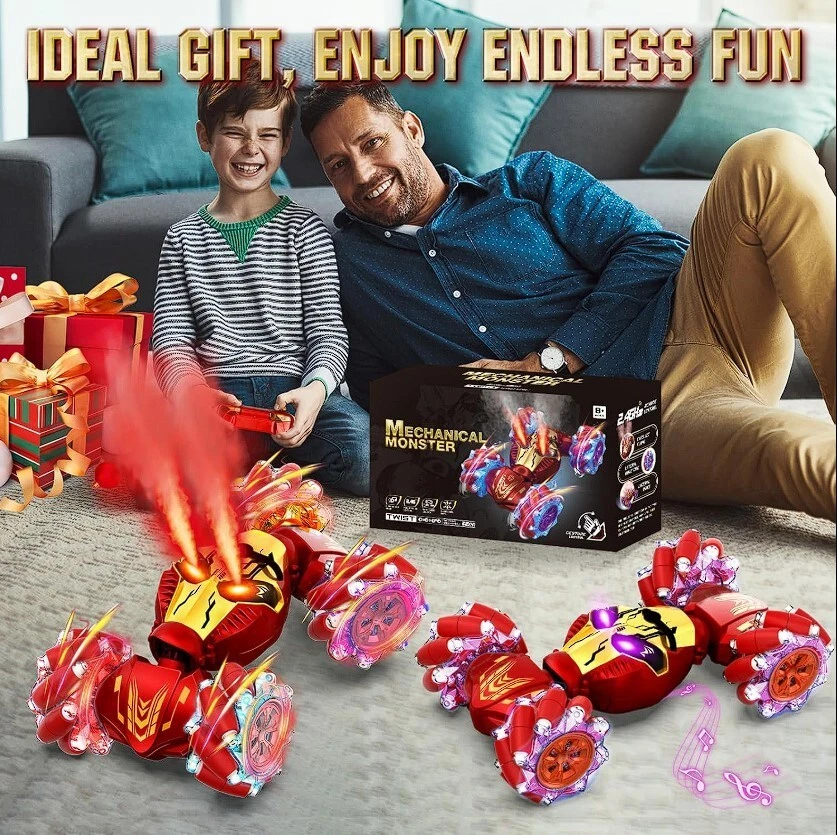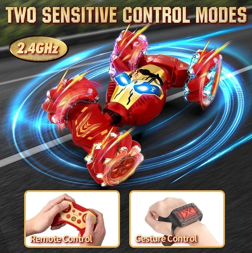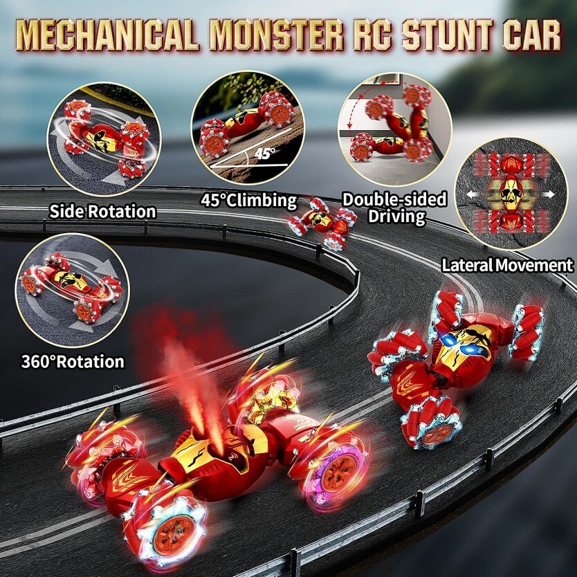 Newly Upgraded With Mist-Spraying Eyes: This 2024 latest upgraded gesture sensing RC stunt car boasts a super cool mist-spraying eyes feature, standing out with its unique effects, adding excitement to every race. The stylish design combines dazzling LED lights and dynamic music, delivering an unparalleled visual and auditory experience that kids will absolutely enjoy this 4WD RC drift car. Ultimate Stunt Car & Omni-Drifting: Get ready for heart-pounding stunts with Lozadia remote control car! This mechanical monster supports transformations, 360° rotation, sideways movement, double-sided driving, forward/backward or climbing. The strong 4WD system provides superior power and high-speed for stunning racing experience. Whether indoors or outdoors, this rc cars guarantees a thrilling driving, inspiring kids' adventure and creativity! All-Terrain Conqueror for Endless Adventure: Featuring bionic joints and dual-sided roller wheels, this RC Stunt Car effortlessly switches between on-road and off-road modes. It conquers challenging terrains like sand, grass, dirt, and rocks with ease. The high-performance, durable tires provide superior grip and shock absorption, ensuring the car remains intact after impacts, ready to tackle any terrain fearlessly. Two Remote Controls & Infinite Playtime: Featuring both a handheld remote and magical gesture control, simply wave your hand with the sensor watch for interactive stunts. The 2.4GHz anti-interference technology lets multiple cars race together without signal issues. The rc cars for boys age 8-12+ is equipped with 2 rechargeable batteries that can be alternately charged, let kids enjoy endless fun with our twist car. Perfect Gift for Boys & Girls Ages 6-12+: Lozadia remote control stunt car is a fantastic gift for boys and girls 6 7 8 9 10 11 12+ years old, offering fun for the whole family. Whether for birthdays, Christmas, New Year, Children's Day, or parties, this exciting, gesture-controlled car is an ideal car toys for boys and girls. It brings joy, excitement, and a thrilling experience that kids and adults alike will love!
