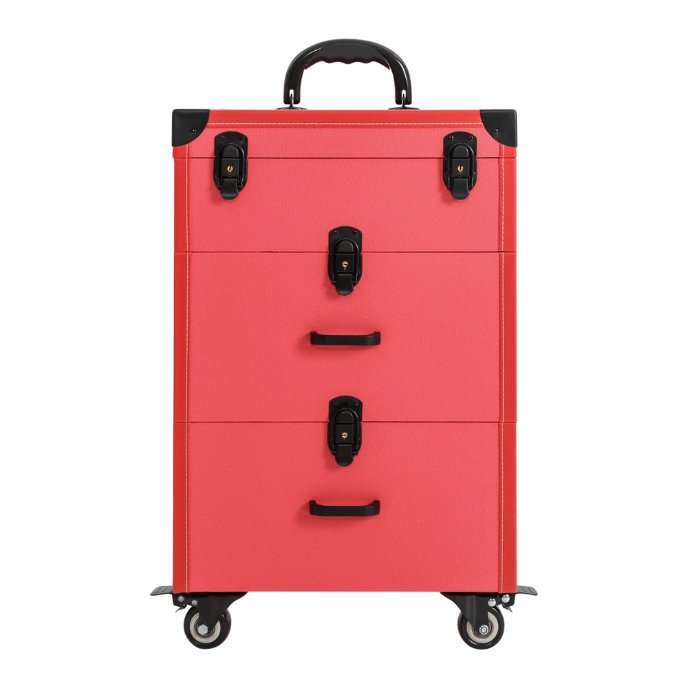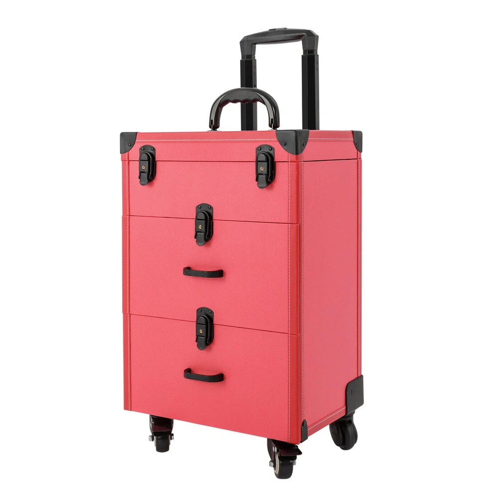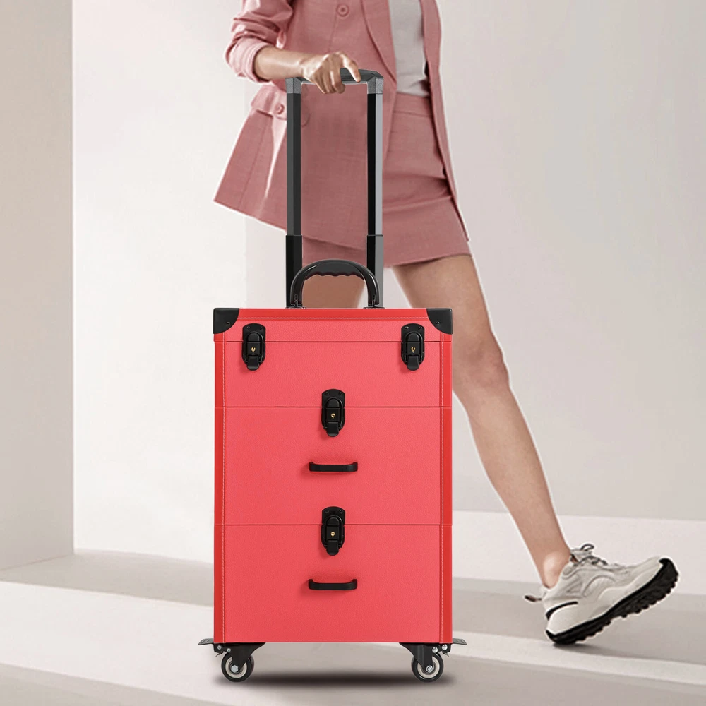 TOP Rolling Makeup Trolley Case Jewelry Travel Cosmetic Train Case with 4 Wheels Description If you are troubled by storing all your hairdressing tools in order and finding them easily, our makeup train case can be of great help to you. Featuring high durability, attractive appearance, large capacity, universal wheels, humanized handles, a telescopic rod, and more, this product is easy to carry outside while keeping practical and beautiful. It is an ideal choice for young manicurists, make-up artists, and hairdressers/cosmetics lovers to store various cosmetics. Key Features Beautiful Appearance: Bright rose red color combined with a rectangular frame, smooth lines, and delicate lychee texture gives this product a stylish and beautiful look. High-quality black hardware and exquisite stitching also add to its appearance. Durable and Sturdy: This product is constructed with premium PU, PVC, and reinforced corners, aluminum alloy rod, zinc alloy-wrapped edge , which is waterproof, wear-resistant , and has a long service life. Large Capacity: The 3-tier and compartment designs, cubicles, and a large clear pocket on the lid give this case a large capacity to hold your daily cosmetics and makeup tools in a categorized way, allowing you to quickly find what you want. And the dividers are removable for organizing different sized bottles. Easy to Move&Carry: 4 universal wheels (2 of which are lockable) ensure that the case can be moved smoothly and silently in all directions and allow for safe fixation to handle different road conditions. The telescopic handle and top handle give it high portability. Easy to Clean: The lid and drawer designs can prevent dust from entering, along with the waterproof surface, making it easy to clean. You just need to wipe off the dirt with a wet cloth. Excellent Load-bearing Capacity: The sturdy construction and the zinc alloy frame provide the product with an excellent weight-bearing capacity of 88.2 lbs. You can place all kinds of hairdressing and beauty tools in it with confidence. High Safety: The 4 latch locks and waterproof surface provide maximum protection and security for your toiletries, giving you peace of mind while traveling. Protective Packaging: To prevent the product from being damaged and bumped during transportation, we pack it with pearl cotton for maximum protection of your products. After-sales Service : We aim to provide quality products and services. If you have any problems, please feel free to contact us, and we will reply and solv e the problem for you as soon as possible. Details Back Buckles: The back of the luggage has two hardware eight-nail back buckles to make the case more stable and to ensure that it remains as good as new when repeatedly opened and closed. User-friendly Drawer Handle: The 2 comfortable drawer handles of the second and third tiers allow for convenient closing/opening of the drawers, thus ensuring easy access to the inside items. Application It is good for manicurists, makeup artists, both beginner and professional, freelance makeup artists, wedding makeup artists, celebrity makeup artist, and cosmetic trainees. Structure Overview The inside of the lid has a makeup bag where you can keep the things you use regularly for quick and easy access. The first tier can be used for nail varnish or other small items. The second tier is suitable for larger items such as hair dryers, curling wands, nail art machines, and more. The third tier has two compartments for medium items, such as cosmetics, hairspray spray. Specification Color: Rose Red Shape: Rectangular Number of Tiers: 3 Number of Wheels: 4 Number of Keys: 2 Caster Type: Swivel Target Audience: Unisex Adult Mounting Type: Free Standing Material: PU, PVC, Zinc Alloy, Aluminum Alloy Max. Load-bearing Capacity: About 40kg/88.2lbs Lid Size(L*W): 36*23cm/14.2*9inch Wheel Height: 7cm/2.8inch Telescopic Rod Length (Min.): 38cm/14.9inch Telescopic Rod Length (Max.): 86cm/33.8inch Second Tier Inside Size: 30*19.5*13.5cm/11.8*7.7*5.3inch Each Compartment of Top Tier Size(L*W): 3.5*3.5cm/1.4*1.4inch Each Compartment of Third Tier Size: 14.5*19*13.5cm/5.7*7.5*5.3inch Top Tier Height: 9cm/3.5inch Second&Third Tier Height: 17cm/6.7inch Overall Case Body Size: 36*23*49cm/14.2*9*19.3inch Overall Product Size: 36*23*101cm/14.2*9*39.76inch Package Size: 63*32*41cm/ 24.8*12.6*16.14inch Gross Weight: 10kg/22.04 lbs Product Weight: 9kg/19.84 lbs Package Included 1*Makeup Train Case 2*Keys Notes Please note that cosmetics or makeup tools are not included. This product is a carry case only. Please allow the slight color difference caused by the shooting light and 1-3 cm error due to manual measurement, and make sure you do not mind before ordering. Payment Delivery details Terms of sales About us Contact us Payment We accept ebay payment 。 Fees such as import duties, taxes are not included in the item price or shipping costs. These charges are the buyer's responsibility. Delivery details Shipping: 2-9 working days to: USA Terms of sales We maintain high standards of excellence and strive for hundred percent customer satisfaction. Feedback is very important to us. We hope that you contact us immediately before you give neutral or negative feedback, so that we can address your concerns. It is impossible to address issues if we do not know about them! About us Your satis faction is our ultimate goal. We work hard to earn your trust and future business. Our certified technicians have tested each item before shipping. The unit comes with 1 year limited warranty on all manufacturing defects. a) If you receive a defective item, you may return it or ask for a discount. Please contact us within 14 days after you receive the package. b) What you returned must be intact and in its original packaging as re? u. Customer is responsible for shipping costs of the returned item. c) We will cover the cost of shipping back t with the shipping rate indicated in the registration page. We will send you a new 