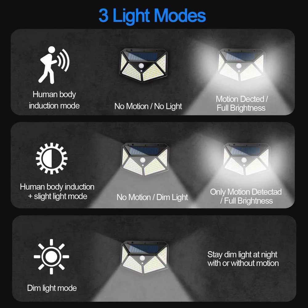 Solar Power 100 LED Light PIR Motion Sensor Outdoor Security Lamp Wall Garden 100 LED PIR Motion Sensor Wall Security Light Solar Power Waterproof Outdoor Garden Patio Path Light - 1 Pack 【 Eco-friendly Product 】 100 LED solar wall light added indicator is a product that designed to be energy saving and environmental protecting. It has long durability and long-life span. More than that, it has low fault repair rate and high radiation stability which makes it an awesome product. 【 Easy to Install 】 100 LED solar wall light is very simple to install, no wiring is needed. Just find a spot and use the 2 Screws to fix the wall light to the outdoor well sun-lit location. 【 Easy to use 】 100 LED solar waterproof four-sided human body induction wall light switch front setting is easier to operate. It has 3 setting which you can achieve by pushing the button in the middle. It has intelligent light-sensing sensor and wide range lighting angle. Description and Features 3 Modes Available - Mode 1. Medium Bright: When the night falls, the solar light will maintain 1/2 brightness. - Mode 2. Dim Bright + Full Bright : Slight brightness when no motion is detected. When motion is activated, it lights up in full brightness and turns back to slight brightness when motion is no longer detected. - Mode 3. No Bright + Full Bright : No brightness when no motion is detected. When motion is activated, it lights up in full brightness and turns back to no brightness when motion is no longer detected. - Can be widely used for garden, patio yard, deck garage, pathway porch in most kinds of weather. Weather Resistance - Our units are made of high-impact ABS which can withstand snow, rain and other extreme weather conditions. IP65 waterproof and heatproof, solar powered lights, suitable for most kinds of weathers. 270 ° Wide Angle -The solar wall lights by using exclusive 4-Side Built-in LEDs Wide-angle Lighting Design, the illumination range can be improved up to 270°. So, the coverage area has been upgraded almost three times than before. Sufficient Use Time - It can be used more than 10 hours after charging, which is more convenient. Packing list: 4* Solar Light 8 * Screw 1 * English manual Detail Images