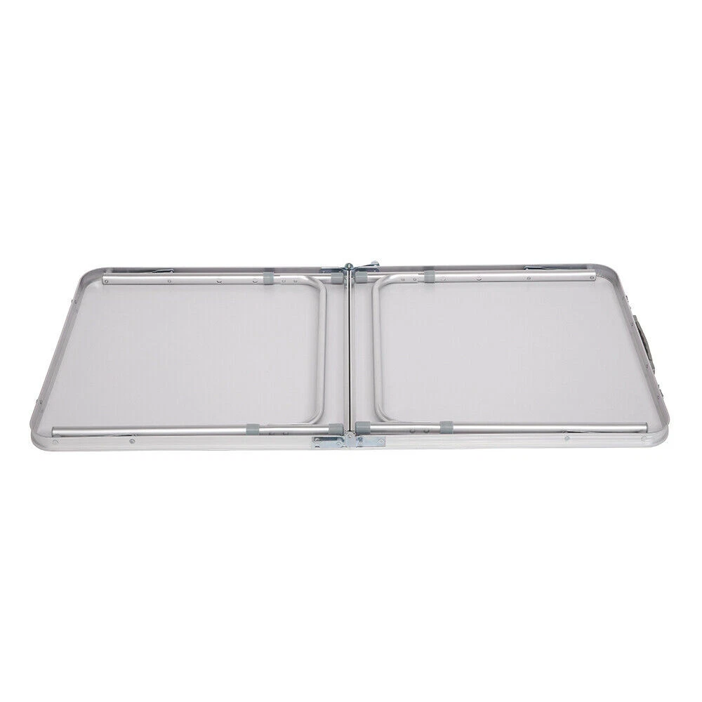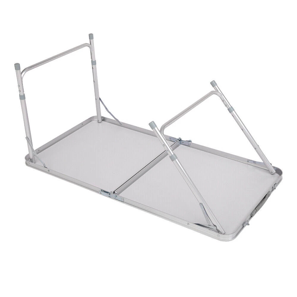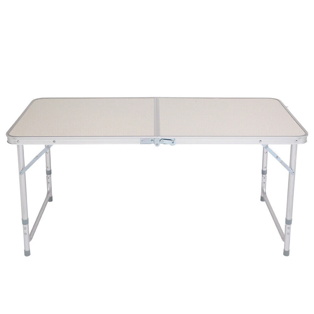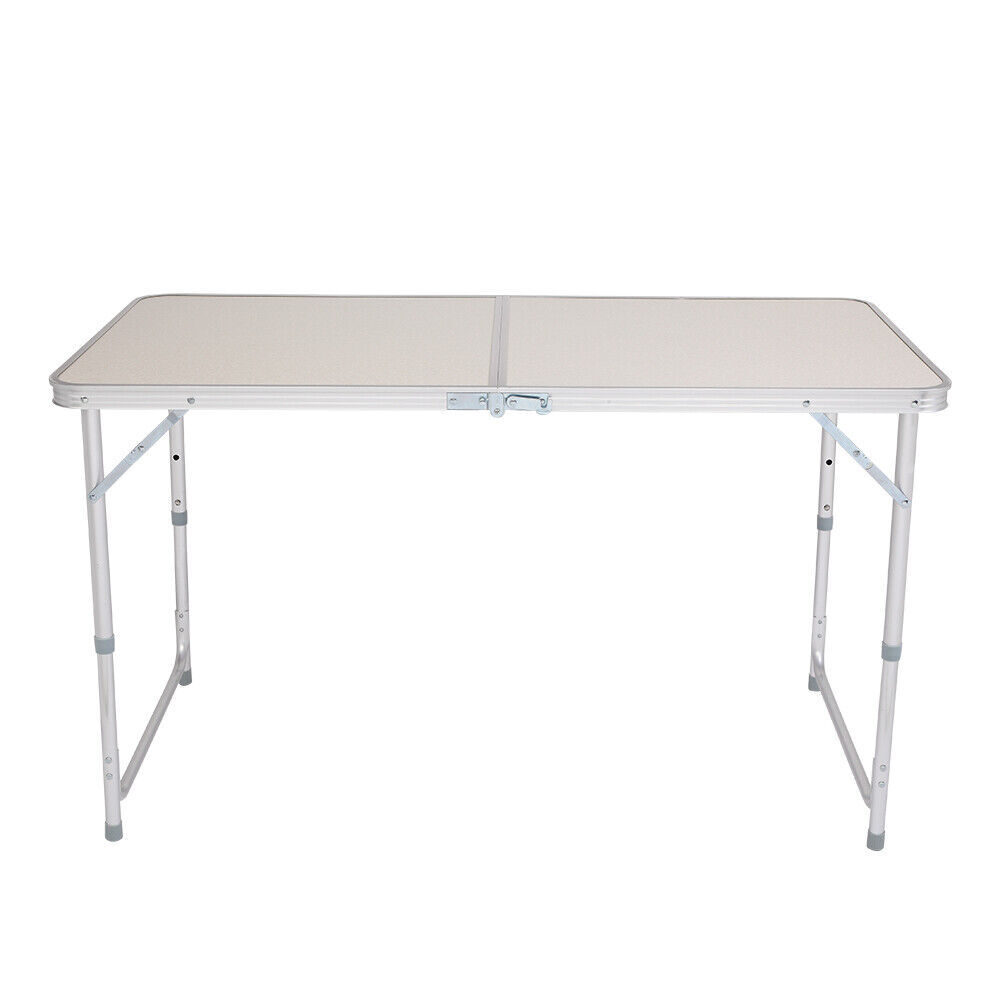 Introductions: This is our 120 x 60 x 70 4Ft Portable Multipurpose Folding Table, which is ideal for family reunions, picnics, camping trips, buffets or barbecues.This table is great for entertaining and can be used as a serving table, game table, or outdoor dinningtable. This table is great for entertaining and can be used as a serving table, game table, or outdoor dinning table. Features: 1. New and high quality 2. Legs can be locked into a fixed position for stability 3. Durable nylon adjustable glides protect floor surfaces 4. Portable design, fold and set for use quickly & easily 5. Height adjustable three block (55cm, 62cm, 70cm) 6. Easy to clean top 7. Folding interior can accommodate four folding chairs, reasonable design, easy to carry out Specifications: 1. Color: White 2. Material: Aluminum & Wooden Board 3. Overall Dimensions: (47.24 x 23.62 x 21.65-27.56)" / (120 x 60 x 55-70)cm(L x W x H) 4. Folded Size: (23.62 x 23.62 x 2.76)" / (60 x 60 x 7)cm(L x W x H) 5. Weight: 10.41 lbs / 4.72 kg 6. Type: Folding Table Package Includes: 1 x Folding Table(No Umbrella Hole) Note:This price does not include stool
