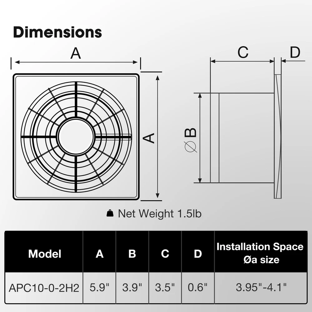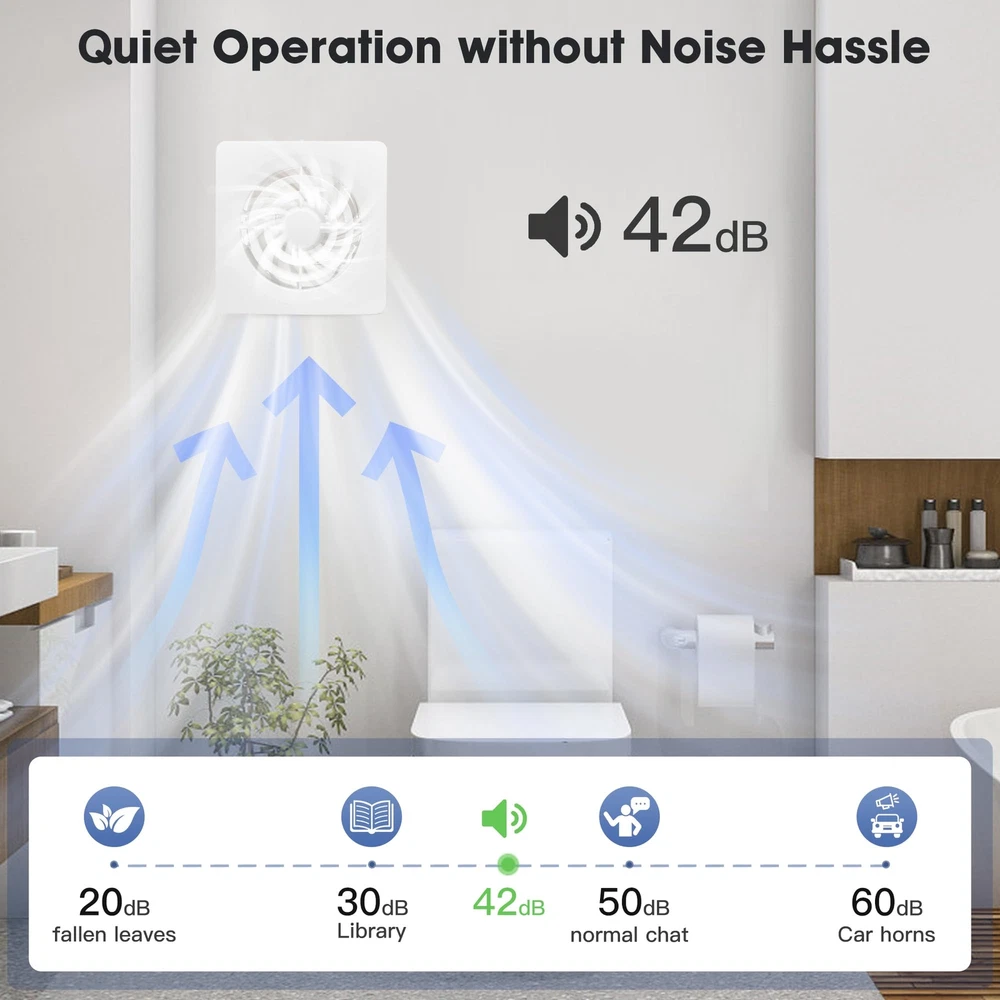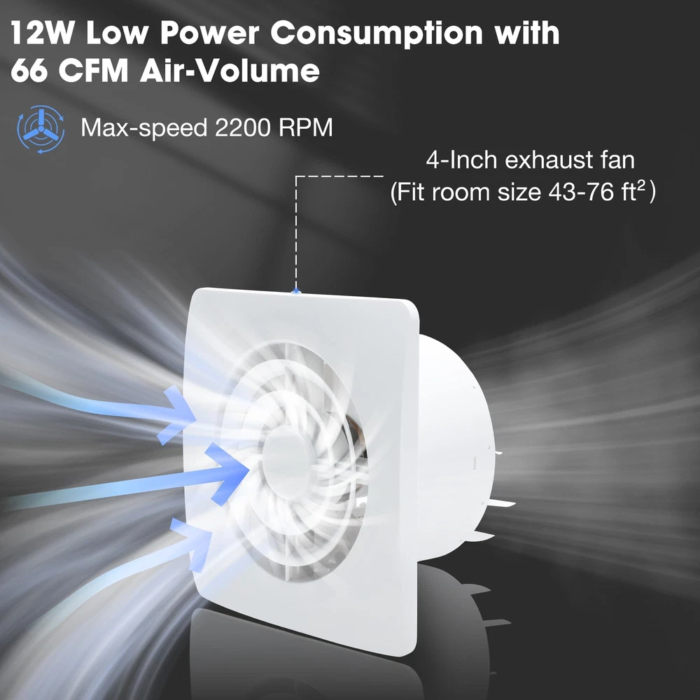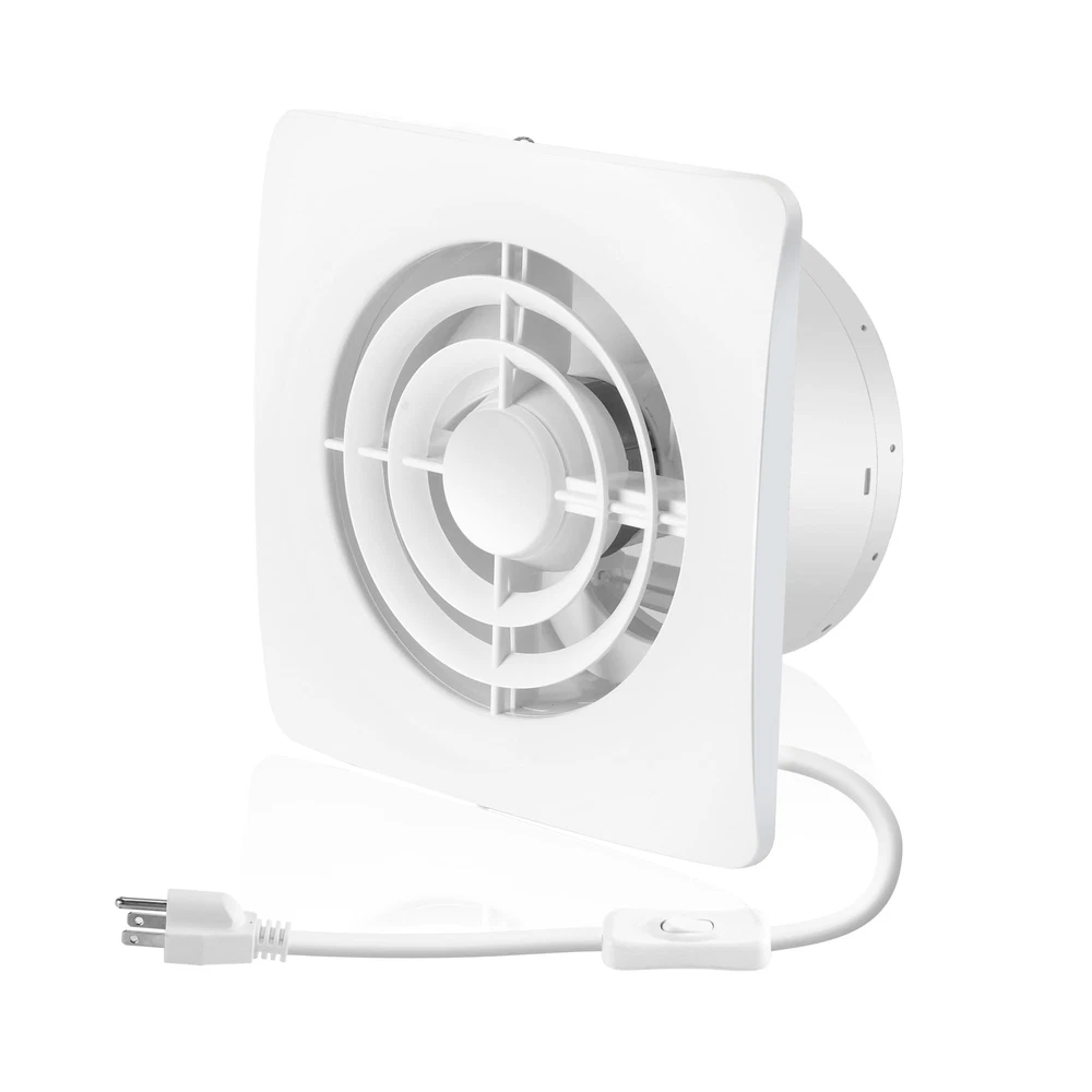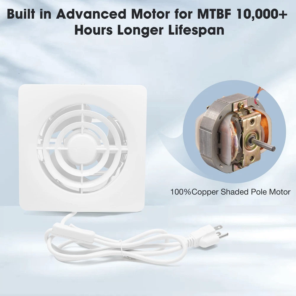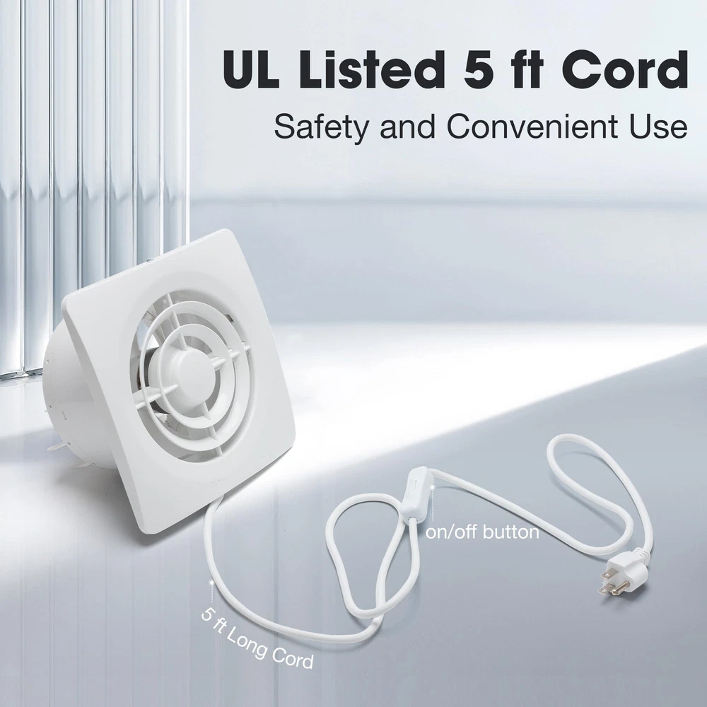 New Design: This small exhaust fan with newest modern front circular design. Multiple use for bathroom, kitchen, garage, basement air ventilation. 4" Exhaust Fan: The fan frame and blades use high quality ABS plastic material, thick and sturdy enough for long-term durable use. With 5ft long cord UL listed plug for safety and convenient use. Energy Saving: 12W lower consumption with 66CFM for small place air circulation. 42 dB Quiet Operation without noise hassle. Easy to Install: Cutting a 4-inch size hole for window quickly mount. With 1.5ft long cord on/off button for easy to use. Quality After-sales Service: Please feel free to us if you have any question or issues. We will reply back a solution in 24 hours.