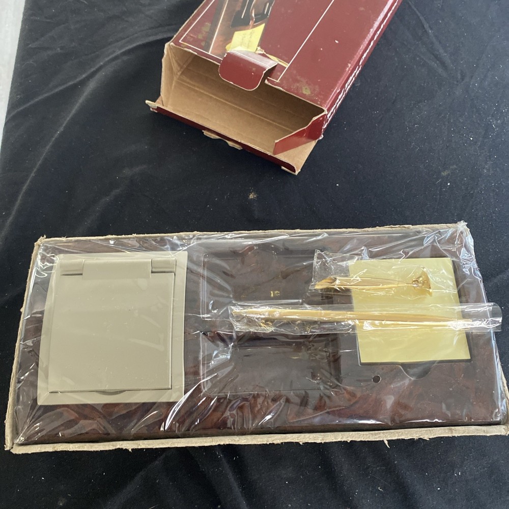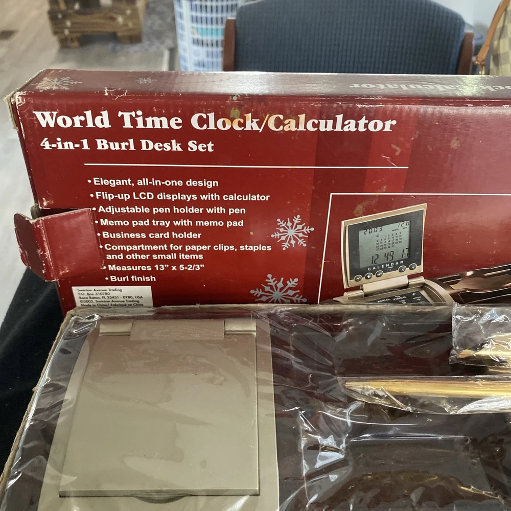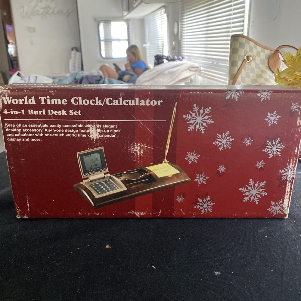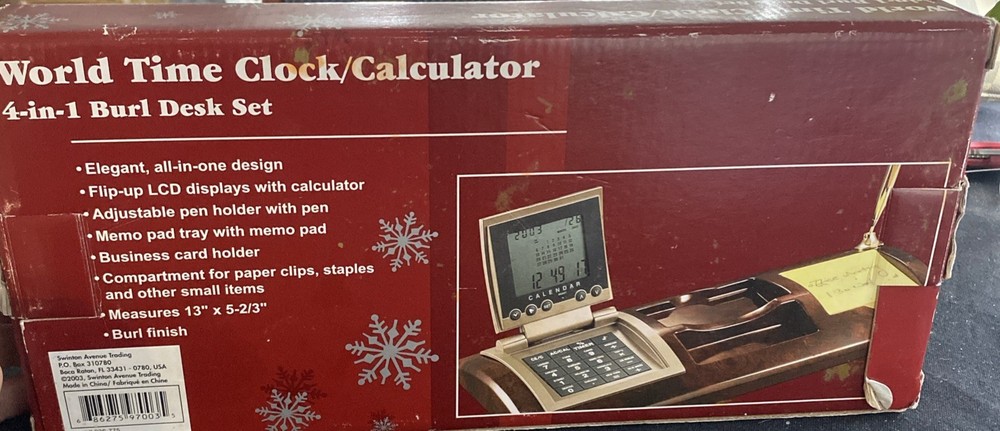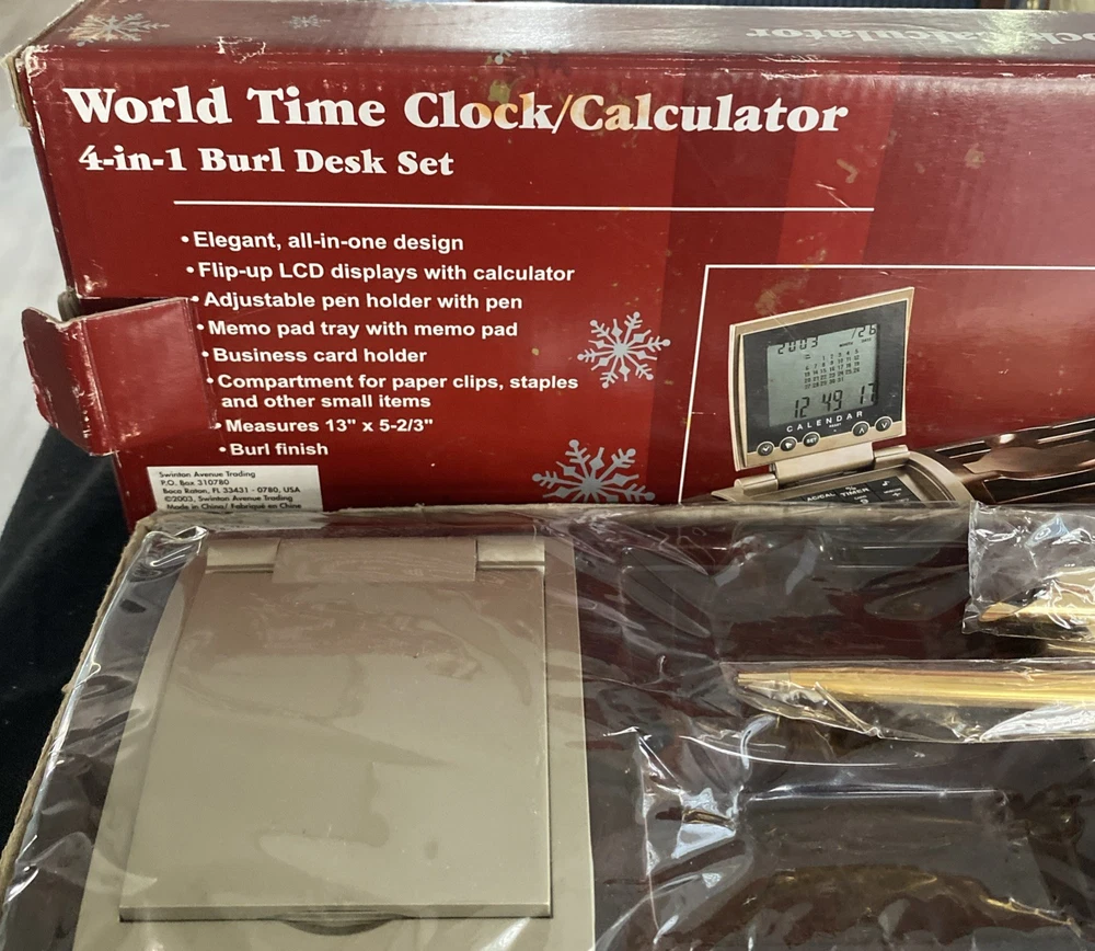 The World Time Clock/Calculator 4-in-1 Burl Desk Set 2003 is a vintage desktop item that features a unique burlwood look design. This collectible piece combines a clock, calculator, and world time display functions in one convenient desk set. Perfect for adding a touch of retro charm to any workspace, this item is both functional and decorative, making it a standout piece for collectors of desktop items or vintage decor.