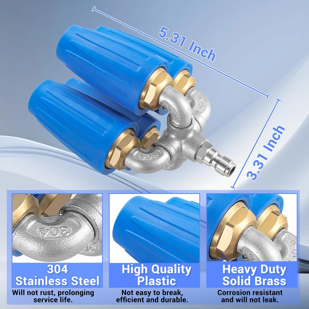 【Innovative Upgrade】Quadruple pressure washer turbo nozzle adds a row of dual turbo nozzle on the basis of the dual nozzle, and the spray range is four times that of the single rotating pressure washer nozzle, greatly increasing the spray range and water flow. With a powerful flow of water, 4-in-1 power washer turbo nozzle can quickly and effectively remove stubborn stains on a variety of surfaces, making it the ideal and reliable choice for your cleaning job. 【Wide Application】4-in-1 pressure washer turbo tip is very versatile, it is suitable for a variety of cleaning scenarios, can well meet your needs for fast and efficient cleaning. Pressure washing turbo nozzle can help you easily clean stubborn dirt on various surfaces, and you can use it to clean heavily polluted places such as cars, floors, driveways, walls, decks, etc. turbo nozzle pressure washer 4000 psi will be the best choice for home and commercial cleaning. 【Excellent Quality】Pressure washer rotating nozzle is made of 304 stainless steel, heavy duty solid brass and high quality plastic, which is not easy to rust, non-leakage, corrosion and drop resistance, and has a long service life. Each nozzle orifice size is 2.0, max working pressure is 4000 PSI, max working temperature is 140 ℉/60 ℃ and the gallons per minute is 8.0-12.0. You can rest assured to choose this turbine nozzle, Quadruple rotating turbo nozzle will be a good helper for your cleaning work. 【Easy Connection】Quadruple turbo tip for pressure washer uses a 1/4" quick connection, which can be easily and quickly connected to or disconnected from your pressure washer gun and wand. Turbo pressure washer nozzle is suitable for most pressure washer guns and wands, and provides a strong and steady flow of water to help you clean quickly and effectively. 【Product Quality】is a professional supplier of pressure washer products. We offer a diverse selection of reliable pressure washers designed to meet various needs. Our products are crafted with attention to performance and durability, ensuring they effectively handle your cleaning tasks.