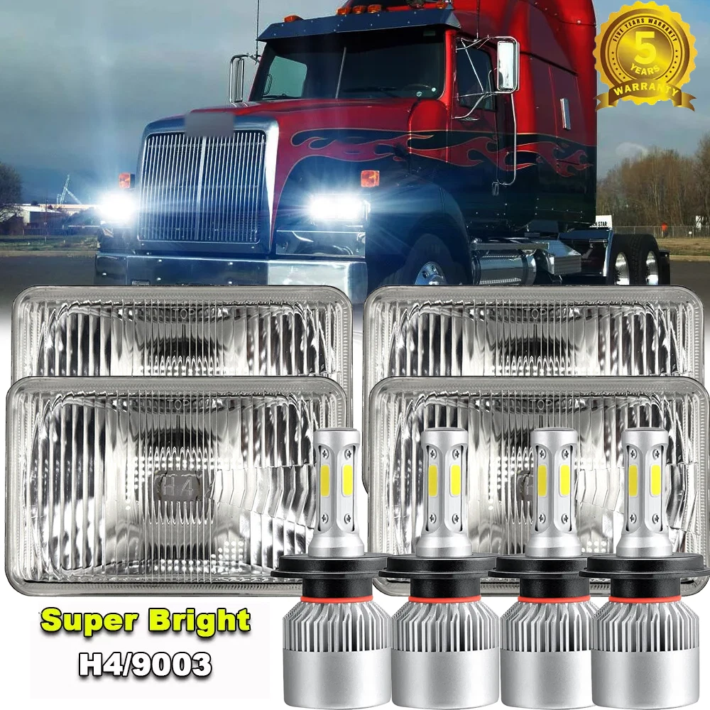 4"x6" Stock Style H4 Headlights w/ LED Bulbs - Set of 4 THESE ARE H4 CONVERSION HEADLIGHTS WITH A STOCK STYLE GLASS LENS AND METAL HOUSING! INCLUDES (4) HIGH INTENSITY LED H4 WHITE LIGHT BULBS! 4X6 INCH SQUARE HEADLIGHT - SET OF 4 Made from real glass and not cheap plastic Come with a H4 plug In-stock STOCK STYLE GLASS LENS / METAL BACKSIDE FITS STOCK BUCKETS,( Some models may require minor modifications) LOW BEAM AND HIGH BEAM BRIGHTER AND WHITER THAN STOCK LIGHTS BULBS ARE REMOVABLE AND REPLACEABLE INCLUDES 6500k WHITE LED LIGHT BULBS LOW AND HIGH BEAM FUNCTION PLUGS INTO FACTORY WIRING PLUGS DOT / SAE APPROVED THIS LISTING IS FOR A NEW SET OF 4 - 4x6" STOCK STYLE GLASS LENS / METAL BACKSIDE H4 CONVERSION HEADLIGHTS WITH WHITE LED LIGHT BULBS. THIS SET INCLUDES 2 HIGH BEAM & 2 HIGH / LOW BEAM HEADLIGHTS. THESE HAVE THE ORIGINAL SHAPED PRONGS ON THE BACK SO THEY WILL PLUG RIGHT INTO YOUR ORIGINAL WIRING HARNESS PLUGS. THESE ARE BRIGHTER AND WHITER THAN THE STOCK STYLE INCANDESCENT SEALED BEAM HEADLIGHTS. IN RARE CIRCUMSTANCES, WIRING MODIFICATION MAY BE REQUIRED. THESE ARE FOR ANY CAR OR TRUCK THAT HAS 4 SQUARE 4x6" HEADLIGHTS. DOT / SAE APPROVED. Description: Model: H4/HB2/9003 light Source Model: LED Chip, 2-sides leds, super bright Power: 200w/Set & 100w/bulb Lumen: 16000LM/Set & 8000LM/bulb Operating voltage: DC9-32V Beam Type: High beam & Low beam& Fog beam Material: Aluminum PCB and PA66+30% GF Plastic Beam Angle: 360° Color Temperature: 6500K Cool White Lifespan: over 50000h Working Temperature: -40-+80 Centigrade Waterproof rate: IP 68 Plug for this listing: H4/HB2/9003 Plug High Low Beam LED Headlight Bulbs Kit Connector Type: Plug and Play Application: LED Headlights Headlamp Lamp Bulbs High or Low Beam No Splicing of harnesses required for LED bulbs Uses 75% less power than Halogen or HID bulbs 3 times brighter than stock halogen bulbs OBC Error free operation Dramatically improves visibility at night INTERCHANGE: H4656 / H4651 / 4651 / 4652 THESE ARE GLASS AND WE WILL TAKE EXTRA CARE IN PACKAGING. Package Includes: 2 Pair of Headlight Housing (Pair Passenger and Driver Side) 2 Pair of H4 9003 LED Bulbs