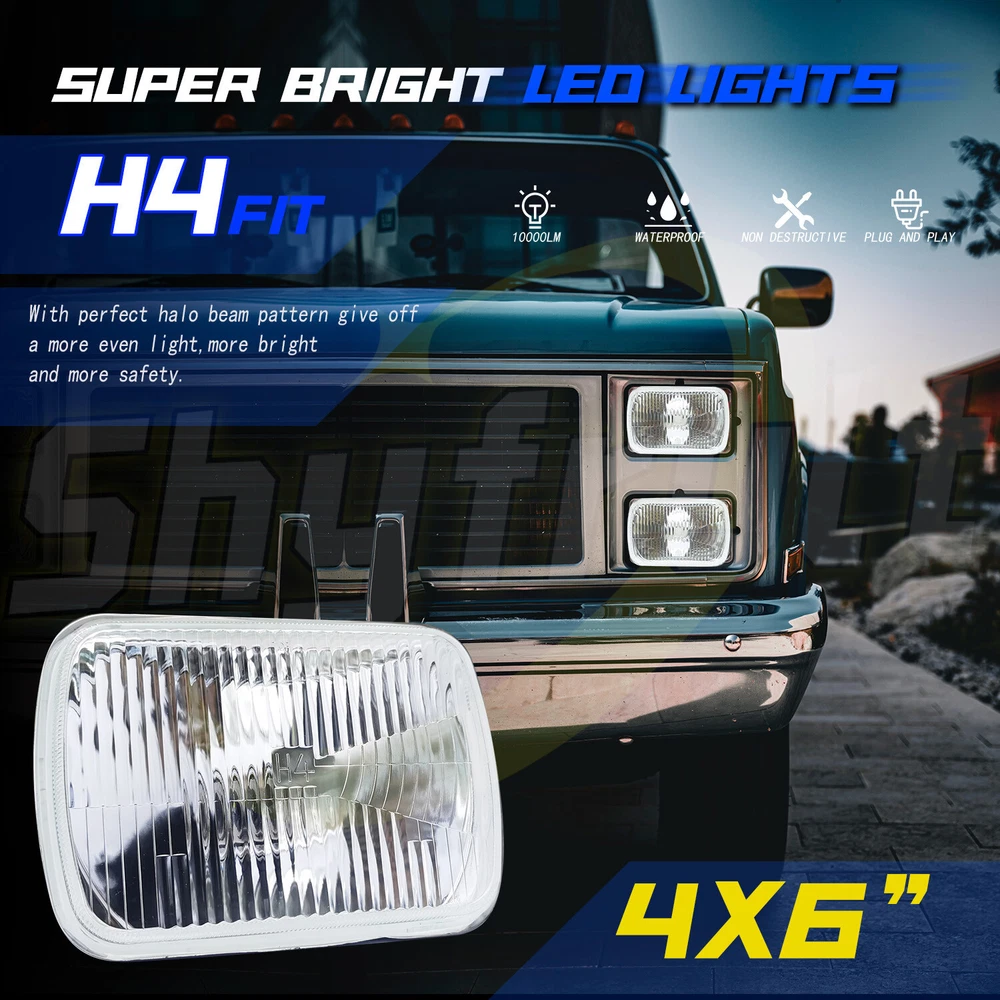 4"x6" Stock Style High Low Beam Headlights w/ LED Bulbs - Set of 4 THESE ARE LED CONVERSION HEADLIGHTS WITH A STOCK STYLE GLASS LENS AND METAL HOUSING! INCLUDES (4) HIGH INTENSITY LED WHITE LIGHT BULBS! 4X6 INCH SQUARE HEADLIGHT - SET OF 4 Made from real glass and not cheap plastic Come with 4 LED Bulbs In-stock Note: Without mounting bracket, some models may need mounting bracket! STOCK STYLE GLASS LENS / METAL BACKSIDE FITS STOCK BUCKETS( Some models may require minor modifications ) HIGH LOW BEAM BRIGHTER AND WHITER THAN STOCK LIGHTS BULBS ARE REMOVABLE AND REPLACEABLE INCLUDES 6000k WHITE LED LIGHT BULBS DOT / SAE APPROVED. THIS LISTING IS FOR A NEW SET OF 4 - 4x6" STOCK STYLE GLASS LENS / METAL BACKSIDE LED CONVERSION HEADLIGHTS WITH WHITE LED LIGHT BULBS. THIS SET INCLUDES 4 HIGH LOW BEAM HEADLIGHTS. THESE ARE BRIGHTER AND WHITER THAN THE STOCK STYLE INCANDESCENT SEALED BEAM HEADLIGHTS. IN RARE CIRCUMSTANCES, WIRING MODIFICATION MAY BE REQUIRED. Description: Model: LED Bulb light Source Model: LED Chip, 2-sides leds, super bright Power: 400w/Set & 100w/bulb Lumen: 40000LM/Set & 10000LM/bulb Operating voltage: DC 9-32V ( Fit 12V,24V Vehicle ) Beam Type: High Low Beam Material: Aluminum PCB and PA66+30% GF Plastic Beam Angle: 360° Color Temperature: 6000K White Lifespan: over 50000h Working Temperature: -40-+80 Centigrade Waterproof rate: IP 68 Connector Type: Plug and Play Application: LED Headlights Headlamp Lamp Bulbs Low Beam Package Includes: 4PCS of Headlight Housing (Pair Passenger and Driver Side) 4PCS of LED Bulbs New boxes and old boxes are sent randomly!!! After service Notification: If you are satisfied with our product and service please leave us a positive feedback,if there is any problem when you received the package,please feel free to contact us,we will be definitely give you a satisfying solution,when you choose the return reason .please choose the reason"i don't like it". by this option we will accept your return immediately and provide return label for full refund. the others reason to return will take both of us many troubles to handle. If you have any questions, please feel free to contact us, we are happy to answer them for you. Hope you will have a good shopping experience~