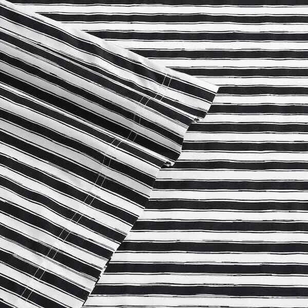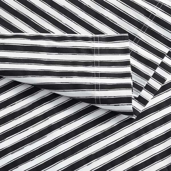 The Betsey Johnson sketchy stripe sheeting features a play on classic striping in a whimsical Betsey manner combining a bold black with white. Add some fun with Betsey's cotton percale sheet set. Available in an array of additional designs, these 200 thread count sheets will add an extra layer that is cool to the touch. Breathable and lightweight, this cotton construction is perfect for long-lasting comfort. Each sheet set includes one flat sheet, one fitted sheet, and two pillowcases (one for twin and twinxl sizes). The fully elasticized fitted sheet prevents slipping from the mattress and ensures the perfect fit. This set fits mattresses up to 18" deep (16" deep for twin/twinxl size and 17" deep for full size). This set is machine washable for easy care.