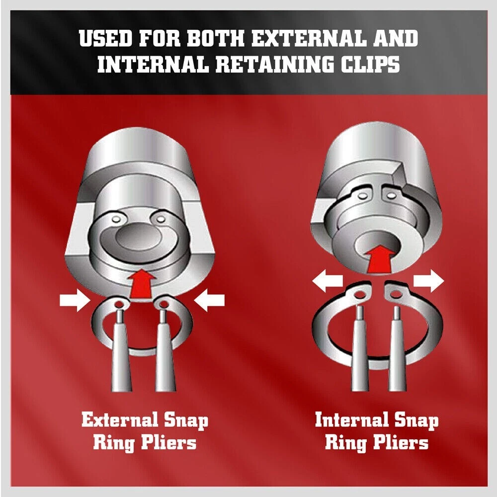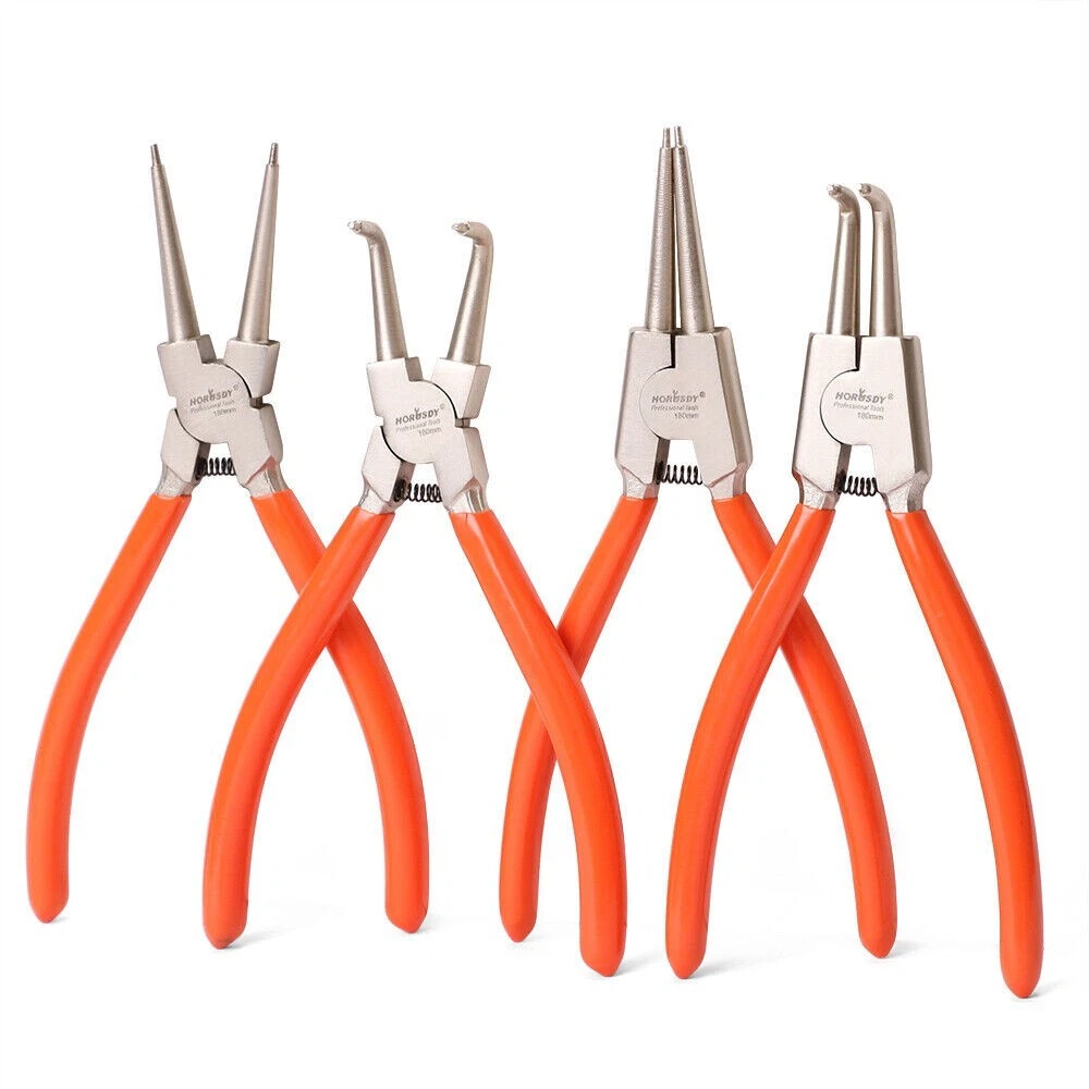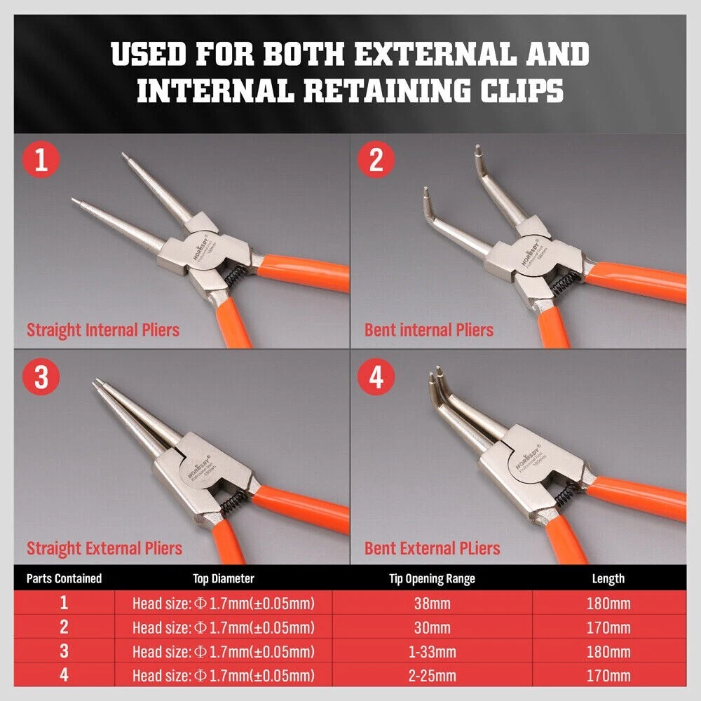 Premium Construction - All the tools are made from hardened CR-V steel with a fully polished, electrophoretic coated, silver finish, making them extremely durable and long-lasting. 4 Piece 7-inch Snap Ring Pliers - Our 7-inch Snap Ring Plier Set includes External and Internal Straight Jaw Snap Ring Pliers, External and Internal Bent Jaw Snap Ring Pliers, and compact storage pouch. The tip diameter is 5/64 inches. The external range is 29/32'' -1-25/32'', while the internal range is 29/32'' -1-25/32''. Highly Durable, Secure and Safe to Use - The snap ring pliers feature spring-loaded, bi-material ergonomic handles, which provide overall control and make them more comfortable and secure than others. Ideal for Multi-applications - Our snap pliers set is ideal for removing and installing externally placed retaining rings. It also provides instant holding power and is easy to reposition during assembly, fastening, and gluing work. Reliable Organization - It comes with a zipper, 600D polyester pouch with a cover and special pockets, allowing easy storage and added flexibility. Just pack up your tools and carry them anywhere with you when needed.