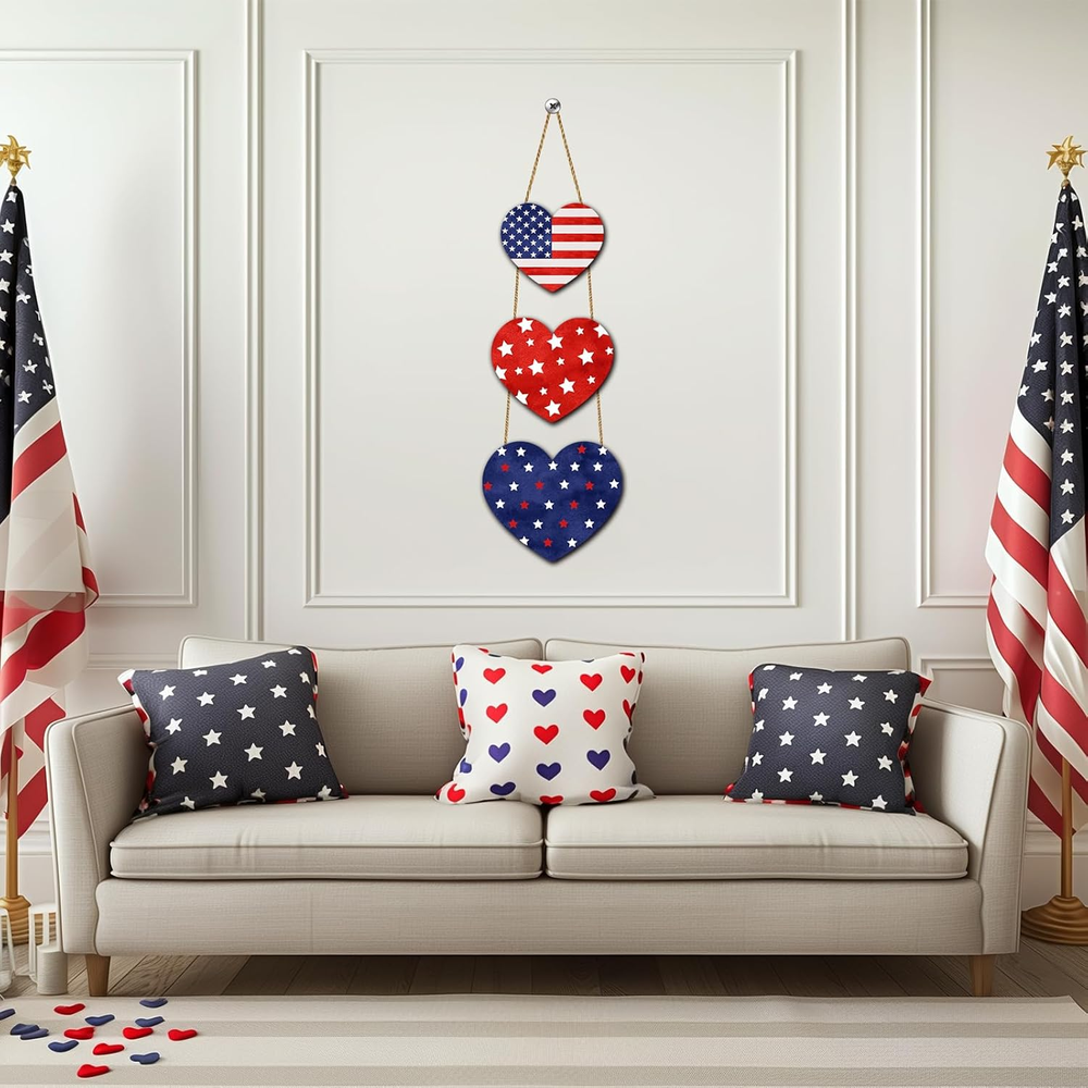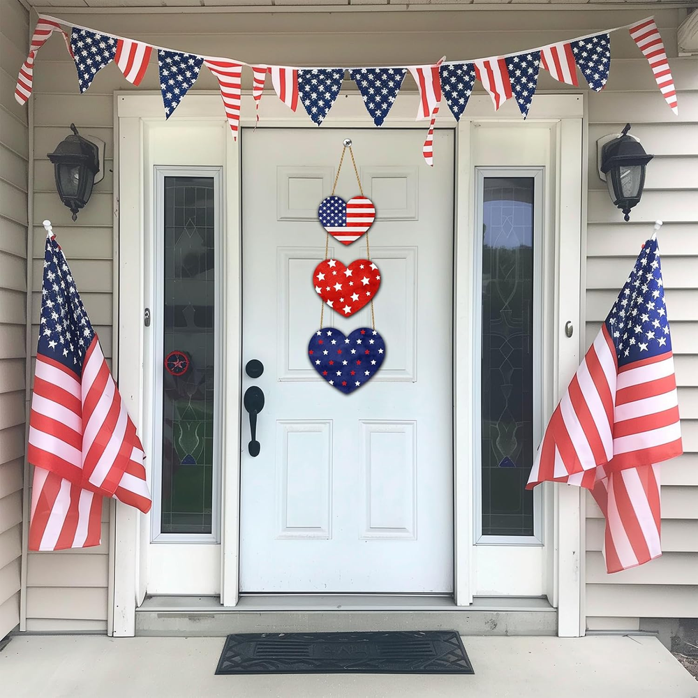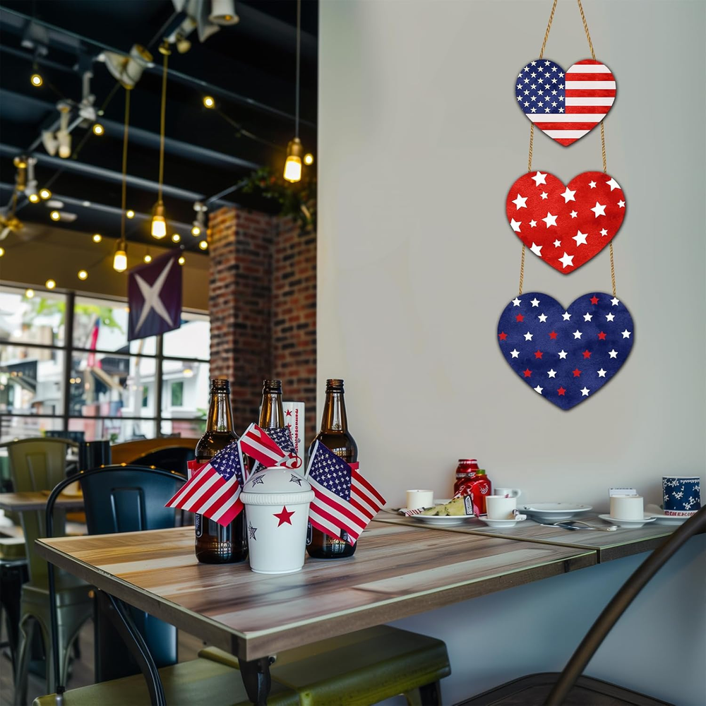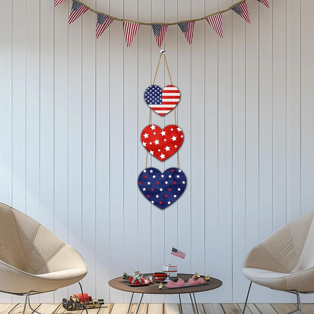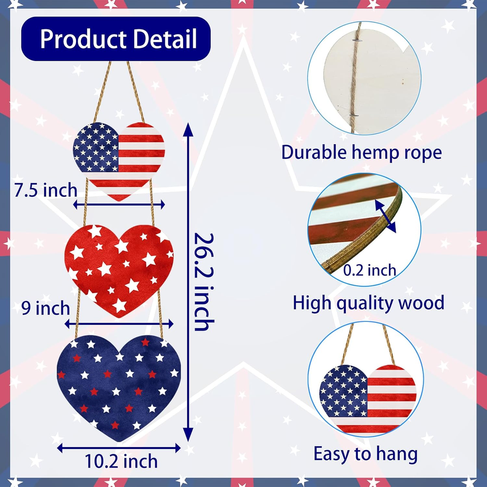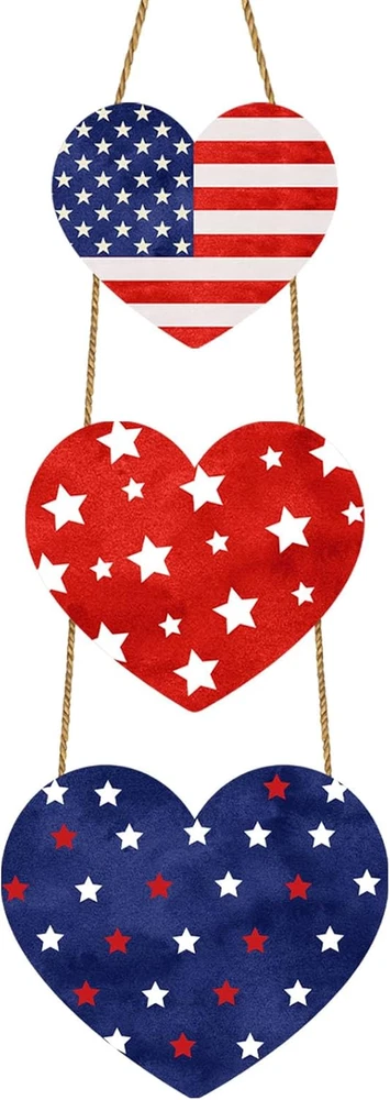 Independence Day Hanging Sign: The package contains 1 piece 4th of July wooden hanging sign, which is composed of 3 different sizes of hearts, with a certain sense of hierarchy, the American flag in the shape of a heart, red and blue hearts, which is very suitable for Independence Day decoration, decorate your home, enhance the festive atmosphere, and celebrate the arrival of Independence Day Suitable size: The Independence Day hanging sign is the right size, the size is large enough to be perfect for decorating on the door or wall, the beautiful appearance attracts people's attention, it can be folded up when not in use without taking up too much space, and it is equipped with hemp rope for easy hanging High-quality material: Our Independence Day hanging signs are made of high-quality wood material, reliable quality, durable, not easy to break, clear printing, not easy to fade, and can be stored and used for a long time Widely Used: Independence Day hanging signs are suitable for hanging on the front door, porch or wall, and can be used on the 4th of July Independence Day, Memorial Day and other scenes, to decorate the living room, bedroom, dining room, office or hallway to celebrate the arrival of the holiday and express your patriotic feelings Exquisite Gift: Beautiful 4th of July heart-shaped door decorations can be given to your family and friends, beautiful appearance, is a good choice as an Independence Day gift, use it to decorate your home, create a wonderful holiday atmosphere and spend this happy holiday Product Description 4th of july door decorations This heart-shaped patriotic door hanger incorporates patriotic elements and echoes the theme of Independence Day, with American flag-style heart and classic red and blue hearts decor, and the exquisite decoration adds a festive atmosphere to your space. Widely Used You can hang our 4th of July door decorations on your front door, porch, living room, dining room, office, fireplace, bedroom, cafe and more to add a festive touch to your home on Independence Day. Easy to use The 4th of July door hanger with hemp rope is sturdy and durable, so you can simply hang it on the door or wall to welcome the arrival of Independence Day and spend this happy holiday. 4th of July decorations for home This beautiful heart shaped patriotic front door decoration is the perfect home decor that you can hang on your door to add a festive vibe to your home. Perfect for holiday decorations and gifts Independence Day is here and it's time to decorate your home with it. This patriotic door hanger will be a good choice for your Independence Day decorations. Perfect for family and friends as a holiday gift.