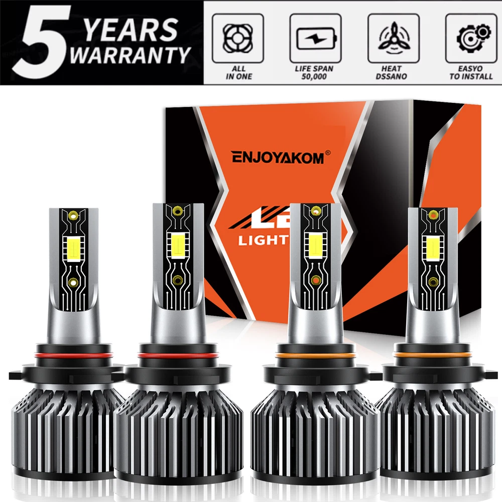 Superseded Part Number: Replacement Halogen Xenon Led Light Bulbs Other Part Number: HB3 high beam + HB4 low beam Size: the same as the car original light Fit 1: Car, Motorcycle, Motorbike, van, truck, pickup, SUV, vehicles Number of Bulbs: 4 Application 1: For Headlight High Low Beam/led bulbs car headlights Lighting Technology: LED Country/Region of Manufacture: United States Interchange Part Number: 9005 High beam + 9006 Low beam More LED Kit We Have 2: H4/9003/HB2 9004/HB1 9007/HB5 9008/H13 D1/D1S D2/D2S D3S D4S UPC: 868715815759 Manufacturer Part Number: 9005+9006 Type: Headlight Kit More LED Kit We Have 3: 9005/9145/H10/9140 5202/2504 880/892/893/899 881/898/889/894 H3 Color Temperature: 6500K Suitable For: High Beam, Headlight, Low Beam More LED Kit We Have 1: 9005 9006 HB3 HB4 H11/H8/H9/H16 9012/HIR2 H1 H7 Sealed Housing: IP68, Shockproof, Dustproof & Waterproof Universal Fitment: Yes Performance Part: Yes Light Color: Cold White Model: LED Headlight Conversion Kit Fit 2: Easy Installation, Heat Resistant, Higher brightness/Super Bright White Lighting Type: Specialty Head Light Bulb Chips Type: CSP LED Chips, Super Bright Bulb Fitment Code: 9005/HB3 + 9006/HB4 Bulb Life Hours: Up to 50000 Hours Feature 2: light bulbs & leds/Light Bulbs Combo Kit OE/OEM Part Number: 6500K LED Headlights EAN: Does not apply Voltage: 9V-36V Vintage Part: Yes To Fit: Headlight Lumens: 26000lm gtin13: Does not apply Manufacturer Warranty: 5 Year Features: CAN bus Compatible, road Legal, Rust-Resistant Wattage: 150W Placement on Vehicle: Front, Left, Right Material: Aviation 6063 aluminum profile Fitment Type: Direct Replacement Other Available Type: Foglight Kit Ballast Included: Yes Application 2: led headlights for car &led bulb light bulbs MPN: ENJOYAKOM-Headlamp Bulb Brand: ENJOYAKOM