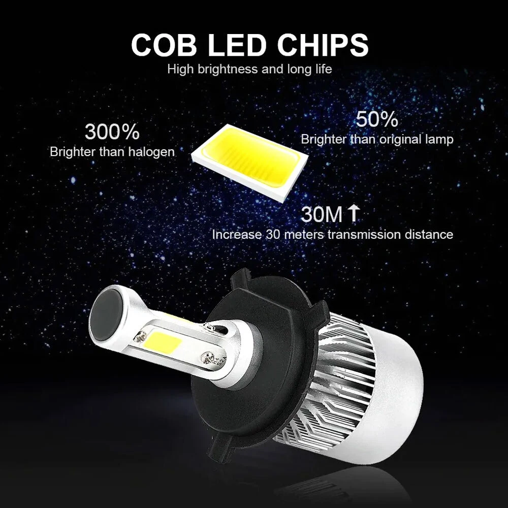 Description: Model: H4/HB2/9003 light Source Model: LED Chip, 2-sides leds, super bright Power: 200w/Set & 100w/bulb Lumen: 12000LM/Set & 6000LM/bulb Operating voltage: DC9-32V Beam Type: High beam & Low beam& Fog beam Material: Aluminum PCB and PA66+30% GF Plastic Beam Angle: 360° Color Temperature: 6000K-6500K Cool White Lifespan: over 50000h Working Temperature: -40-+80 Centigrade Waterproof rate: IP 68 Plug for this listing: H4/HB2/9003 Plug High Low Beam LED Headlight Bulbs Kit Connector Type: Plug and Play Application: LED Headlights Headlamp Lamp Bulbs High or Low Beam No Splicing of harnesses required for LED bulbs Uses 75% less power than Halogen or HID bulbs 3 times brighter than stock halogen bulbs OBC Error free operation Dramatically improves visibility at night INTERCHANGE: H4656 / H4651 / 4651 / 4652 THESE ARE GLASS AND WE WILL TAKE EXTRA CARE IN PACKAGING. Package Includes: 2 Pair of Headlight Housing (Pair Passenger and Driver Side) 2 Pair of H4 9003 LED Bulbs