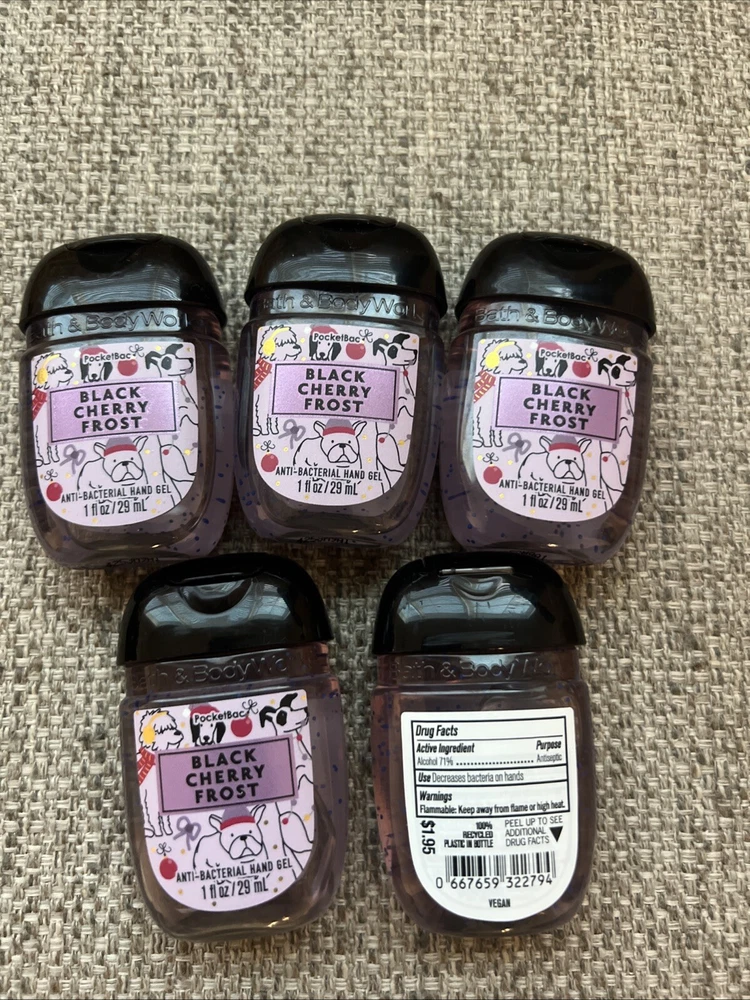 5 BATH BODY WORKS BLACK CHERRY FROST POCKETBAC ANTI-BACTERIAL HAND GEL SANITIZER.