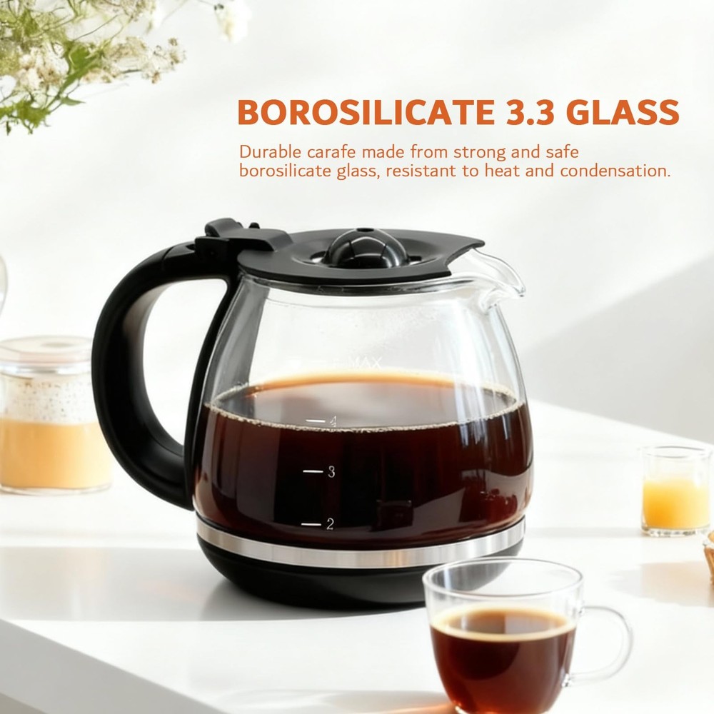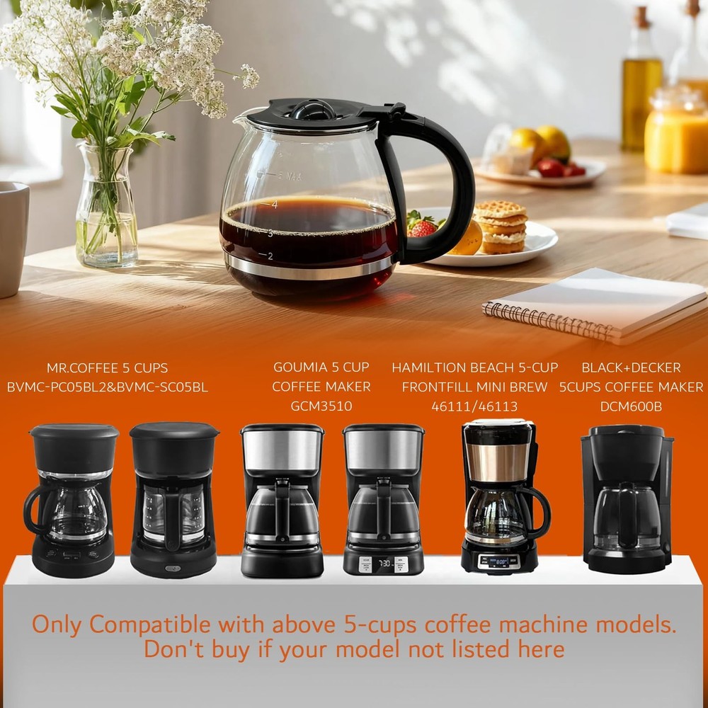 Tired of constantly brewing fresh pots of coffee for your family or office? This 5 cup coffee pot replacement is the perfect solution. Designed for durability and ease of use, it allows you to effortlessly refill your coffee maker without the hassle of purchasing an entirely new unit. Crafted from high-quality materials, this replacement pot is built to withstand the rigors of daily use. Its ergonomic handle ensures a secure grip, while the heat-resistant glass construction keeps your coffee piping hot until the last drop. With its sleek design and compatibility with most major coffee maker brands, this 5 cup coffee pot replacement seamlessly integrates into your kitchen or breakroom setup. Upgrade your coffee experience today with this affordable and practical solution. Replacement: This is a 5 cup coffee pot replacement designed to Compatible with Mr Coffee BVMC-PC05BL2, BVMC-SC05BL . Compatible for Goumia 5cups coffee machine. Compatible For Hamitlon Beach 5 cup coffee maker. Compatible for Black Decker 5 cup coffee maker DCM600B Compatible for Amazon Basics 5 cup coffee maker Capacity: Holds up to 5 cups of coffee, perfect for personal or small household use. Material: Constructed from durable materials to withstand regular use and heat. Compatibility: Check manufacturer specifications to ensure compatibility with your coffee maker. Easy Installation: Simple to replace the old coffee pot with this new one.