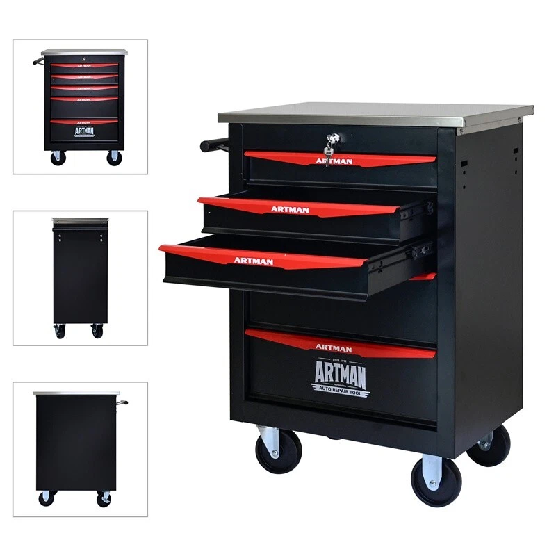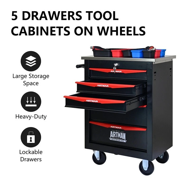 Features and Details: 5 Drawers mutifunctional tool cart with wheels. The tool box is also lockable and can be used as a removable, attachable and mobile case The opening and closing of the drawers of the tool cabinet is very gentle thanks to the ball-bearing drawers The robust and powder-coated steel construction is used for high wear resistance. This assembly trolley has 4 steering wheels, 2 of which with parking brakes, so you can move the trolley freely in the garage, but also stop in one place This is a set of cabinets, can use a round hook at the bottom of the table to connect another tool car, thus forming a combination. Specification: Color: Black+Red Material:Cold Rolled Steel Surface Finish :Powder Coating Casters:4" Casters (2PCS with brake and 2PCS without brake) Product Size (with wheels and countertops):22.28*13.58*30.71INCH Product Size (without wheels and countertops):20.63*12.99*25.16INCH Weight (lbs.): 52.03