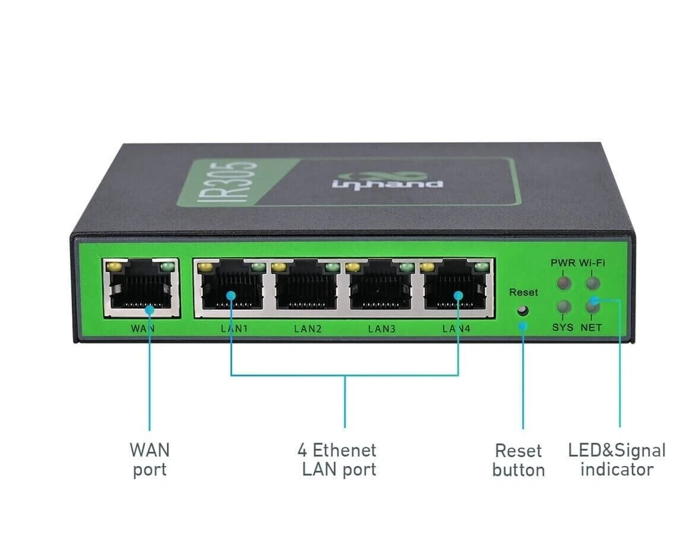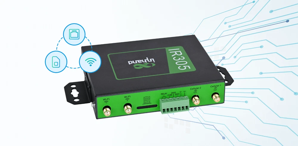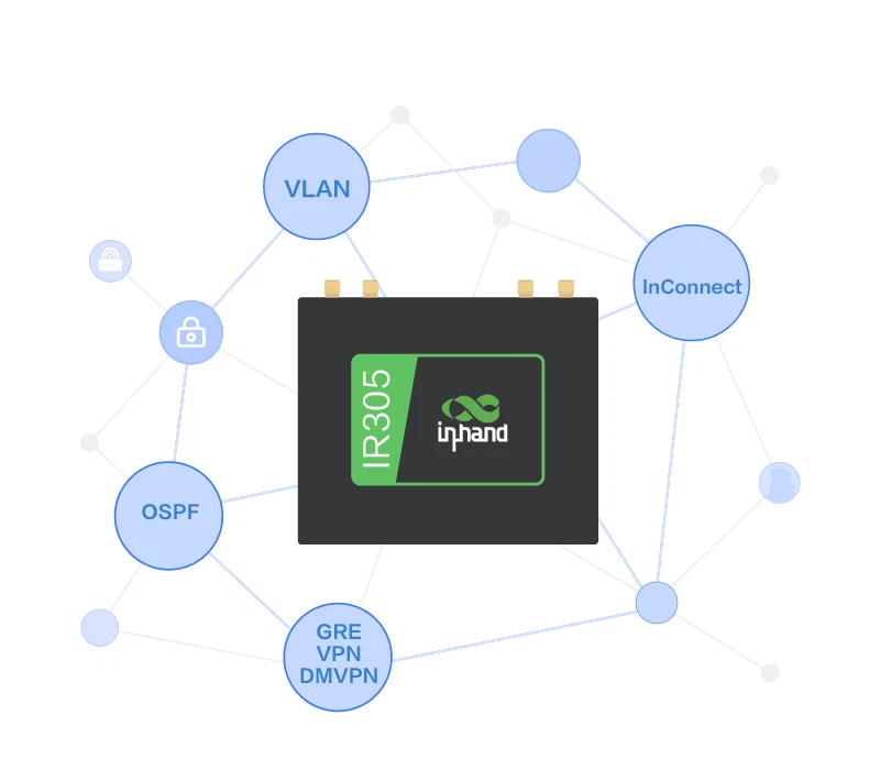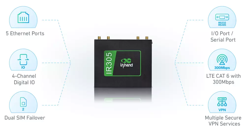 THIS IS LTE CAT 4 + I/O port Wi-Fi : IEEE 802.11b/g/n, Max 300Mbps LAN : 10/100Mbps fast Ethernet port LTE CAT 4 Maximum upload and download rate: 50Mbps/150Mbps Package List: 1Pc x Device 1Pc x Power Supply 1Pc x Ethernet Cable 2Pcs x Wi-Fi Antenna 2Pcs x 4G Antenna (North America) About this item The InRouter305 (IR305) is a dual-SIM cellular router with 5 Ethernet ports, and serial ports, integrated 4G LTE (CAT4) and WiFi, and VPN technologies to provide easy, reliable, and secure Internet connectivity. It supports two operation modes, 4G Router mode and Wireless Router mode to provide uninterrupted multiple network access capabilities. Multiple Networking Functions IR305 is suitable for complex and large-scale network applications with its multiple networking functions, such as virtual network VLAN, static routing, OSPF, GRE, VPN DMVPN, etc. Continuity and Reliability Network Connection With Dual SIM failover and link backup, IR305 provides a reliable network connection for users. It can also provide high-quality network services by dual-SIM failover, VRRP, multi-layer auto detection and recovery of links failures. Fully Industrial Design Metal shell, IP30 protection. EMC level 3. Wide operating temperature: -20℃~70℃. IR305 is compact, which effectively reduces the space of installation and deployment. It supports DIN rail mounting, lug mounting and wall mounting, which is suitable for a variety of IoT deployment sites. Device Manager-Free Remote Centralized Management Platform IR305 is compatible with InHand Device Manager, a free centralized cloud management platform, allowing to remotely configure and monitor the status and parameters of IoT devices by SNMP V1/V2c/v3 protocol. Compact Industrial Router InRouter305 InHand launches IR305 series products combined with DeviceManager cloud management service. It is suitable for various industries, making your digital IoT more convenient, more economical and more efficient! IR305 has a variety of network access capabilities, suitable for different networks, and provides different network speeds for different business needs, providing convenient and efficient network access services for IoT devices. Convenient and Efficient Access to the Network Anytime, Anywhere ● 4G cellular access, LTE CAT4 standard, compatible with 2G/3G network ● Wired/ADSL access ● WiFi wireless access ● Optional IO port or serial port, depending on your application Build a Simple and Secure Wireless Wi-Fi Network ● 802.11 a/b/g/n ● 2.4G Wi-Fi ● 2*2 MIMO, up to 300Mbps ● 74 accessible terminals ● Support AP/STA mode ● Support multiple security authentication methods and encryption algorithms: TKIP and CCMP Quickly Build a Complete Network ● Virtual network can be divided: VLAN ● Rich routing functions: static routing, OSPF, etc ● Full networking functions: GRE, VPN, DMVPN, etc ● Remote connection to the network: InConnect InRouter305 Software Specifications Network Access APN, VPDN Acess Authentication CHAP/PAP Network Type GSM/GPRS/EDGE, UMTS/HSPA+/EVDO/TD-SCDMA/, TDD LTE/FDD LTE (Please refer to the Ordering Guide for frequencies). LAN Protocol ARP WAN Protocol PPP, PPPoE, DHCP IP Application Ping, Trace, DHCP Server, DHCP Relay, DHCP Client, DNS relay, DDNS, Telnet IP Routing Static routing, OSPF dynamic routing NAT Supports network address translation Dual SIM Failover Supports dual SIM failover Link Detection Sends heartbeat packets to detect, and redials when disconnected WLAN Protocol IEEE 802.11b/g/n Mode AP, Client, WDS modes Rate Up to 300Mbps Transmission Distance 80 meters by line of sight (Actual transmission distance depends on environment of the site) QOS Management Bandwidth, IP speed limit Traffic Management Supports data traffic threshold, traffic statistics and traffic alarm InRouter305 Hardware Specifications CPU 580MHz RAM 128MB DDR2 FLASH 64MB SPI Ethernet Port 5*10/100Mbps fast Ethernet port, WAN/LAN/VLAN port 1.5KV network isolation transformer protection Power Supply DC9-36V, over-current protectiob, anti-reverse connection, 2*PIN industrial terminal block I/O ( *Optional ) Support 4*IO (DO or DI can be configured) Serial port ( *Optional ) None Reset Button Pinhole reset button SIM Card Drawer-type slot *1, support dual-NANO SIM Wi-Fi (Optional) IEEE 802.11b/g/n, 300Mbps Antenna Connector 4G:SMA x 1; Wi-Fi:RP-SMA x 1 Note: North America models: 2* SMA 4G antenna connectors. Ground Terminal Supports Dimensions 120x99x25(mm) Weight 354g Installation Method Panel mounting, rail mounting Certificate CE, FCC, CB, E-MARK, PTCRB, IC, VZW, RCM, AT&T IR302-FQ38-WLAN IR305-FF38-WLAN-S IR305-FF38-WLAN IR305-FQ39-WLAN-S IR305-FQ39-WLAN Cellular network CAT 4 CAT 4 CAT 4 CAT 6 CAT 6 Wi-Fi 2.4GHz(b/g/n) 2.4GHz(b/g/n) 2.4GHz(b/g/n) 2.4GHz(b/g/n) 2.4GHz(b/g/n) Ethernet Port 2*10/100 5*10/100 5*10/100 5*10/100 5*10/100 Serial Port none ✓ none ✓ DI/DO port ✓ ✓ none ✓ Maximum Downstream/upstream Data Transfer Rate 150Mbps/50Mbps 150Mbps/50Mbps 150Mbps/50Mbps 300Mbps/50Mbps 300Mbps/50Mbps Work band LTE CAT4, FDD: B2/ B4/ B5/ B12/ B13/ B14/ B66/ B71, WCDMA: B2/ B4/ B5 LTE CAT4, FDD: B2/ B4/ B5/ B12/ B13/ B14/ B66/ B71, WCDMA: B2/ B4/ B5 LTE CAT4, FDD: B2/ B4/ B5/ B12/ B13/ B14/ B66/ B71, WCDMA: B2/ B4/ B5 North America, T-Mobile, VzW, AT&T, LTE CAT6 FDD:B2/B4/B5/B7/B12/B13/B25/B26/B29/B30/B66 WCDMA:B2/B4/B5 North America, T-Mobile, VzW, AT&T, LTE CAT6 FDD:B2/B4/B5/B7/B12/B13/B25/B26/B29/B30/B66 WCDMA:B2/B4/B5