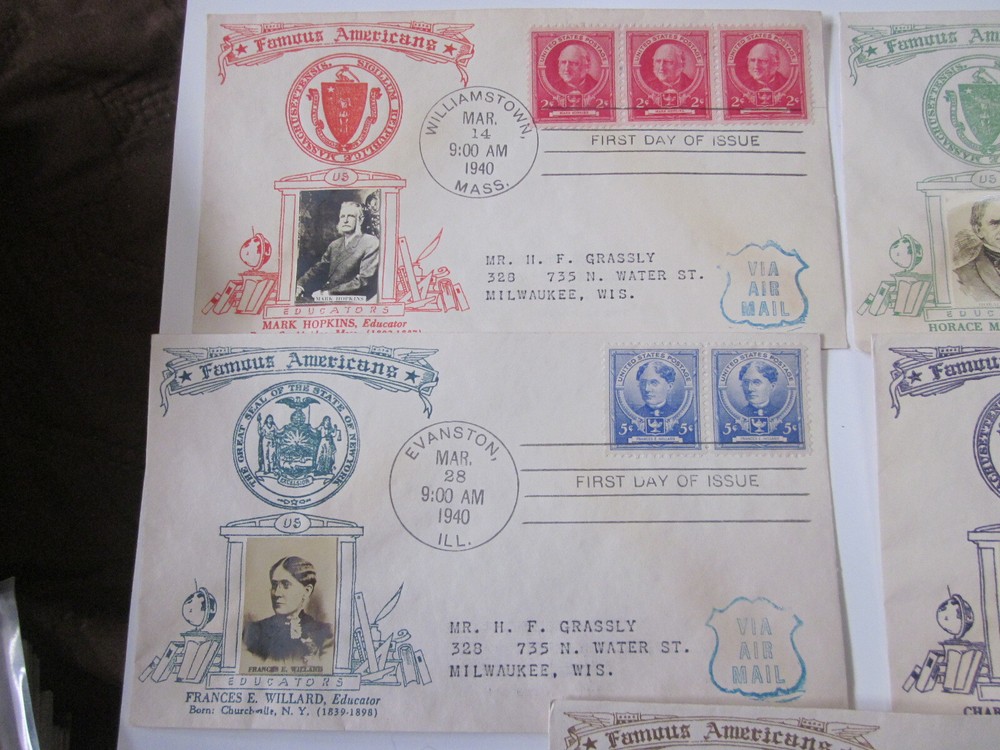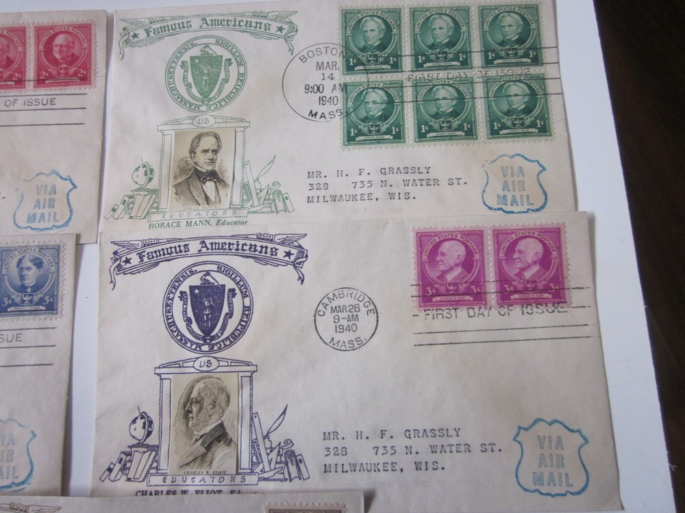 This set of five First Day Covers (FDCs) features American educators and historical figures, each with a unique cachet showcasing a photograph of the esteemed person. The stamps were issued between 1931-1940 and were sent using airmail. The FDCs are of used quality and are ungraded, but their historical significance is undeniable. These stamps were sent from the United States and feature a first-day cancellation. The certification of the stamps is uncertified. Don't miss your chance to own a piece of American history!