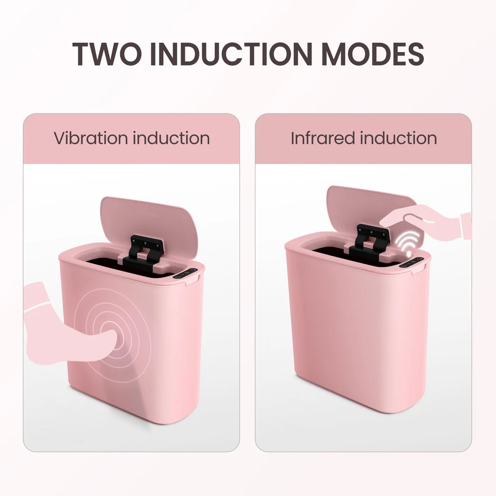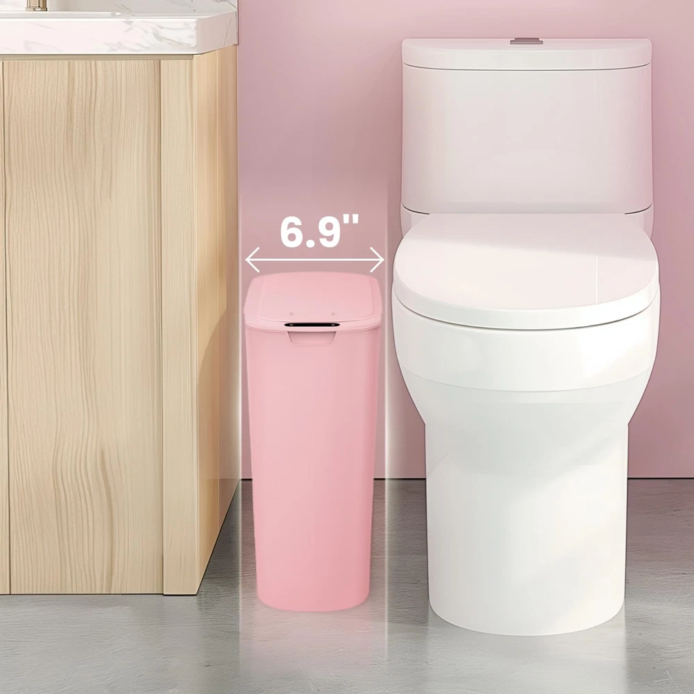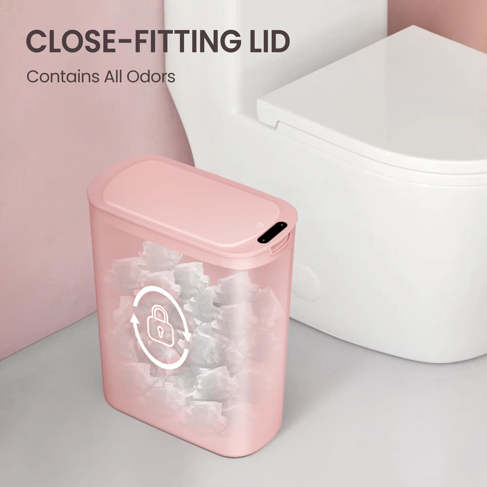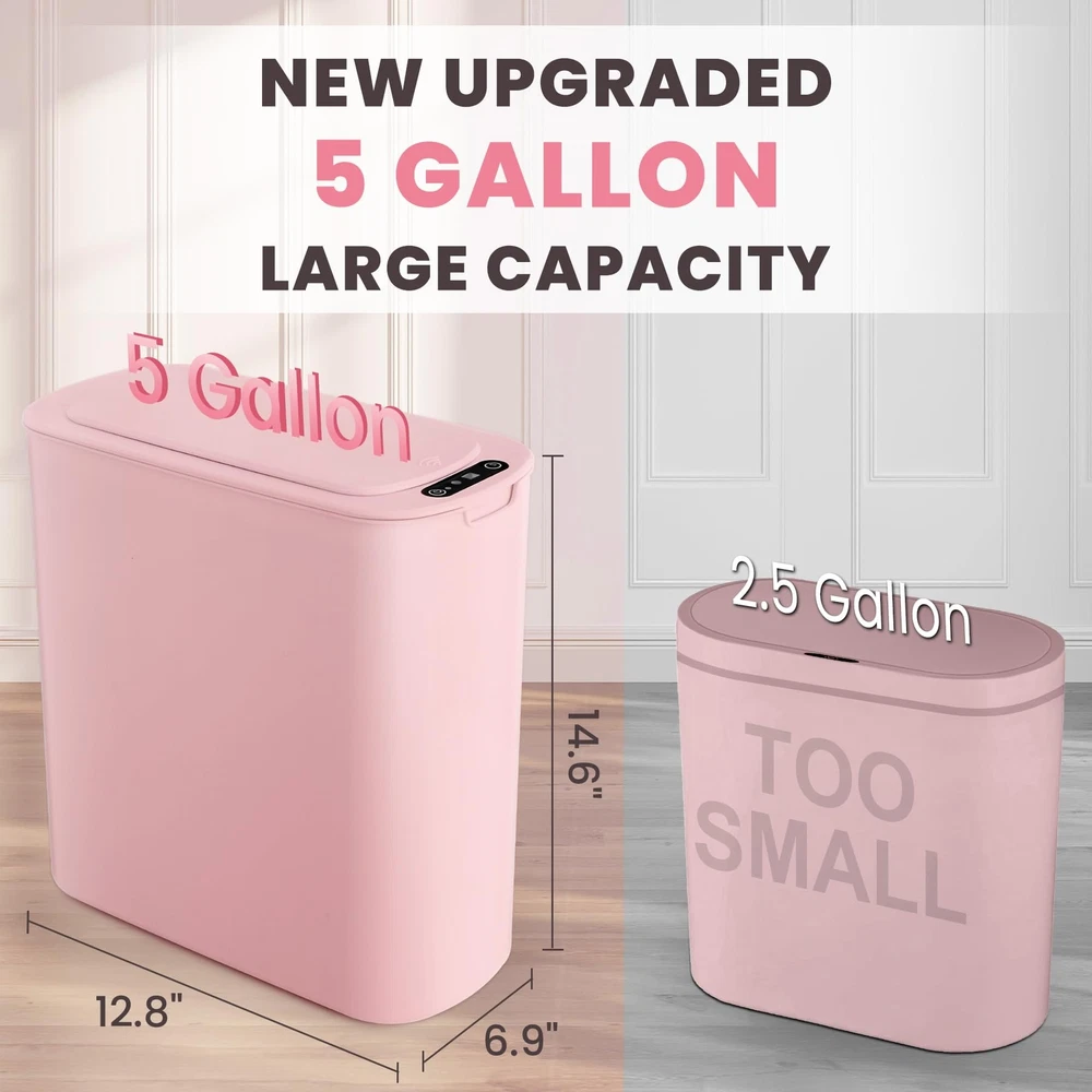 Pink Room Decor: With a cute appearance, the pink trash can is attractive and decorative while being practical. Touchless Trash Can: Utilizing advanced technology, the pink garbage can's lid opens when your hand or any object is detected in the sensing area, eliminating the need for direct . Particularly beneficial for individuals with mobility challenges, the automatic functionality surpasses foot pedal options. Requires 2 AA batteries (not included) Compact Design & Large Capacity: Designed for tight spaces, this slim 5 gallons can fits bathrooms, living rooms, bedroom and more. Efficiently manages daily waste, maintaining tidiness Countdown Light: If your hand stays in the sensing area, the green light is always on and the lid remains open. When your hand leaves, the green light starts flashing and the lid closes automatically after 5 seconds Excellent Sealing Ability: The snug lid seals tightly, containing odors and maintaining cleanliness, offering a fresh living space Garbage Bag Fix Ring: Removable inner fix ring holds garbage bag in place and prevents bag from overhanging the pink trashcan, resulting in a neat and clean appearance