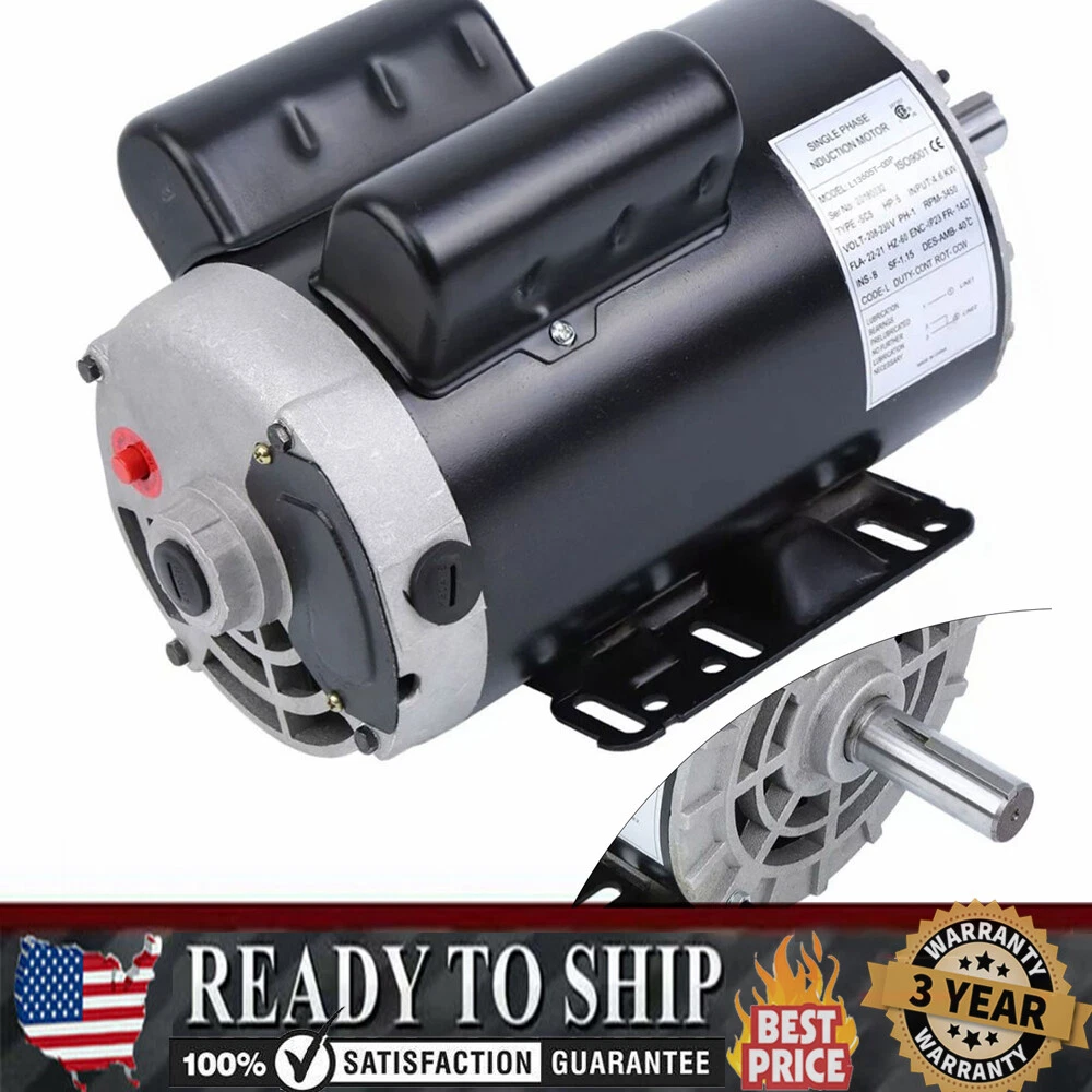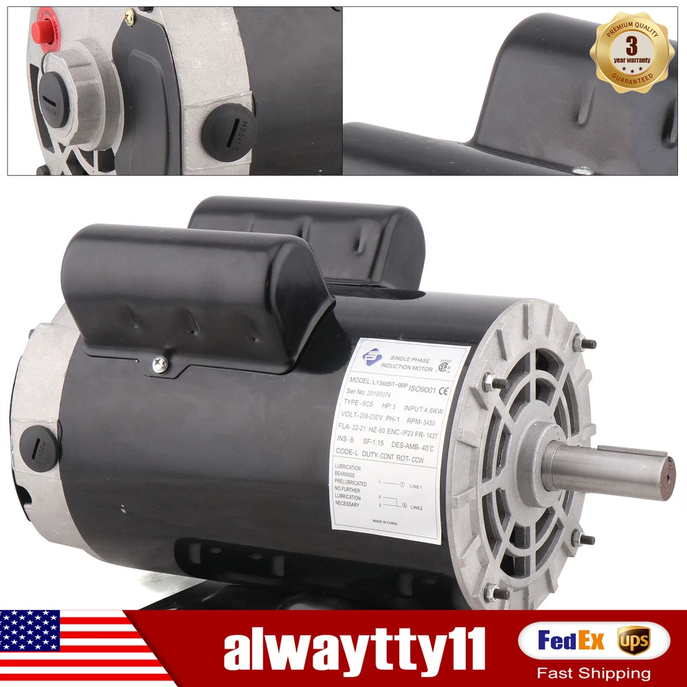 Specification: Horsepower (HP):5 Hp AC Frequency Rating: 60 Hz Frame Size: 143/5T Base RPM: 3450 Volt: 208-230V INPUT: 4.6kW Service Factor: 1.0 Full Load Amps: 22-21 Shaft Diameter: 7/8 in Shaft Length: 2.25in Shaft Type: Keyed ENC: IP23 FR: 143T AC Phase: Single Phase Reversible/Non-Reversible: Non-Reversible ROT: CCW Overload: Yes / Manual reset button Additional Product information: Rigid Base - CL B Insulation 40 C / 104 F Ambient Temp Package includes: 1*Air Compressor Motor 5 HP 3450 RPM Air Compressor 60 Hz Electric Motor 208-230 V Century 7/8'' Shaft 5HP Air Compressor Duty Electric Motor 145T Frame 3450 RPM Single Phase 208-230V Attention: Not all 5 hp motors are exactly the same. So, with the new motor you're purchasing, it's vitally important that you match up the specs on your old motor. All of the information you need to know can be found right on your electric motors nameplate/sticker, which usually can be found on the side of the motor. Feature: 1.Reduced starting amperage design to ensure the reduced voltage starting at rated load. 2.Equipped Manual thermal overload, capacitors and high quality ball bearings to ensure the lifetime. 3.Open drip-proof is better used in environment that are relatively clean and dry environments. Special design for Air Compressor duty. CCW only. 4.Special design for Air Compressor duty. 5.Motor is Non-Reversible CCW (Counter Clockwise) ONLY. Specification: Horsepower (HP):5 Hp AC Frequency Rating: 60 Hz Frame Size: 143/5T Base RPM: 3450 Volt: 208-230V INPUT: 4.6kW Service Factor: 1.0 Full Load Amps: 22-21 Shaft Diameter: 7/8 in Shaft Length: 2.25in Shaft Type: Keyed ENC: IP23 FR: 143T SF: 1.0 AC Phase: Single Phase Reversible/Non-Reversible: Non-Reversible ROT: CCW Overload: Yes / Manual reset button Additional Product information: Rigid Base - CL B Insulation 40 C / 104 F Ambient Temp Package includes: 1*Air Compressor Motor Note: 1: Amperage This is your electric motors TRUE power rating. HP ratings have been made suspect over the years by large retailers who like to use "peak HP" or " SPL " in their terminology. The Motor's amp rating does not lie. Please make sure your FL amp (FULL LOAD) rating on the motor you're replacing is within 10% of the FL Amp rating of the motor you intend to buy. Example 1: If your current motor says 21 FL amps at 230VAC. Then you would be safe replacing your motor with a 19FL amp thru 23 FL amp electric motor 230volt. Example 2: If your current motor says 21 FL amps at 230VAC. Then you replace it with a 15 FL amp motor. That 15A motor is NOT strong enough for the task, and will indefinitely fail. 2: Frame Size The frame not only constitutes the bolt pattern, it also depicts the overall size and torque. The larger the frame, the stronger the motor. If your current motor you're replacing shows 56, 143T or 145T on the nameplate. Its extremely important that you replace it with that frame size. Improperly sized motors will inevitably result in motor failures. Example: If your existing motor says 5HP 184T frame, and you elect to replace it with a 5HP 56frame.. That would be similar to using a 4 cylinder engine to power a school bus. This is why its important that your new motors frame size matches the old motor you're replacing. This will ensure your replacement motor will work for years to come. 3: Phase and Voltage If your machine requires a 230volt electric motor on single phase power. You would want to incorporate a 1-phase 230vac electric motor for your application. 230V electric motors cannot handle voltages less than 208V. They will run too hot and you will experience motor failure. 4: RPM Matching up the RPM is quite important. The wrong speed can damage your pump. The RPM does not have to match exactly, but you do need to be the neighborhood. Example: 3510rpm, 3550, 3450 are all the same. They all fall under the umbrella of whats known as 3600RPM motors. 5: Shaft Diameter With a tape measure. Measure the outside diameter on your electric motors shaft. By matching up the proper shaft diameter, you will be able to reuse the original motor pulley that came on your machine. Payment Delivery details Terms of sales About us Contact us Payment We accept ebay payment ă Fees such as import duties, taxes are not included in the item price or shipping costs. These charges are the buyer's responsibility. Delivery details Shipping: 2-9 working days to: USA Terms of sales We maintain high standards of excellence and strive for hundred percent customer satisfaction. Feedback is very important to us. We hope that you contact us immediately before you give neutral or negative feedback, so that we can address your concerns. It is impossible to address issues if we do not know about them! About us Your satis faction is our ultimate goal. We work hard to earn your trust and future business. Our certified technicians have tested each item before shipping. The unit comes with 1 year limited warranty on all manufacturing defects. a) If you receive a defective item, you may return it or ask for a discount. Please contact us within 14 days after you receive the package. b) What you returned must be intact and in its original packaging as re? u. Customer is responsible for shipping costs of the returned item. c) We will cover the cost of shipping back t with the shipping rate indicated in the registration page. We will send you a new unit or refund the full payment you paid. Thank you. Contact us Business Hour Business Hour: Monday To Friday: 8:30 AM to 5:00 PM (Beijing China time) Due to time zones, our reply to your questions may not be immediately. But within above working time, we will reply your email within 24 hours. If it's non-workdays, please kindly be patient and wait till Monday. Please contact us with ebay message. Please feel free to contact us if you have any questions. Monday To Friday: 8:30 AM to 5:00 PM (Beijing China time) Due to time zones, our reply to your questions may not be immediately. But within above wor