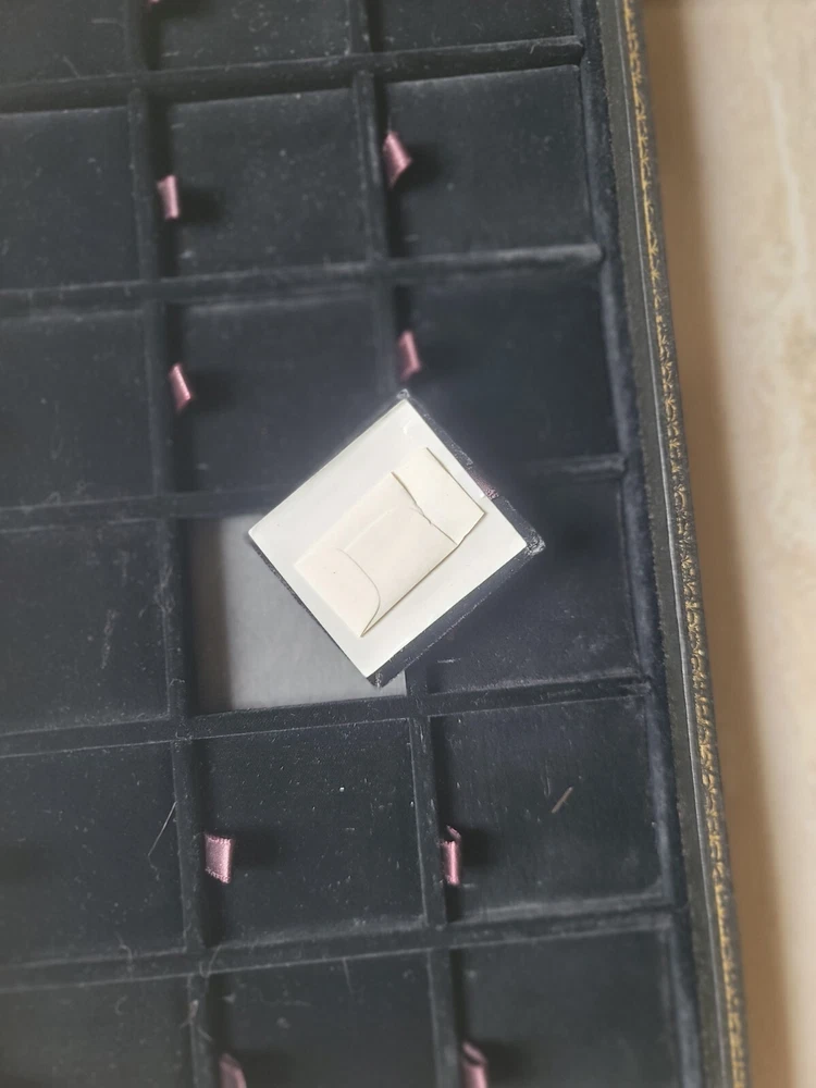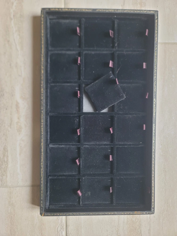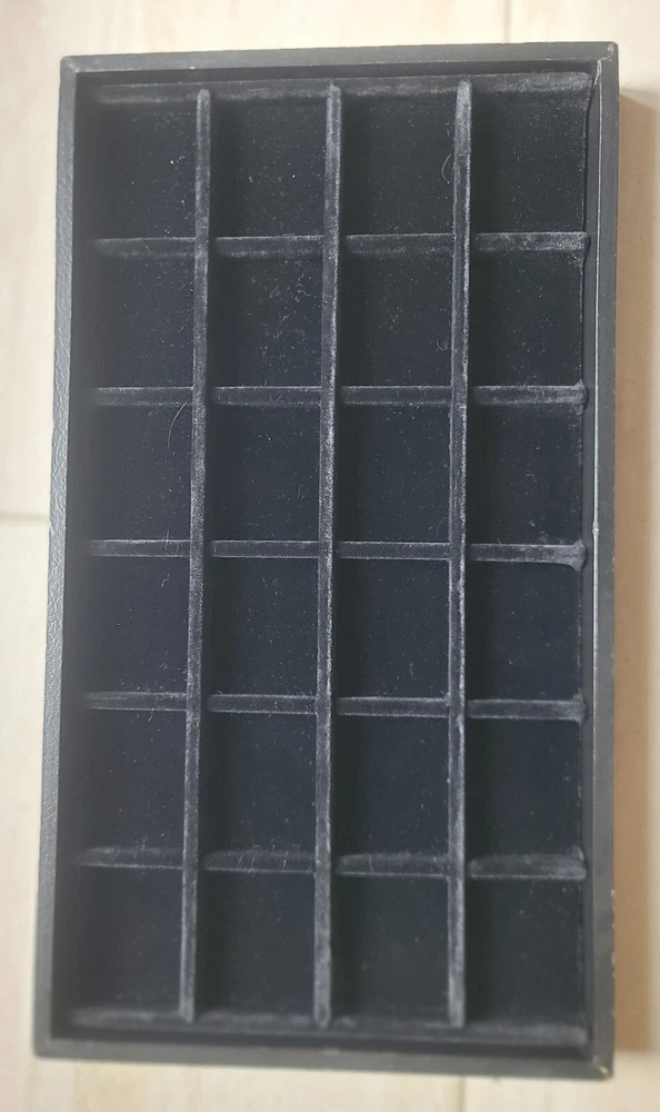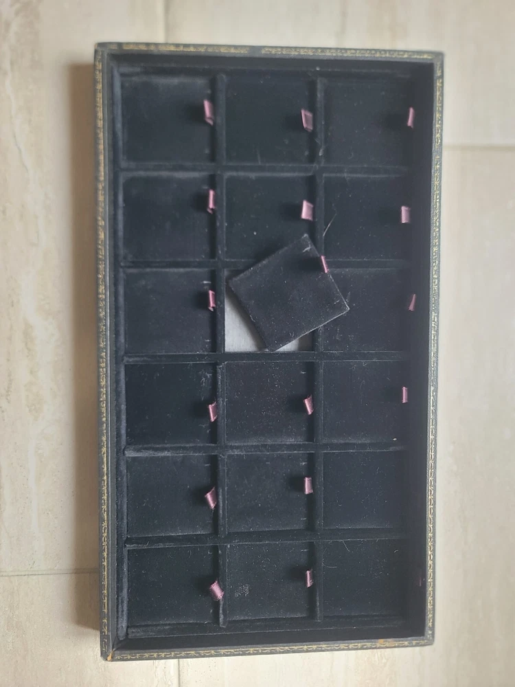 5 Jewelry trays with specialty inserts in our opinion, good shape but do not order if in doubt NO RETURN ITEM (postage too high) 2 trays with 24 item dividers---inserts are removable 2-18 item jewelry tray inserts with square velvet 2x2 inserts (pocket on back for pricing, etc)--- Only the 2x2 can be removed, the divider is fixed to tray 1 tray with removable insert for (12) bracelets, pens, etc.