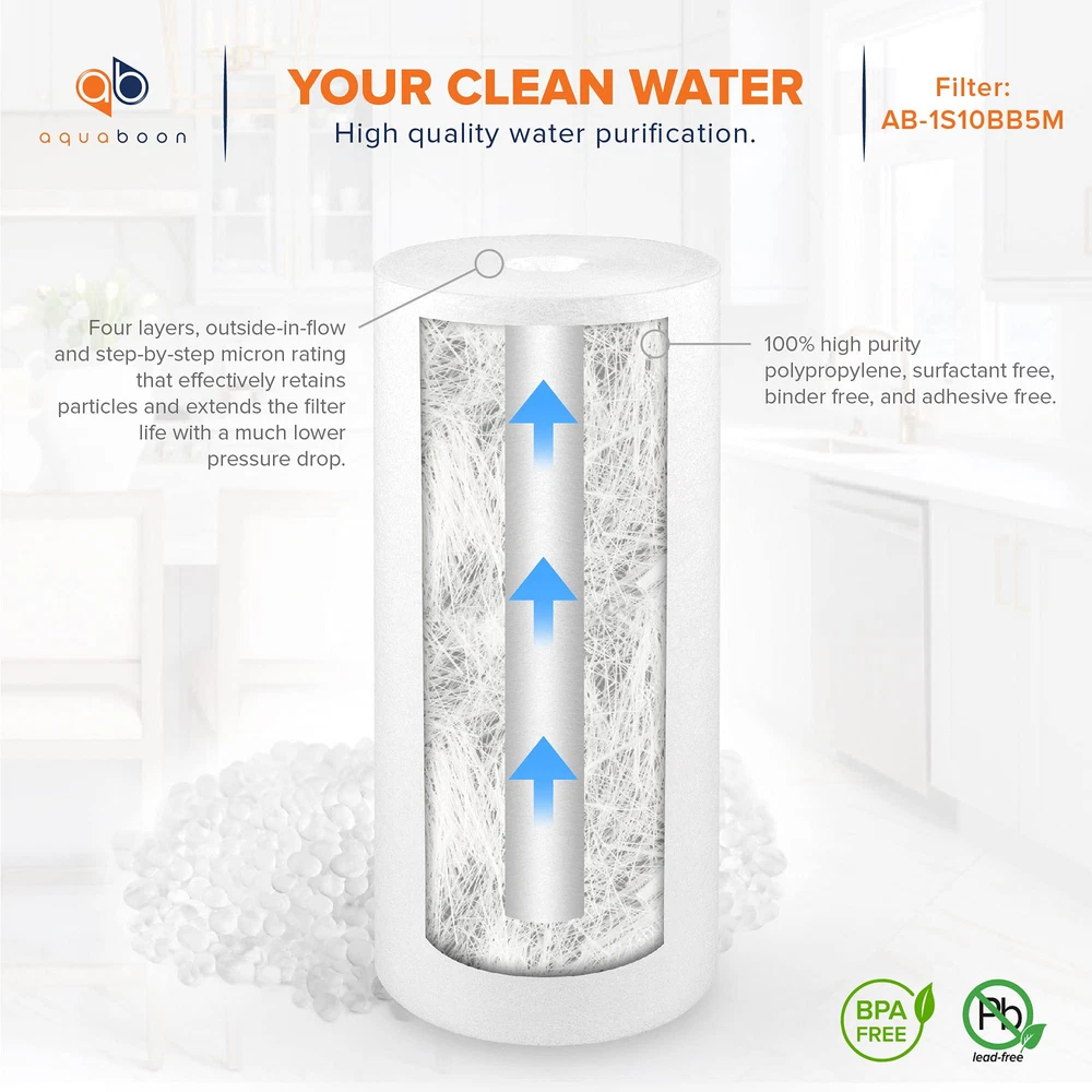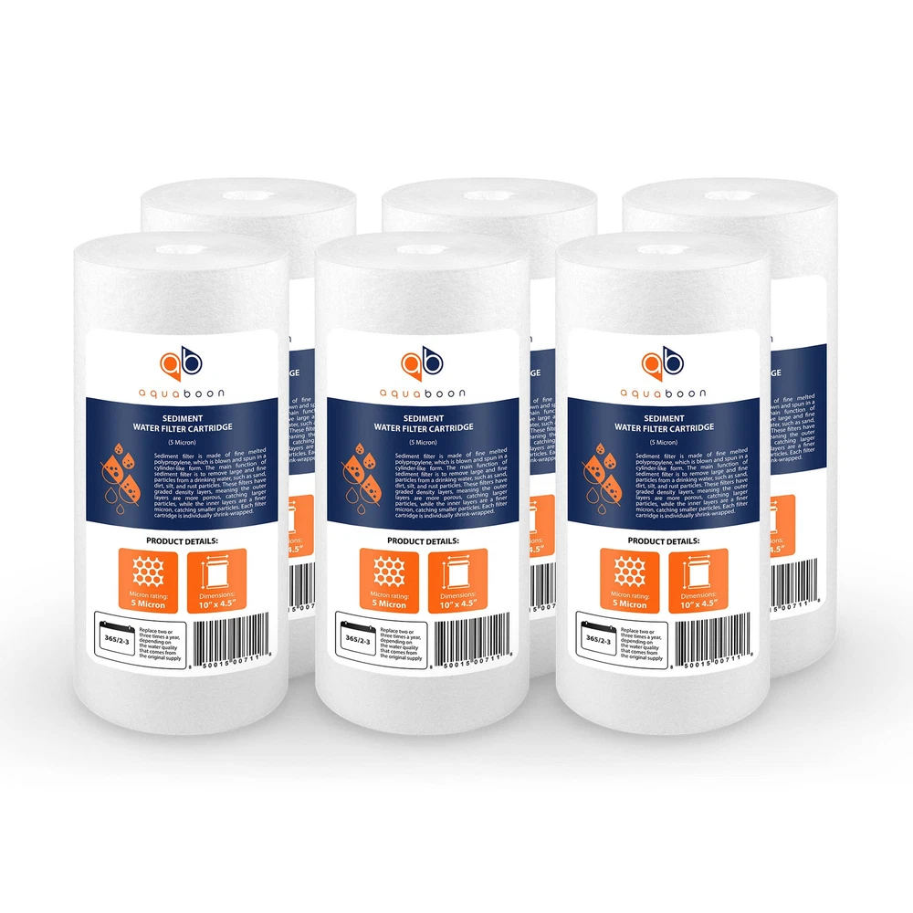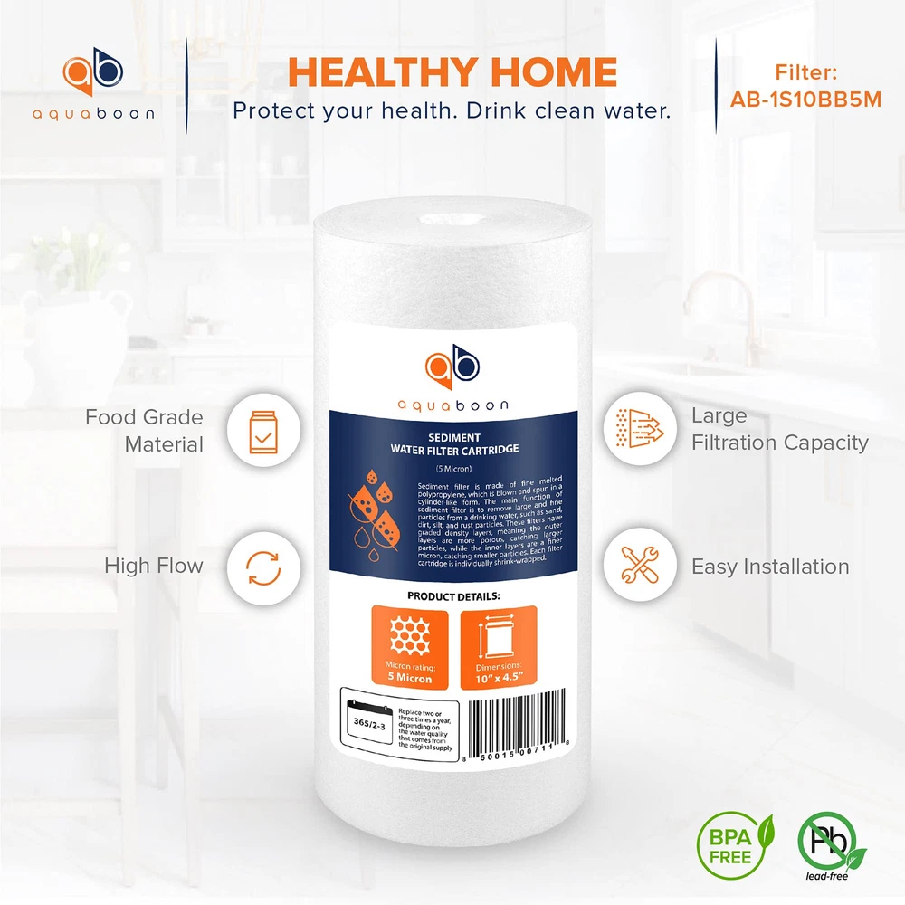 Universal Fit for Whole Home Water Filtration: 5 micron sediment filter 10 x 4.5 cartridge fits effortlessly into water filter housings with 4.5 inches diameter. This house water filter offers versatility and easy installation, requiring minimal tools.. Extended Lifespan for Optimal Well Water Filtration: With a high-capacity design, 10 x 4.5 water filter provides up to 30% longer servicing than standard house water filters, offering filtration for up to 30,000 gallons, depending on the water quality. Durable Construction: Made from 100% pure polypropylene, our sediment filter for well water ensures durability and resistance to corrosion. The premium build of this water filter cartridge ensures reliable performance, delivering safe filtered water. Exceptional 5 Micron Filtration: The 5 micron water filter captures particles, such as rust, dirt, and sediment, ensuring that your well water is crystal clear. Sediment water filter protects plumbing, appliances and water filtration system from clogging. Reduced Maintenance & Maximum Efficiency: Home water filter reduces maintenance and offers optimal performance, extending the life of well filter system. Depending on the water quality it filters up to 30,000 gallons, ensuring efficient sediment removal. Multi-Layer Filtration Technology: 5 micron water filters cartridges features advanced multi-layer filtration, capturing particles of various sizes at different layers for enhanced water clarity. This ensures that even the finest impurities are removed. Easy Installation, Reliable Performance: Designed for effortless setup, whole house filter requires no complex tools or professional help. Enjoy a quick and simple installation, giving you immediate access to high-quality, filtered water throughout home. Cost-Effective Filtration Solution: Sediment water filter cartridges offer an affordable water filtration solution from any source. With a service life of 4-6 months, depending on the water quality, they ensure lasting protection for water water system. Compatible Water Filters Replacement Cartridges: Compatible with AquaPure AP810, Pentair DGD-5005, P5-BB, Pentek DGD-5005, Aqua-Pure AP814, AP811, ClearChoice 84632, Cuno CFS810, Filter Specialist CMMF05975-45W1, Filtrete 647632,Liquatec SDF-45-1005, etc. Compatible Big Water Filter Housing Models: Compatible with WHKF-GD25, WHCF-WHPLBB, Pentek DGD series, American Plumber W10-PR, W15-PR, Aqua-Pure AP801, Culligan HD-950, GE GXWH35F, GXWH30C, GXWH-40L, GNWH-38F, RFC-BBSA, GXWH-35F, DuPont WFHD13001B, etc.