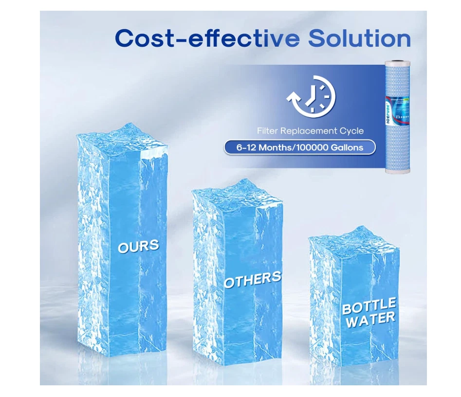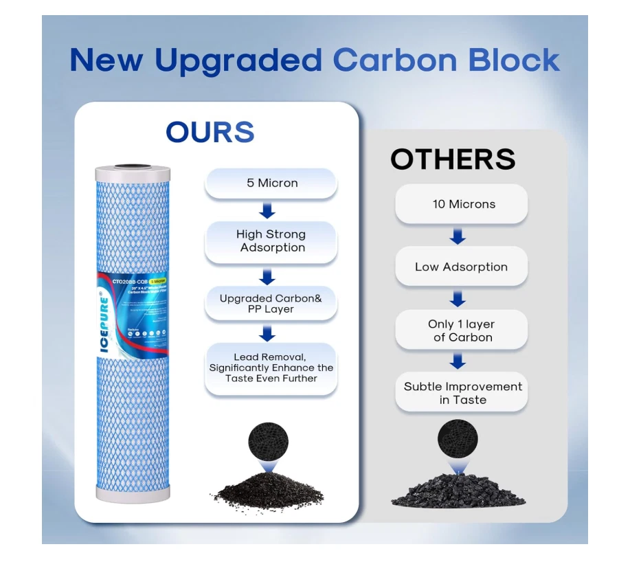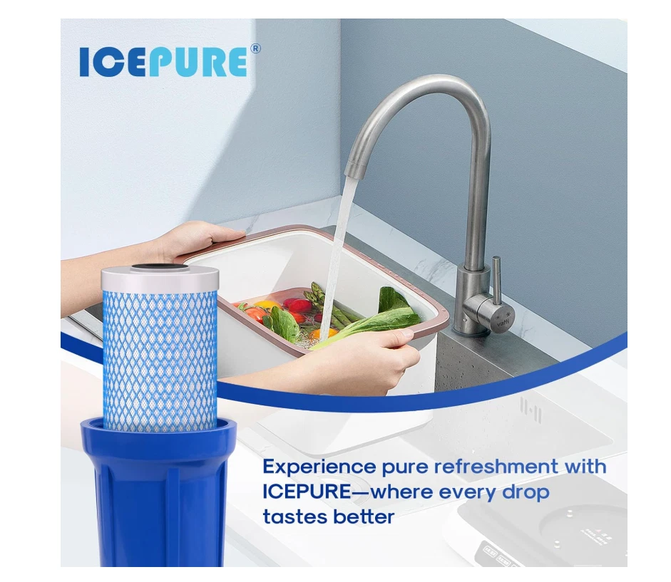 Upgraded Premium Carbon Block – ICEPURE whole house carbon block has upgraded, and its special formula enhances adsorption and filtration performance, to remove many harmful substances you worry about lead, chlorine, odor, Cyst, Dust, Sand and impurities, Reducing your concerns about chlorine, Chloramine and heavy metals lead. Efficient Filtration - This filter is made with innovative Sintering Technology, which helps to remove Chlorine, Lead and other impurities. This filter can remove finer particles and sediment. Delivering cleaner water that tastes great provides a wonderful drinking experience for your whole family. This filter has a life span of up to 100000 gallons depending on your water quality. For optimum performance, we recommend you change the filter every 6-12 months based on water quality. Superior Material - Our 4.5'' X 20'' whole house enhanced carbon water filter has Durable materials, food-grade, lead-free, and BPA-free. This kind of filter is recommended for tap water filtration. If your water source is well water, this filter may not achieve the filtering effect that you expect, because well water contains large particles such as mud and sands which may clog the filter in shorter time. Easy to Install - Installing and replacing the filter cartridge is incredibly simple and effortless, requiring no tools. It conveniently fits into a variety of filtration systems and can also be used as a standalone cartridge. Regular replacement is recommended to maintain optimal filtration performance. The straightforward process allows you to replace the filter in minutes, ensuring consistent water quality without disruption to your daily routine. High Standards - ICEPURE water filters use US technology and teams. The ICEPURE brand has high requirements for products, and every product that is manufactured must go through 5 inspection and testing stages ensuring that every product meets our high expectations.