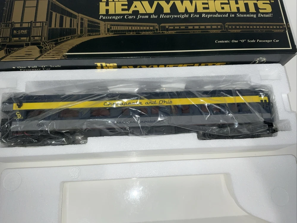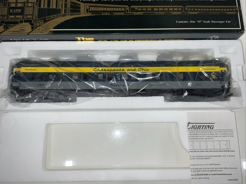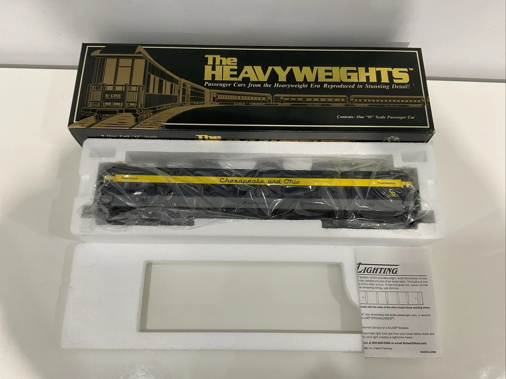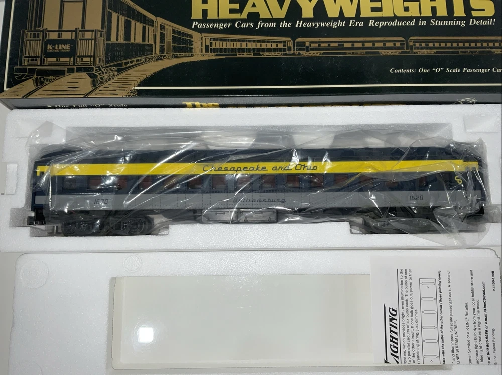 ITEMS WILL BE SHIPPED IN ORIGINAL CARDBOARD FACTORY BOX Includes (In Order of Pictures): K4415-0314 Baggage Car with Interior & StreamLighting K4415-1921 "American Revolution" Observation Car with Interior & StreamLighting K4415-1620 "Williamsburg" Coach with Interior & StreamLighting K4415-2801 "MONTICELLO" Pullman with Interior & StreamLighting K4415-0964 "Raleigh Tavern" Diner With Interior & StreamLighting Original Carboard Factory Box (5 PACK WILL BE SHIPPED IN ORIGINAL CARDBOARD FACTORY BOX (Seen in Last Picture) BUT NO OUTSIDE BOX TO PROTECT THE CARDBOARD FACTORY BOX ALL ARE BRAND NEW IN BOX; ONLY TAKEN OUT FOR PICTURES Passenger car boxes have relatively minimal wear; the original cardboard factory box has some wear due to being used for shipping purposes This is a rare opportunity to own a set of five K-Line passenger cars, all in an authentic paint scheme Chesapeake & Ohio paint schemes. These cars are ready to go and pre-built, perfect for adding to your model railroad collection. Each car measures 18 inches in length and is made in China, with a gauge of O. The set includes replicas of the Chesapeake & Ohio passenger cars, featuring the corporate roadname and theme of transportation. These cars are perfect for collectors or enthusiasts of model railroads and trains. Don't miss out on the chance to add these heavyweight passenger cars to your collection that have four bulb interior illumination!