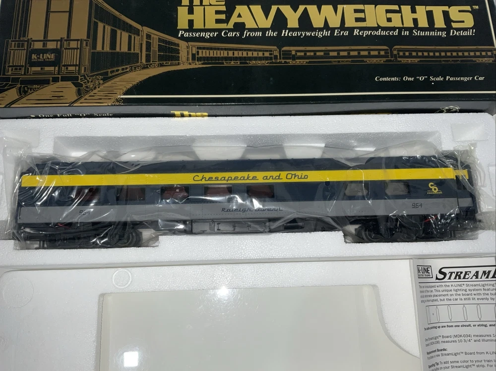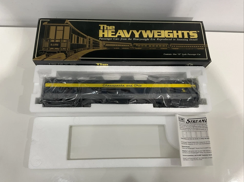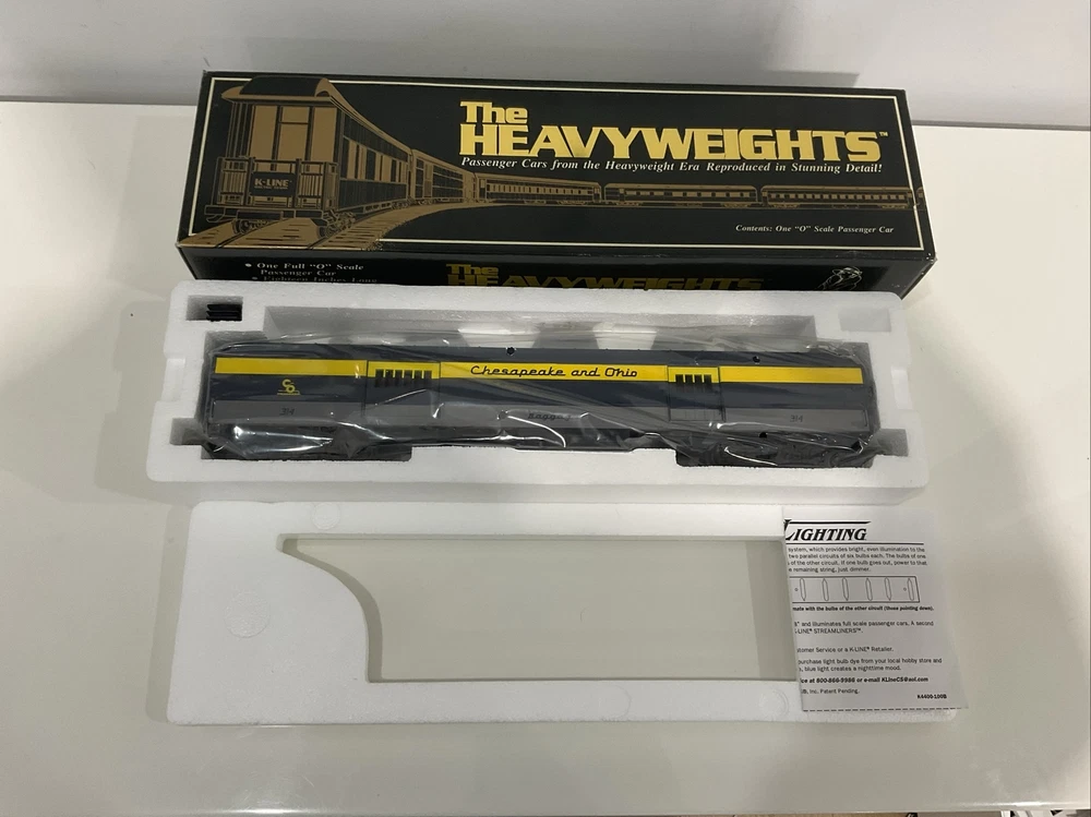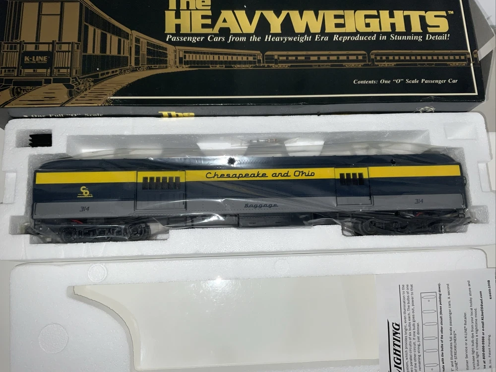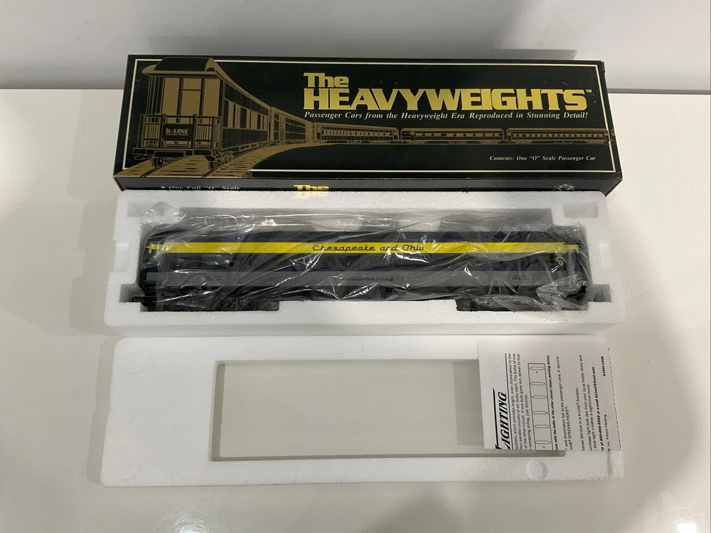 ITEMS WILL BE SHIPPED IN ORIGINAL CARDBOARD FACTORY BOX Includes (In Order of Pictures): K4415-0314 Baggage Car with Interior & StreamLighting K4415-1921 "American Revolution" Observation Car with Interior & StreamLighting K4415-1620 "Williamsburg" Coach with Interior & StreamLighting K4415-2801 "MONTICELLO" Pullman with Interior & StreamLighting K4415-0964 "Raleigh Tavern" Diner With Interior & StreamLighting Original Carboard Factory Box (5 PACK WILL BE SHIPPED IN ORIGINAL CARDBOARD FACTORY BOX (Seen in Last Picture) BUT NO OUTSIDE BOX TO PROTECT THE CARDBOARD FACTORY BOX ALL ARE BRAND NEW IN BOX; ONLY TAKEN OUT FOR PICTURES Passenger car boxes have relatively minimal wear; the original cardboard factory box has some wear due to being used for shipping purposes This is a rare opportunity to own a set of five K-Line passenger cars, all in an authentic paint scheme Chesapeake & Ohio paint schemes. These cars are ready to go and pre-built, perfect for adding to your model railroad collection. Each car measures 18 inches in length and is made in China, with a gauge of O. The set includes replicas of the Chesapeake & Ohio passenger cars, featuring the corporate roadname and theme of transportation. These cars are perfect for collectors or enthusiasts of model railroads and trains. Don't miss out on the chance to add these heavyweight passenger cars to your collection that have four bulb interior illumination!
