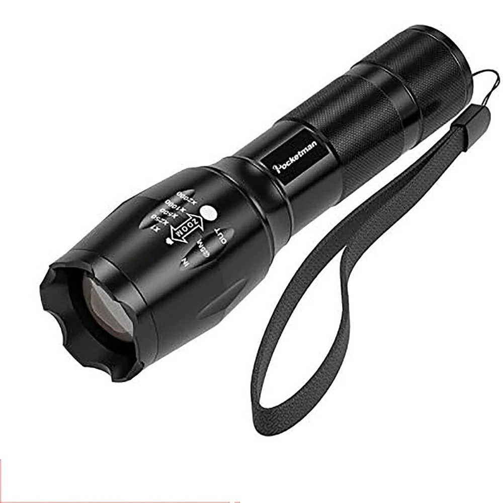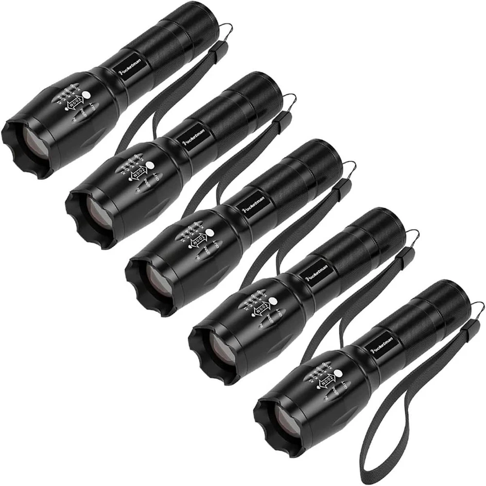 Specification 1) Type of flashlight: handheld flashlight 2) Adjustable Focus: can adjust its focus for different usage 3) Output brightness: The best output brightness was powered by 18650 battery 4) Internal wiring applies the high efficient booster circuit, working voltage is wide and can utilize the batteries in the largest extent 5) Waterproofing design(But Can't put it into water directly) 6) 5 switch Modes: high / middle / low / strobe / SOS 7) Made of high quality aluminum alloy, this flashlight is sturdy and durable enough for long time daily using 8) Lamp base: high power LED. With a lifespan of up to 100,000 hours or more, no need to consider replacing the cap for the whole life 9) Power by: 1 x 18*65mm 3.6v/3.7v OR 3X AAA battery(Battery not included) Package: 5x Tactical Flashlight 5x Plastic tube for using 18650 battery 5x AAA battery holder for using AAA battery ✔Adjustive Focus:1200 lumens(Max),spotlight for long range observation;floodlight for large area illumination ✔Powe Source:1x18*65mm Battery/3xAAA Batteries(not include) ✔5 Modes Switchable:high - medium - low - sos - Strobe,the light will change to different mode by pushing the button,easy to operate ✔Advance Design:Skid-proof design and Water assistant.Easy to carry and use