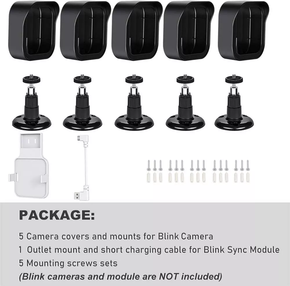 【Blink Outdoor Camera Covers】If you have a third-generation Blink Outdoor Camera, the blink outdoor camera coveras will be a good choice, Great device protection, protect your Blink Outdoor Camera from all kinds of potential damage in any circumstance. 【Blink Outdoor Camera Mounts】360° Rotation, this versatile camera wall mount provides 360°rotation for your all-new blink outdoor camera and leaves no blind spot, making your home a safer and controllable world. 【Blink Module 2 Outlet Mount】Keep the blink sync module 2 stand against the wall and save your counter space. The extra customized short USB cord will help you out of the messy wires. 【Package Contains】Plastic weather proof housing x 5(or 3), Blink Outdoor camera mounts x 5(or 3), outlet wall mount for Blink Sync Module 2 x 1, customized short USB cord x 1, screw accessories x 1 set. ( NOT include camera , blink sync module and AC adapter) 【Customer Service】Your satisfaction is our top priority. If you have any problems with it or questions, please feel free to contact us and we will solve it for you as soon as possible.