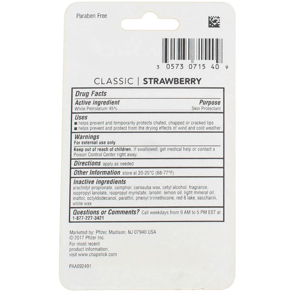 5 Pack Chapstick Classic Lip Balm, Classic Strawberry, 3 Ct, 0.15 oz Warnings Disclaimer The product descriptions and instructions provided by vitabox.com are for informational purposes only and are qualified in their entirety by the information available from manufacturers of the products. You should carefully read all product packaging, and contact the manufacturer with any questions before using a product. While we endeavor to ensure that product descriptions are current, manufacturers sometimes change their products. We are not liable for inaccuracies or misstatements about products. We do not provide medical advice or recommendations. You should not use the information provided by vitabox.com for diagnosing or treating a health problem or disease. If you have or suspect that you have a medical problem, immediately contact your health care provider. Information and statements regarding dietary supplements have not been evaluated by the Food and Drug Administration or any other government agency and are not intended to diagnose, treat, cure, or prevent any disease. Disclaimer The product descriptions and instructions provided by vitabox.com are for informational purposes only and are qualified in their entirety by the information available from manufacturers of the products. You should carefully read all product packaging, and contact the manufacturer with any questions before using a product. While we endeavor to ensure that product descriptions are current, manufacturers sometimes change their products. We are not liable for inaccuracies or misstatements about products. We do not provide medical advice or recommendations. You should not use the information provided by vitabox.com for diagnosing or treating a health problem or disease. If you have or suspect that you have a medical problem, immediately contact your health care provider. Information and statements regarding dietary supplements have not been evaluated by the Food and Drug Administration or any other government agency and are not intended to diagnose, treat, cure, or prevent any disease.
