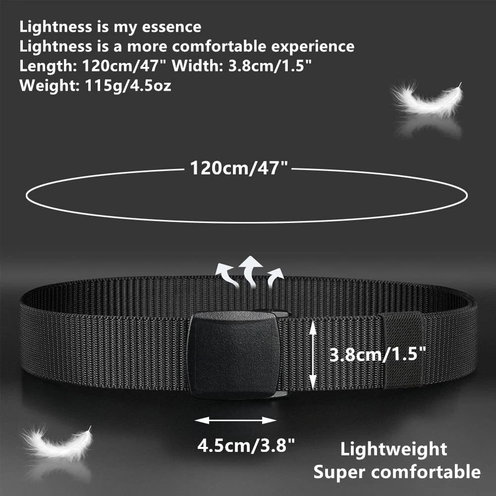 Superior Material: -International standard buckle, Without any metal, anti-allergic. -Durable, high strength, breathable 1000D nylon webbing with 1100lb/500kg tensile strength. Lightweight And Durable Belts strap made of strong and durable Nylon, supply more relaxed, lightweight belts for you. Our products have been tested to ensure a two-three-year lifetime using in the normal circumstances. Packing list: 1 x Black Tactical Belt 1 x Tan Tactical Belt 1 x Camo Tactical Belt 1 x Blue Tactical Belt 1 x Grey Tactical Belt QUALITY NYLON BELT: One purchase for 5 pack nylon belts. Premium nylon webbing, lightweight, soft, flexible, sturdy and durability, sweat absorption and dry fast. Suitable for daily wearing with all pants, and outdoor heavy duty work or sports. NON-METAL BELT: Well-designed nylon web belt with YKK plastic buckle. Travel-friendly Non-Metal construction, Nickel Free, Non-Allergic. Allow you to be able to go through a metal detector or airport security without having to take it off. MILITARY TACTICAL BELT: Strong enough to withstand 500Kg weight no deformation. Ideal for police, firefighters, CCW, security guards, electricians and utility workers in need of a great duty belt to carry tools or weapons. Also great for paintball and airsoft gear! ADJUSTABLE WEBBING BELT: 100% Nylon web belt,Width:1.5”(3.8cm), Length:47”(120cm). Holeless design belt and removable buckles allow you to trim the extra length if it is too large for you. Perfect custom belt for your family. NICE GIFT BELT: This unisex nylon web belt is a good gift for your friend and relatives in Thanksgiving Day, Christmas Day.