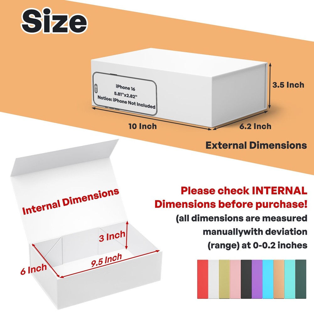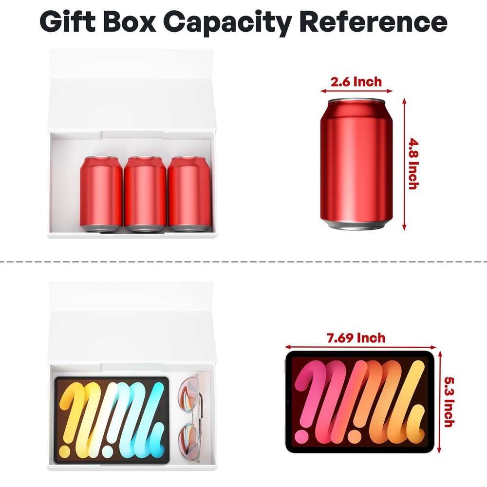 5 Pack White Gift Box, 9.5x6x3'' Gift boxes for Presents with Lids Magnetic Closure Rectangle Collapsible for Bridesmaid Proposal Box, Wedding, Christmas, Halloween, Birthday Gift Packging 🎁Gift Box - Gift boxes with lids enhances your gift and makes it stand out. Saves you the need to hunt for wrapping paper, ribbon or tape to wrap your gift. 🎁SlZE - Gift boxes for presents External dimensiong 10x6.2x3.5 inches (Internaldimensions are 9.5x6x3 inches), Collapsible gift box can hold for iPad Mini 8.3 inch and Three cans of Coke, Silk scarves, socks, baby bottles, shaving kits, Bluetooth headphones, fountain pen set, chocolates, candies, cosmetics, perfumes, jewelry, candles, cups, souvenirs orsmaller clothing accessories and more.(all dimensions are measured manuallywith deviation (range) at 0-0.2 inches) Please confirm interior dimensions before purchasing! 🎁STRONG MAGNETIC CLOSURE - The rectangular gift box has a concealed and sturdy magnetic closure that allows the flip-top gift box to be easily opened and closed repeatedly. 🎁EASY ASSEMBLY - The repeatable small gift box has a foldable design for easy storage and transportation, tear off the white triangle sticker to easily assemble and glue the box, it is also suitable for everyday or seasonal decorative storage and organization. 🎁SPECIAL GIFTS - Delicate magnetic gift box ensure your gift will be unique on Christmas, Easter, Thanksgiving, Mothers Day, Fathers Day, Birthdays, Weddings, Anniversaries, Graduations and more.(The box paper is FSC certified.)