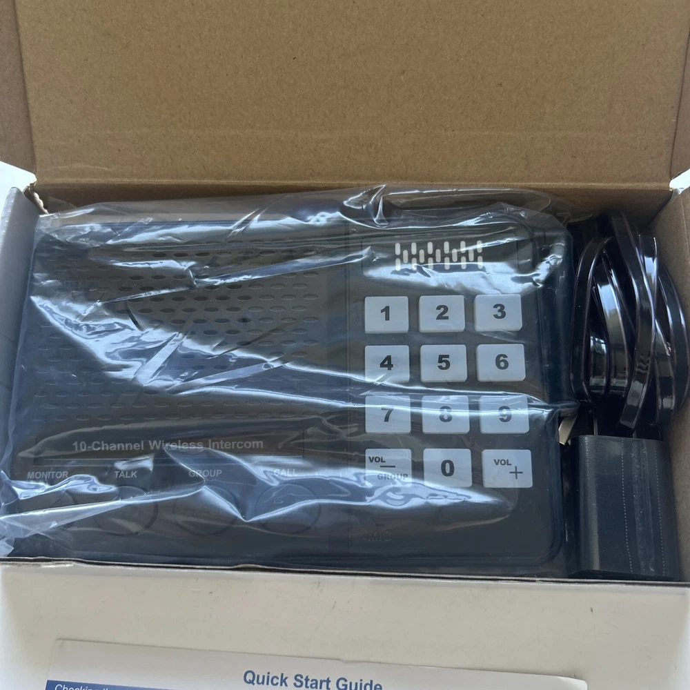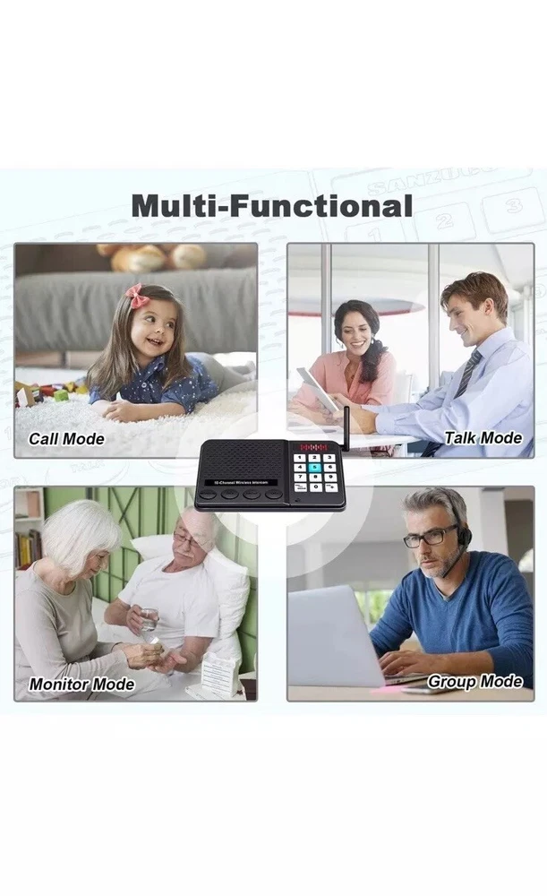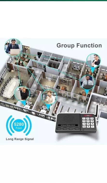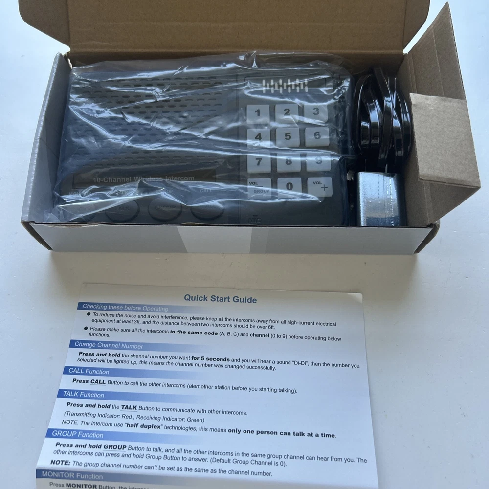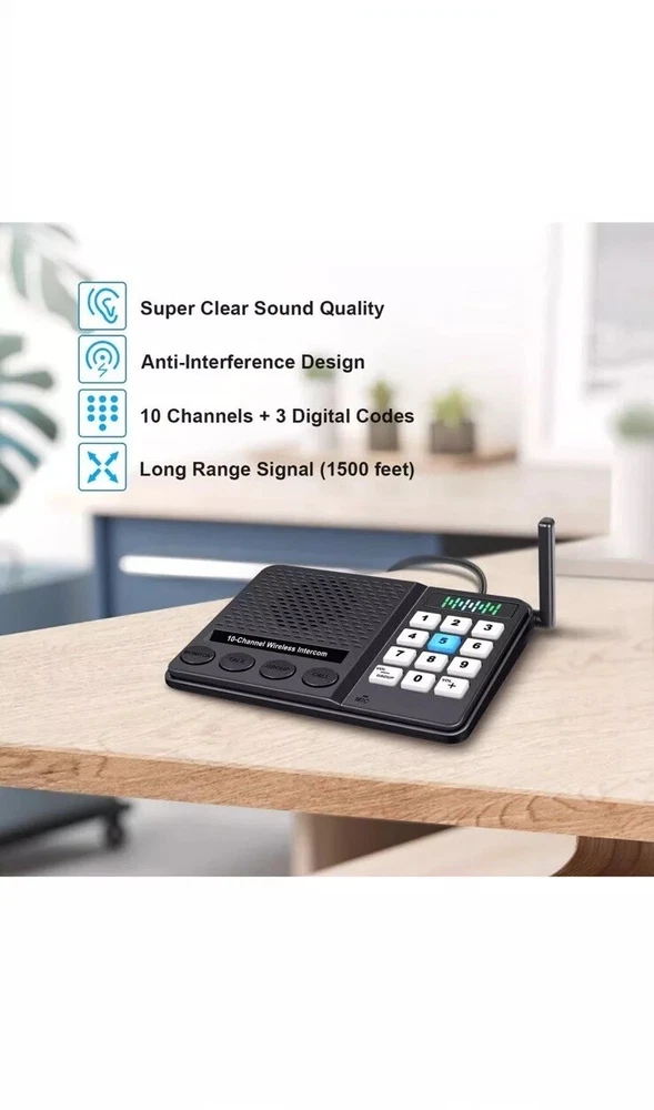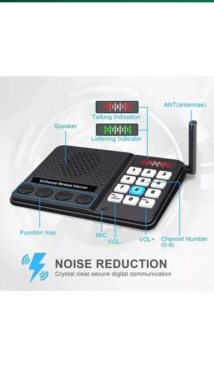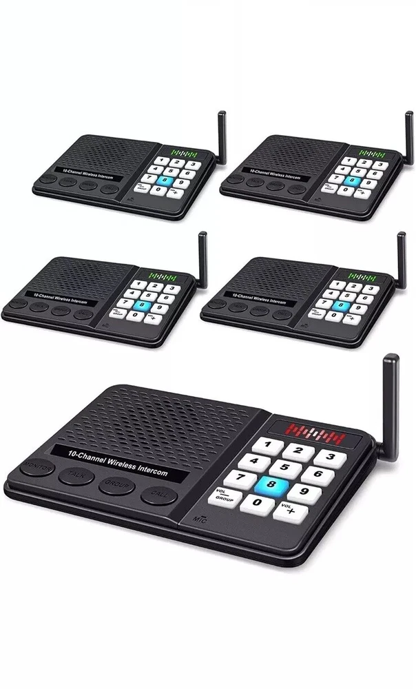 Open box new item! Lifetime Usage - We have 50 + years experience for producing intercom, our factory is one of the leaders in pushing this industry. We only produce product of superior quality to give the buyers the best using experience. Our wireless intercom has passed all the professional certificate, like FCC, CE, Rosh, etc. In order to show our confidence of our products, We provide a worry-free purchase to let you no need to worry about any quality problem Multiple Channels and Function - This wireless intercom system for home has 10 channels (made of Advanced anti-interference technology) and 3 secret digital codes to meet your different communication requirements in different situations, widely used in house, office, gate, restaurant, etc. Our intercom system has 4 main functions: monitor, talk, Group and call. Widely used at home or office, make your life and work communication become more convenient Long Range + Radio Sound - Our new release long range house intercom system is inserted superior crisp Chip to provide you the crystal sound quality and prevent interference. The effective distance of this intercoms wireless is 1 to 1. 5 mile up to the actual circumstance. Perfect for Department to department, room to room, building to building communication No Need Battery - This wireless intercoms is powered by a USB cable, which is easy for connected by power bank. No need battery charging or phone wire on the wall. Suitable for both indoor and outdoor usage, and help you keep your space in original shape, clean and you can take it to any place you want What you will get - 5 x wireless intercom system, 5 x USB cables, 5 x USB wall chargers