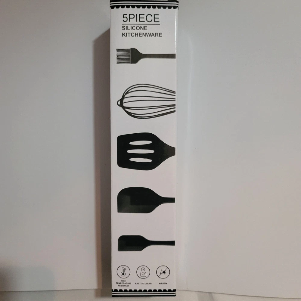 This 5 piece silicone kitchen set includes a spatula, whisk, and four other tools. The set is made of high-quality silicone material that is heat resistant and dishwasher safe. The sleek black color adds a touch of elegance to your kitchen. These tools are perfect for all your cooking needs and are sure to become your new go-to kitchen accessories. HIGH QUAILITY WHISK: Ideal for whisking eggs, mixing batters, sauces, and more. Comfortable grip handle ensures effortless whisking and mixing. VERSATILE CLASSIC SPATULA: An indispensable tool for various kitchen tasks including mixing, folding, serving, and flipping. Its nylon core ensures durability, while flexible edges provide precise control for every culinary need. INNOVATIVE SPOONULA: Designed with an offset spatula and shallow bowl, this utensil redefines scooping and serving. Its innovative design simplifies kitchen tasks, offering efficiency and precision in every use. IMPRESSIVE JAR SCRAPER: Featuring a long, narrow head and flexible edges, this scraper ensures thorough cleaning of jars and containers. No residue is left behind, maintaining a pristine kitchen environment with ease. MINI SPATULA & SPOONULA DUO: Ideal for smaller kitchen tasks, these tools offer versatility and convenience. They complement larger utensils, keeping your workspace organized and efficient for seamless meal preparation. SLEEK SILICONE DESIGN: These utensils combine modern style with practical functionality. They effortlessly blend into any kitchen decor, adding a touch of elegance while catering to your culinary needs.