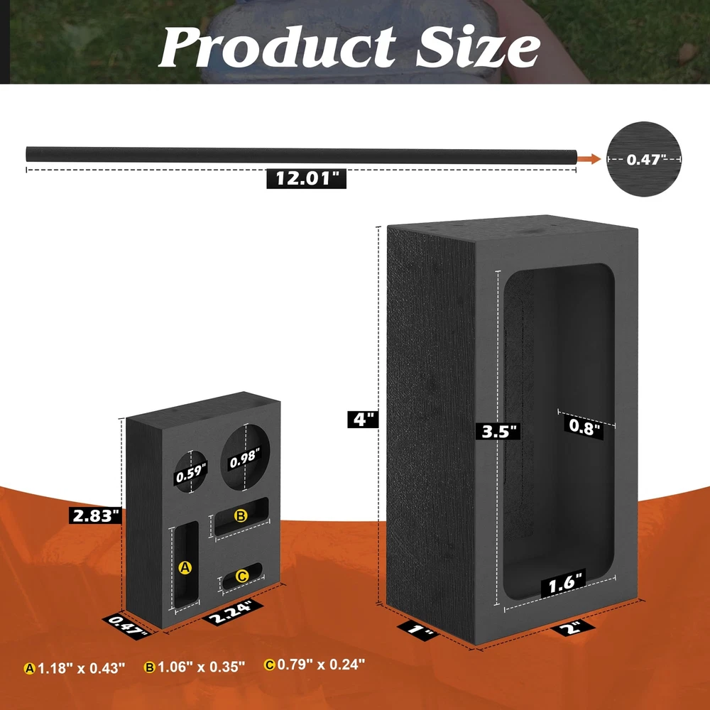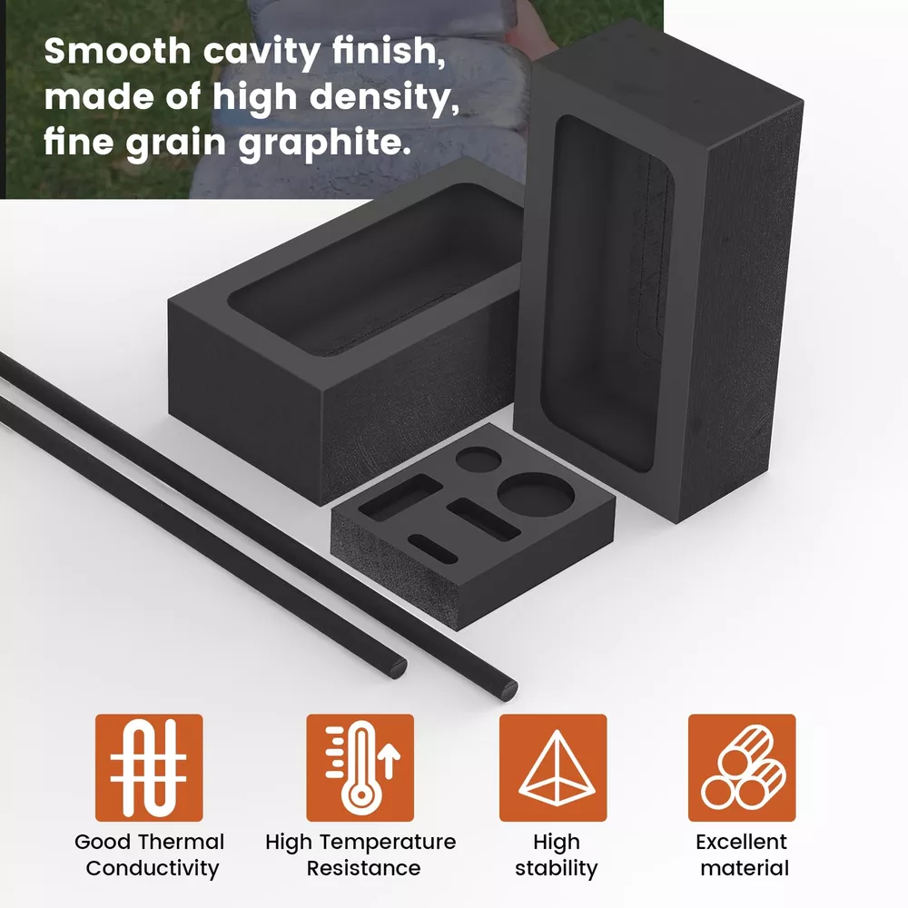 Discover the perfect combination set for all your DIY metal melting, casting, and refining needs. Our 5-in-1 Graphite Casting Ingot Mold Set includes everything you need to get started. Product Composition: 5-in-1 Graphite Casting Ingot Mold: 2.83" x 2.24" x 0.47" with 3 rectangular slots and 2 round holes; 1kg Graphite Ingot Crucible Molds: Outer - 4" x 2" x 1" (100 x 50 x 25 mm), Inner - 3.5" x 1.6" x 0.8" (90 x 40 x 20 mm); Graphite Stir Rod Sticks: 12" long, 0.47" diameter Premium Graphite: Crafted from premium graphite for enhanced durability and excellent heat resistance, ensuring long-lasting performance and superior results in metal casting Versatile Usage: Perfect for experiments and smelting of non-ferrous metals such as gold, silver, copper, aluminum, and more; Ideal for use as an ingot mold, graphite crucible melting, test analysis, and other purposes Convenient Combination Set: A comprehensive 4-piece set designed to meet all your DIY needs for melting, casting, and refining metal jewelry;The set's dimensions are perfect for small-capacity metal melting projects, offering precision and efficiency Important Reminder: Please carefully check the dimensions provided in the product details before making your purchase to prevent any inconvenience caused by ordering the incorrect size Buyer : Enjoy peace of mind with our 24-hour ;If you have any questions, please get in touch with us through buyer messages for prompt assistance