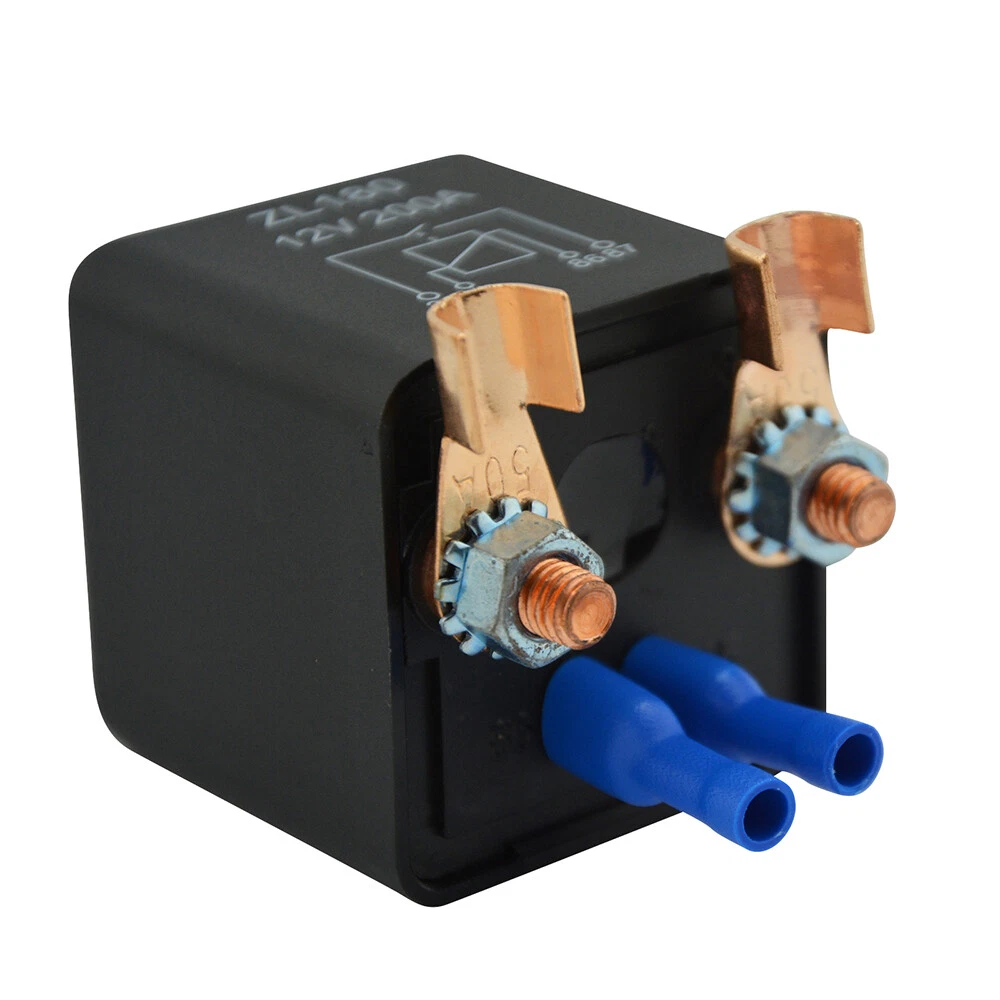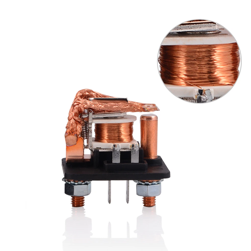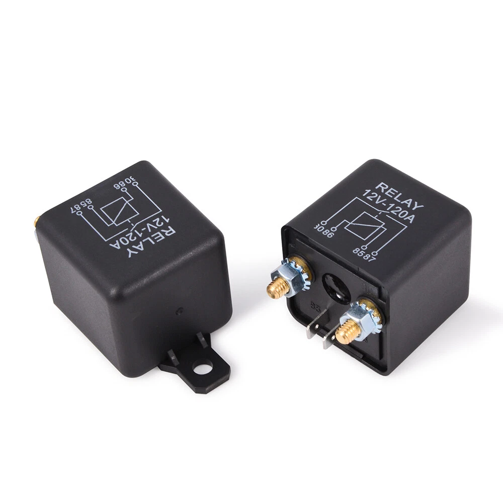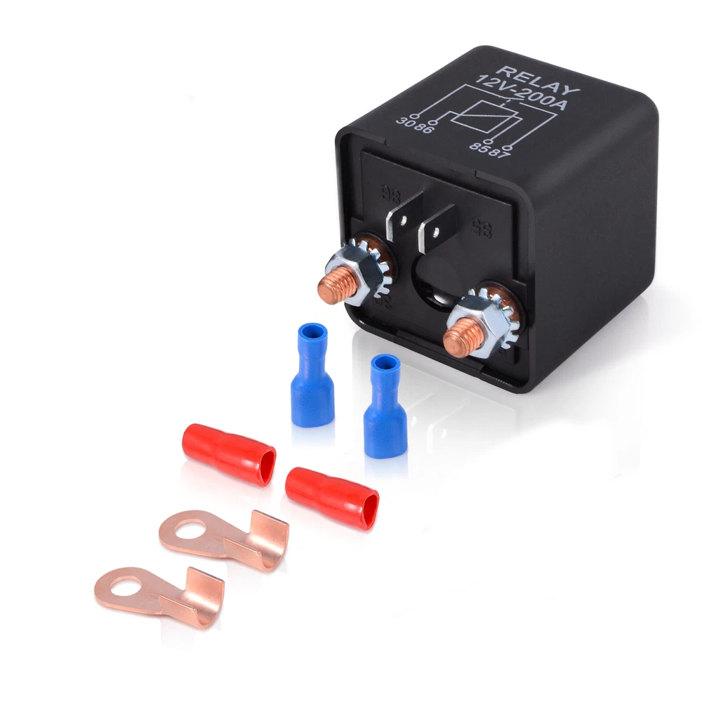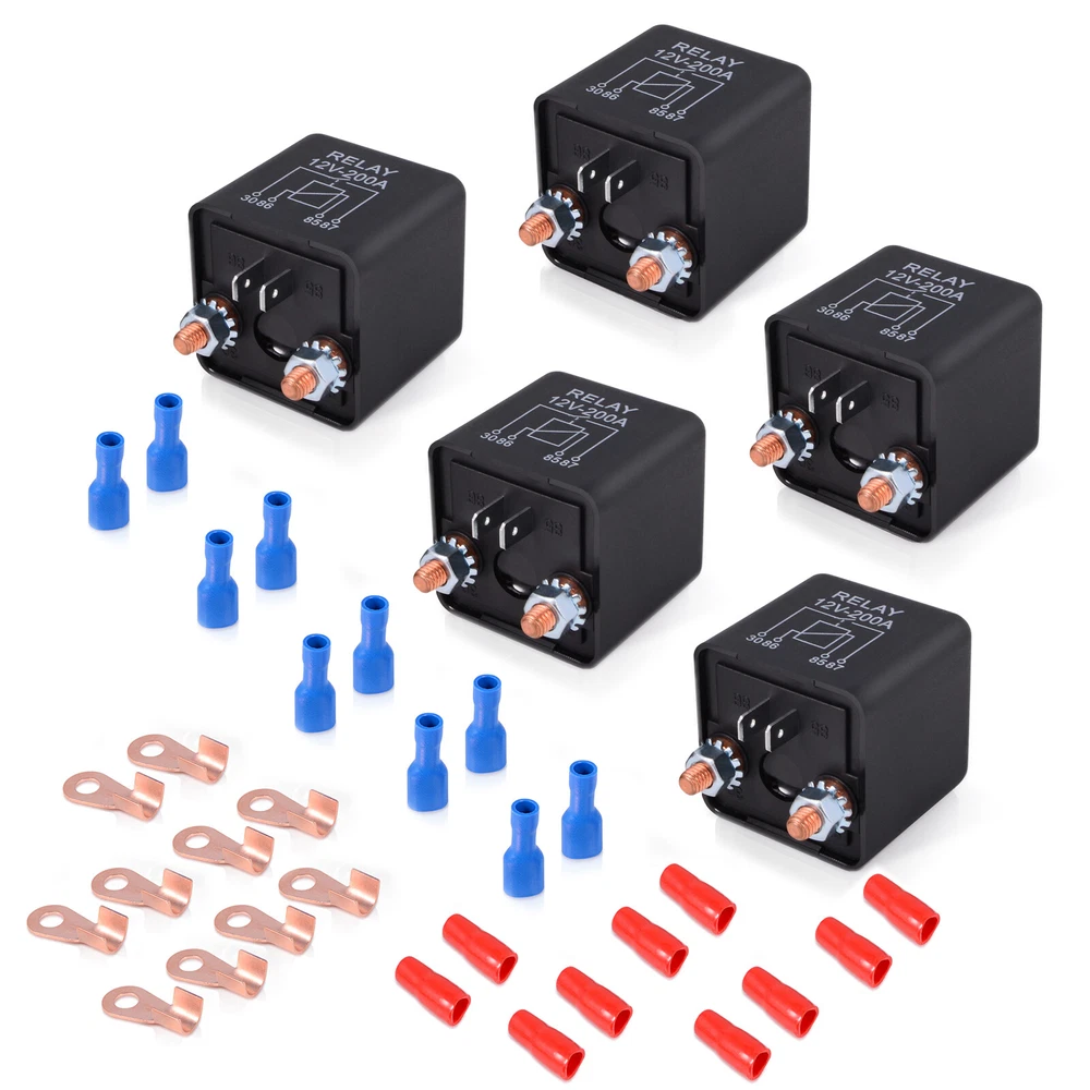 5 Set 12V 200A Heavy Duty Car Relays Automotive Car Starter Split Switch Control US SHIPPING Product Specification: Contact Data: Contact Material: AgSnO12 Contact Form: Normal Open Contact Ratings: No: 200A 14/28VDC Contact Resistance: 100mMax at 6VDC 1A Max switching Current: 500A (5ms) Max Switching Voltage: 75VDC Max Switching Power: 2000W Life Expectancy Electrical: 100,000 Operations (at 30 Operations/min) Life Expectancy Mechanical: 10,000,000 Operations Coil Specification: Nominal Voltage(VDC): 12V/24V Coil Resistance (4.8W/2.4W): 30/60 Max Operate Voltage (VDC): 6.0~8.0 Mix Release (VDC): 1.2~3.6 Max Applicable Voltage (VDC): 15.6 Characteristics: Temperature Range: -30°C ~+80°C Vibration Resistance: 10~55Hz, 1.5mm Shock Resistance: Operations Extremes: 10g Damage Limits: 100g Humidity: 40%~85% Insulation Resistance: 100m ohm Min at 500VDC Safety Standard: CCEE Dielectric Strength Between Open Contacts 500VAC (for one minute/sec) Between Contact and coil: 750VAC (for one minute/sec) Operate Time: 15ms Release Time: 10ms Product Features: -High 200A coil capacity- able to handle those high current applications with ease, Heavy duty make or break (on/off) relay. - With 2pin footprint + 2 terminal accessories, Hundreds of uses include- starter kills, domelight supervision, trunk release, polarity change, power door lock/actuator control. -100% brand new and high quality Durable & Firm & Stable Contact Load: High Power Ideal for universal 12V applications -Vinyl install tools, building tools, industry tools, advertisement film install, mobile screen protective film install -Color: black Net weight: 100g Size: 45mm(L) x 45mm(W) x 45mm(H), about 1.77''(L) x 1.77''(W) x 1.77''(H)