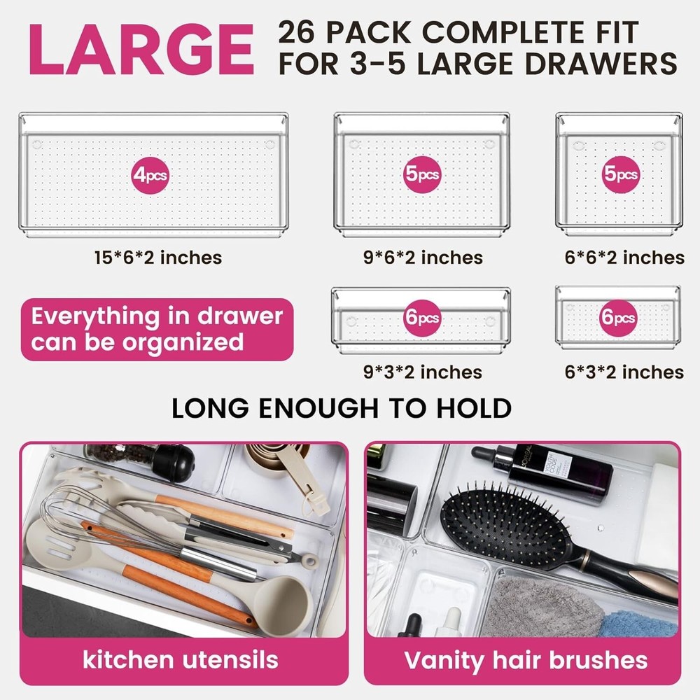 5 Size Heavy Duty Clear Storage Bins - 26 Pack for Ultimate Drawer Organization ‹ › ‹ › ‹ › ‹ › ‹ › ‹ › ‹ › ‹ › ‹ › 5 Size Heavy Duty Clear Storage Bins - 26 Pack Your ultimate solution for drawer organization awaits! This exquisite 26 pack of large-size organizers is designed to elegantly store and arrange all your essentials, whether in your kitchen, bathroom, office, or craft room. Features: LARGER SIZES: With 5 different sizes, this set includes: 4 pack large trays 15x6x2 inches 5 pack 9x6x2 inches 5 pack 6x6x2 inches 6 pack 6x3x2 inches 6 pack 9x3x2 inches FOOD-GRADE QUALITY: Crafted from premium BPA-free PET plastic, making it sturdy, resistant to cracks, and safe for food storage. Your items stay clean and organized without any unpleasant odors. MULTI-USE: Measuring just 2 inches high, these organizers expertly fit in various drawers—perfect for cosmetics, makeup tools, hair accessories, jewelry, office supplies, and much more. STACKABLE AND NON-SLIP: Designed with a wider base, these bins create additional storage space. Use the bonus silicone non-slip pads to prevent movement when opening or closing drawers. MAINTAIN TIPS: Effortlessly clean with a damp cloth to maintain their crystal clear appearance. (Please avoid dishwashers.) Benefits: Ultimate organization solution for any drawer at home or office. Durable and resistant to wear, ensuring longevity. Versatile for multiple uses across different rooms. Maximized drawer space through clever stacking and arrangement. Why choose our Heavy Duty Clear Storage Bins? Say goodbye to clutter and disarray with our Heavy Duty Clear Storage Bins. Designed to cater to your organizational needs, this set not only offers remarkable quality but also an elegant aesthetic, ensuring that your items are stored beautifully. Secure your set today and transform your space into a haven of order and elegance. Shipping Free & Fast Shipping - We offer free shipping to most of the USA with a normal delivery time of 3-7 days. However, due to the current situation, additional delivery time (up to 3 weeks) may be required for some items. Alternative Carriers - We may use alternative carriers (e.g. USPS, FedEx, UPS, etc.) to ensure your package arrives safely and on time. Due to the use of multiple carriers, we are unable to provide a tracking number automatically. Handling Time - Orders are processed and shipped within 1-2 business days of receiving cleared payment. Shipping Restrictions - Shipping to Alaska, Hawaii, Puerto Rico, Guam, and other US territories may incur shipping charges or delivery restrictions. Please contact us before ordering, or your order can be refunded/cancelled. State Restrictions - There may be restrictions based on your state of purchase. For example, certain items may not be shipped to California due to state regulations. Contact for Tracking Updates - If you require tracking updates or have any concerns about the delivery of your order, please feel free to contact us, and we will be happy to assist you. Return 30-Day Hassle-Free Returns - We want you to be completely satisfied with your purchase. If you are not, you can return the item within 30 days of receiving it for a full refund or exchange. Easy Return Process - To start a return, simply contact us and we will provide you with a prepaid return shipping label and detailed instructions. Restocking Fee - There are no restocking fees for returns. However, the buyer is responsible for return shipping costs if the return is not due to a seller's error. Refund Processing Time - Refunds will be processed within 5 business days of receiving the returned item in its original condition. Payment We accept all major credit cards, PayPal, and Apple Pay for your convenience. Your payment information is secure and encrypted to ensure a safe and seamless transaction. Please complete your payment within 3 days of purchase to avoid any delays in shipping. Feedback Your feedback is extremely important to us. We strive to provide the best products and customer service possible. If you are satisfied with your purchase, please take a moment to leave us a positive review. If you have any concerns or issues with your order, please contact us before leaving negative feedback. We are committed to resolving any problems and ensuring your satisfaction. Contact Us If you have any questions or concerns, please feel free to reach out to our customer support team. You can contact us through the eBay messaging system. We are available Monday to Friday, 9:00 am to 5:00 pm EST, and we will do our best to respond to your inquiry within 24 hours. Thank you for supporting our small family business! UPC: Not Set Unit Quantity: 26.0 count Material: Plastic,PET plastic Features: Stackable,BPA-Free,Crack Resistant,Scratchproof,Lightweight Mounting: Free Standing Theme: Not Set Brand: Unbranded Item Height: Plastic Drawer Organizer Bins Item Length: Plastic Drawer Organizer Bins Item Width: Plastic Drawer Organizer Bins Type: Drawer Box Size: Large Color: Clear Capacity: Not Set Item Weight: 6.82 pounds Number of Items in Set: Twenty-Six-Piece Item Depth: 2 in MPN: Not Set Model: Not Set Number in Pack: 26 Number of Compartments: 1 Shape: Rectangle Pattern: Not Set Style: Modern Country/Region of Manufacture: Not Set Original/Reproduction: Not Set Finish: None Unit Type: Unit Assembly Required: Not Set Personalize: Not Set