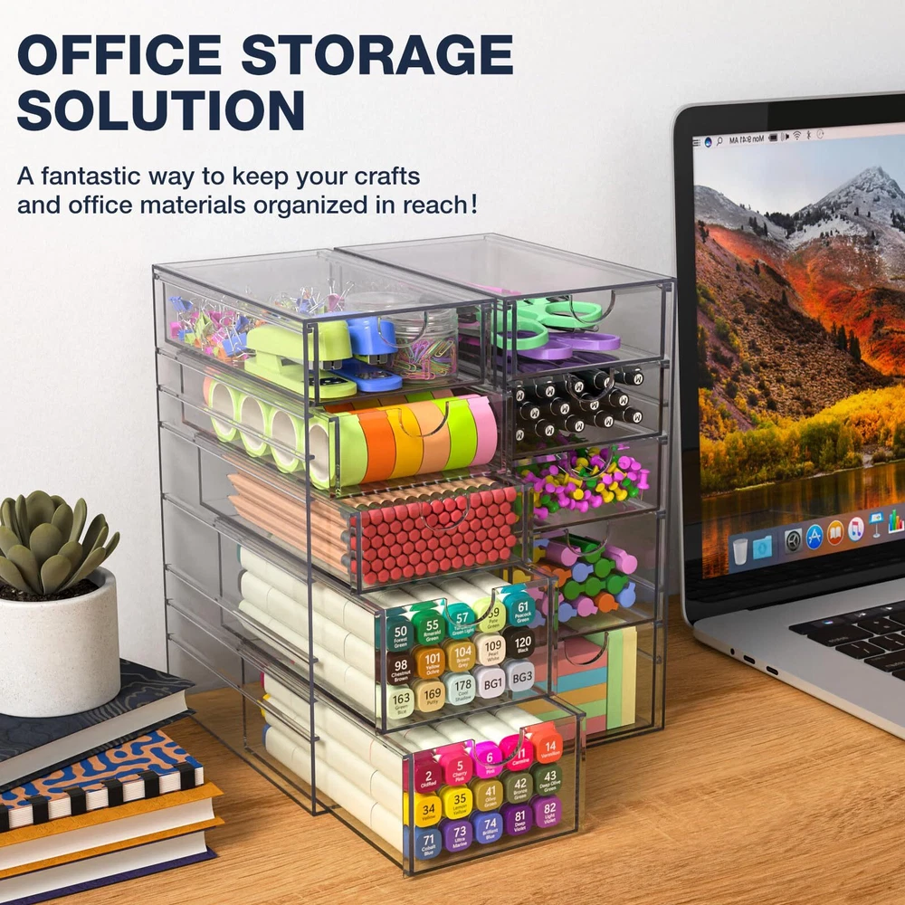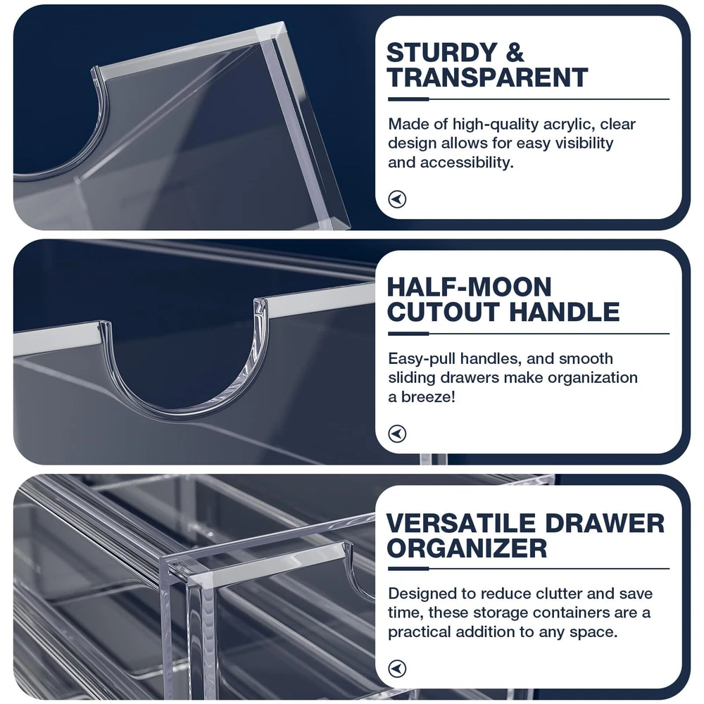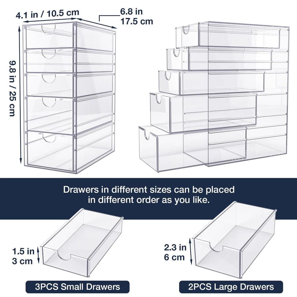 【Excellent Storage and Multi-Function】-- The desktop organizer measures approximately 4.1 "W x 6.8 "L x 9.8 "H / 10.5 x 17.5 x 25cm. The clear acrylic organizer is a fantastic way to add storage space and style to any room in your home. With its large capacity and stylish design, this storage box is sure to add a unique element to your home decor. (NOTE: The length of the drawer box is 6.8"/17.5cm, please first check the length of your item in case it won't fit. WARNING: Some pencils are too long to fit into.) 【Desktop Storage with 5 Drawers】-- Designed with 5 drawers, 2PCS LARGE drawers are 2.3"/6cm high, suitable for placing larger items such as markers, pens, scissors and other stationery. 3PCS small drawers are 1.5"/3cm high, perfect for smaller accessories such as paper clips, binders, thumbtacks, erasers, rulers and other small tools. Moreover, you can arrange each drawer from top to bottom in different order as you like. It's perfect for organizing all the messy items into categories, and it's very easy to access. You can also use them side by side and place small items on top of the acrylic storage bins to make your countertop space tidier. 【Half-moon Cutout Handle & Smooth Sliding Drawers】-- Each small drawer is designed with an ergonomic curved handle for easy pulling. The edges are smooth, rounded and won't scratch your hands. It will be a perfect way to maximize storage opportunities, no matter the space. Ideal for use as a desktop organizer with drawers, office supplies organizer, acrylic paint organizer, makeup drawer or hair accessories organizer. 【Acrylic Office Desk Organization & Storage】-- Our storage box is made of premium acrylic material, which has better aging resistance, higher hardness and durability. In addition, acrylic has a clear transparency that enhances the overall appearance of the storage box, becoming more visible and organized, while adding the perfect display to any room. 【Stack it up】-- The storage box is perfect for storing all your hair accessories and makeup. The sleek design will add style to your dressing table. Moreover, the drawers provide plenty of storage space, allowing you to store and organize your items with ease. To keep your desk looking tidy while keeping office scool supplies within easy reach. As your stationary collection expands, customize your display by stacking additional organizers from the Desktop Storage Drawers Series (5 drawers or 3 drawers).