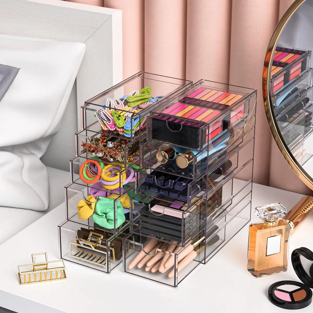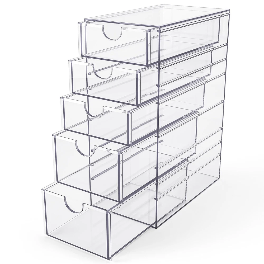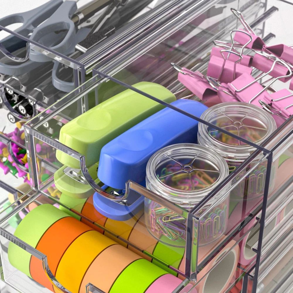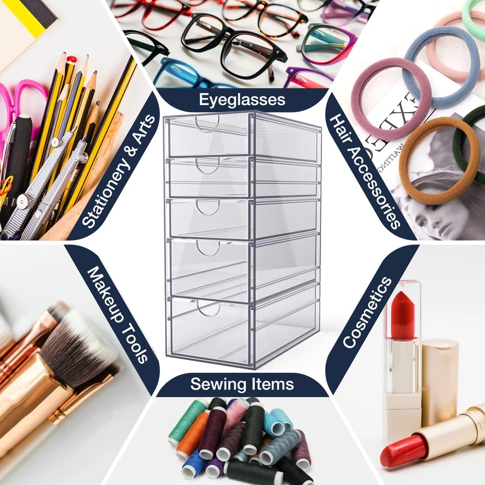 【Excellent Storage and Multi-Function】-- The desktop organizer measures approximately 4.1 "W x 6.8 "L x 9.8 "H / 10.5 x 17.5 x 25cm. The clear acrylic organizer is a fantastic way to add storage space and style to any room in your home. With its large capacity and stylish design, this storage box is sure to add a unique element to your home decor. (NOTE: The length of the drawer box is 6.8"/17.5cm, please first check the length of your item in case it won't fit. WARNING: Some pencils are too long to fit into.) 【Desktop Storage with 5 Drawers】-- Designed with 5 drawers, 2PCS LARGE drawers are 2.3"/6cm high, suitable for placing larger items such as markers, pens, scissors and other stationery. 3PCS small drawers are 1.5"/3cm high, perfect for smaller accessories such as paper clips, binders, thumbtacks, erasers, rulers and other small tools. Moreover, you can arrange each drawer from top to bottom in different order as you like. It's perfect for organizing all the messy items into categories, and it's very easy to access. You can also use them side by side and place small items on top of the acrylic storage bins to make your countertop space tidier. 【Half-moon Cutout Handle & Smooth Sliding Drawers】-- Each small drawer is designed with an ergonomic curved handle for easy pulling. The edges are smooth, rounded and won't scratch your hands. It will be a perfect way to maximize storage opportunities, no matter the space. Ideal for use as a desktop organizer with drawers, office supplies organizer, acrylic paint organizer, makeup drawer or hair accessories organizer. 【Acrylic Office Desk Organization & Storage】-- Our storage box is made of premium acrylic material, which has better aging resistance, higher hardness and durability. In addition, acrylic has a clear transparency that enhances the overall appearance of the storage box, becoming more visible and organized, while adding the perfect display to any room. 【Stack it up】-- The storage box is perfect for storing all your hair accessories and makeup. The sleek design will add style to your dressing table. Moreover, the drawers provide plenty of storage space, allowing you to store and organize your items with ease. To keep your desk looking tidy while keeping office scool supplies within easy reach. As your stationary collection expands, customize your display by stacking additional organizers from the Desktop Storage Drawers Series (5 drawers or 3 drawers).