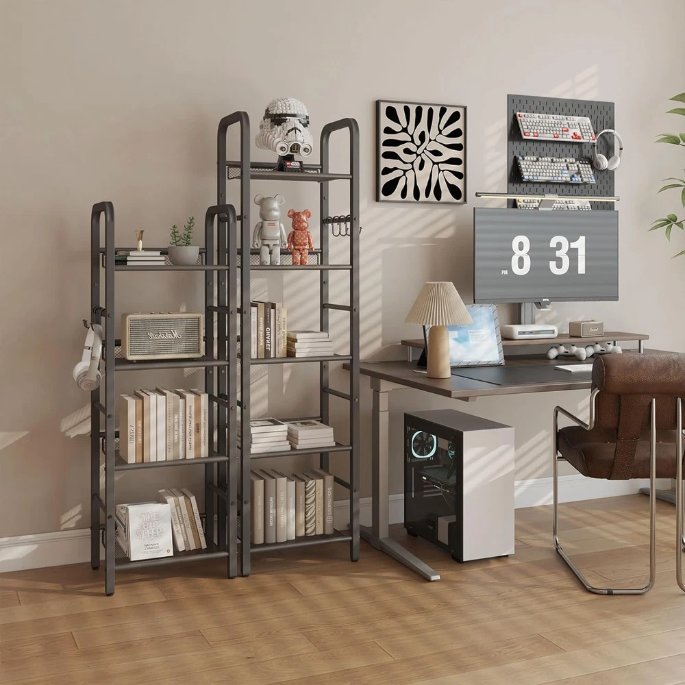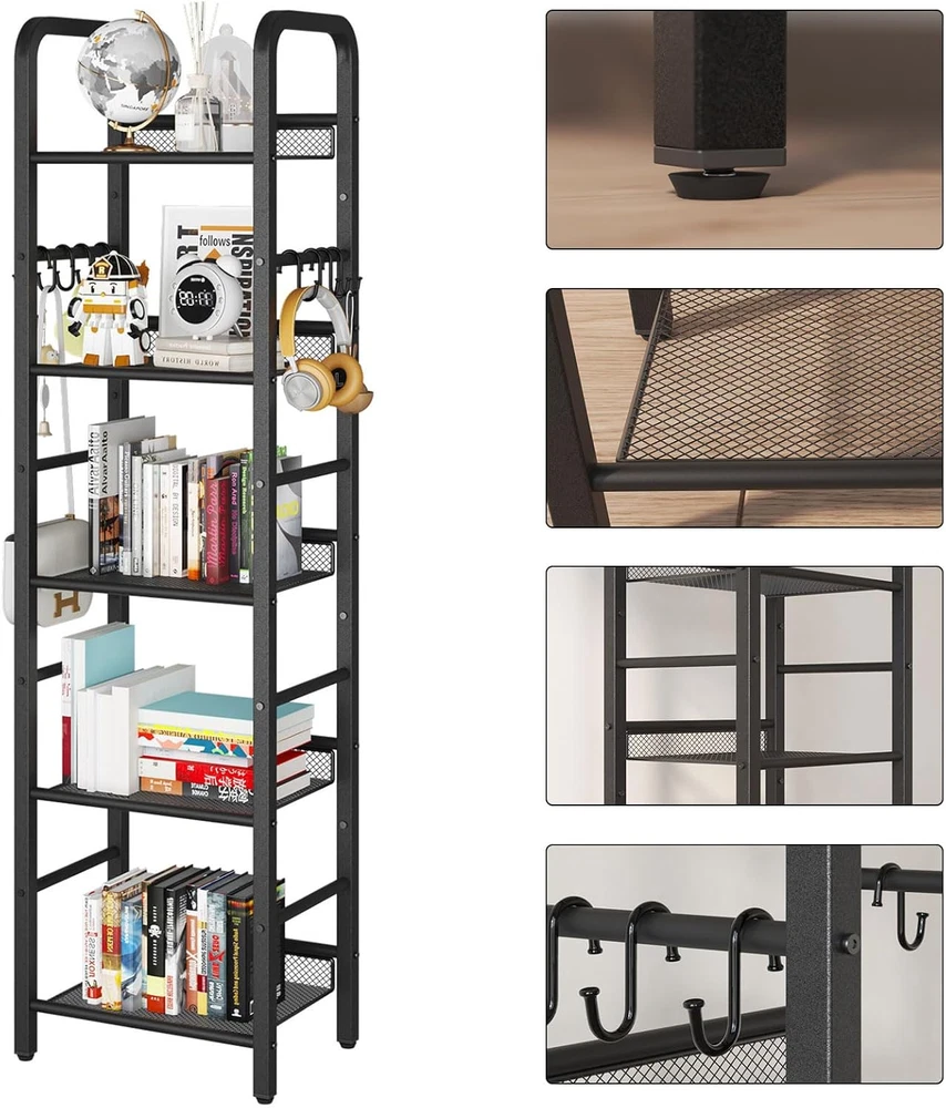 Store New Arrivals Add to Favorite View Feedback Contact 5 Tier Bookshelf, Freestanding Bookcase for Living Room, Bedroom, Home Office, Multi-Functional Storage Rack Organizer, Display Rack with Metal Frame, Rust Resistance, Black, UHBC055B Description Item model number HBC055B Style Modern Number of Items 1 Material Metal Mounting Type Free Standing Country of Origin China Room Type Living Room Assembly Required Yes Product Dimensions 14.17"D x 10.43"W x 57.48"H Installation Type Freestanding Age Range (Description) Adult Finish Type Metal Specific Uses For Product Living Room, Office, Bedroom Back Style Backless Item Weight 9.46 pounds Number of Shelves 5 Special Feature Sturdy Shelf Type Metal Shape Square Furniture Finish Metal Recommended Uses For Product Office, Living Room, Bedroom Product Care Instructions Wipe with Dry Cloth Size 5-Tier (10.43"x14.17"x57.48") Versatile Display Rack: This storage rack can be used not only as a bookshelf, but also as a dispaly rack in the living room, a plant stand in the balcony, a storage rack in the bathroom, and even a kitchen storage shelf Large capacity: There are two sizes available, four and five, which can be selected according to actual needs. They are fully suitable for daily household use, whether it is placed in the office, bedroom, or living room, they are all ideal decorations Sturdy: The bookshelf is made entirely of sturdy metal frames, which are welded very firmly. Anti tipping device provides sturdy support for your beloved item.The pads on the bottom of the display rack can prevent the ground from being scratched Easy to Assemble: Clear and detailed instructions, and numbered parts for assembly are included in the package to ensure you can easy assembly.Prduct Size:4 tiers: 45.67H*14.17L*10.43W",5 tiers: 57.48H*14.17L*10.43W".There are multiple style to choose from, and there is always one you will like Customer service: We provide professional customer service before and after purchase. No matter what problem you encounter, we will solve it for you as soon as possible. Don't hesitate any longer and take it home now Product Description 1 Studio 2 Bedroom 5 Tier Bookshelf White Shelf adds storage space effortlessly The 5-layer black minimalist style storage rack is made of high-quality metal and iron mesh, making it easy to move. The X-shaped structure behind the base greatly improves the stability of the shelf. Four padded feet can prevent scratches on the ground. Hook Design Hang some small pendants. Compact railing Compact railing to prevent objects from falling. Iron Mesh Frame Strong load-bearing capacity. Padded four feet Padded four feet can prevent scratches on the ground. Living Room Bookshelf Storage Rack Plant Rack Bathroom storage Product Name: YMYNY 5 Tier Bookshelf Product Color: Black Material:Material: High quality metal Product Size: 14.2 x 10.6 x 57.5 inches Product Weight: 9.5 Pounds Package Details: 1 x Assembly Kit, 1 x Instructions, 1 x 5-Tier Bookshelf Add to Cart Add to Cart Add to Cart Add to Cart Add to Cart Add to Cart Customer Reviews 4.2 out of 5 stars 63 4.4 out of 5 stars 178 4.4 out of 5 stars 178 4.5 out of 5 stars 235 4.5 out of 5 stars 235 4.5 out of 5 stars 235 Price $35.99 $ 35 . 99 $25.99 $ 25 . 99 $42.99 $ 42 . 99 $37.99 $ 37 . 99 $42.99 $ 42 . 99 $45.99 $ 45 . 99 Product Name: YMYNY 5-Tier Bookshelf YMYNY4-Tier Ladder Bookcase YMYNY 5-Tier Ladder Bookcase YMYNY 4-Tier Storage Rack YMYNY 5-Tier Storage Rack YMYNY 6-Tier Storage Rack Product Color: Black Rustic Brown and black Rustic Brown and black Rustic Brown and black Rustic Brown and black Rustic Brown and black Material: High quality metal Metal and particle board Metal and particle board Metal and particle board Metal and particle board Metal and particle board Product Size: 10.6"D x 14.2"W x 57.5 "H 11.8"D x 13.4"W x 49.2"H 11.8"D x 13.4"W x 62.99"H 11.4"D x 16.9"W x 44.1"H 11.4"D x 16.9"W x 57.7"H 9.8"D x 16.9"W x 71.7"H Adjustable Feet: ✔ ✔ ✔ ✔ ✔ ✔ Add to Cart Add to Cart Add to Cart Customer Reviews 4.5 out of 5 stars 235 4.5 out of 5 stars 151 4.5 out of 5 stars 195 4.5 out of 5 stars 195 4.2 out of 5 stars 55 5.0 out of 5 stars 11 Price $35.99 $ 35 . 99 — — — $29.99 $ 29 . 99 $42.99 $ 42 . 99 Product Name: YMYNY 3-Tier Bookcase YMYNY Tall End Table YMYNY 2-Tier End Table YMYNY 3-Tier End Table YMYNY C-Shaped End Table YMYNY Round End Table Product Color: Rustic Brown and black Rustic Brown and black Rustic Brown and black Rustic Brown and black Gold Color Gold Color Material: Metal and particle board Metal and particle board Metal and particle board Metal and particle board Metal and tempered glass Metal and tempered glass Product Size: 11.4"D x 15.8"W x 29.5"H 11.0"D x 15.0"W x 28.7"H 11.4"D x 15.7"W x 20.5"H 11.4"D x 15.7"W x 24.4"H 11.8"D x 15.8"W x 24.8"H 19.7"D x 19.7"W x 25.6"H Adjustable Feet: ✔ ✔ ✔ ✔ ✔ ✔ ABOUT US We offer the best prices around on high quality products. Our E-store includes media such as books, movies, music and games while offering electronics, toys, sporting apparel, clothing, tools, general home, garden items and more. SHIPPING We are always working hard to ensure your package arrives as soon as possible. Please understand that some factors like weather, high postal traffic, and the performance of shipping companies are outside of our control. We offer free shipping to the lower 48 states and ship within 2 business days of payment, usually sooner. We do not accept P.O. Boxes. Please provide a physical address. For shipping outside of the continental USA, we only use eBay's Global Shipping Program.The item is shipped to KY and then sent to the rest of the world. International customers are responsible for all duties and taxes. Continue to check out in order to calculate costs for shipping the item to your country. Messages regarding eBay's Global Shipping Program MUST be directed at eBay EXCLUSIVELY. RETURNS We offer a 30-Day Return Policy on items which you are not comple