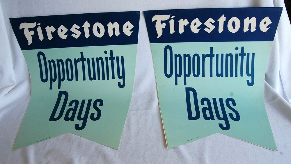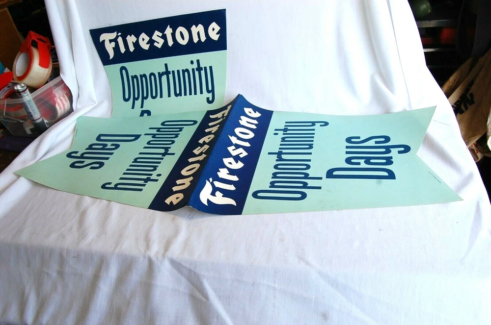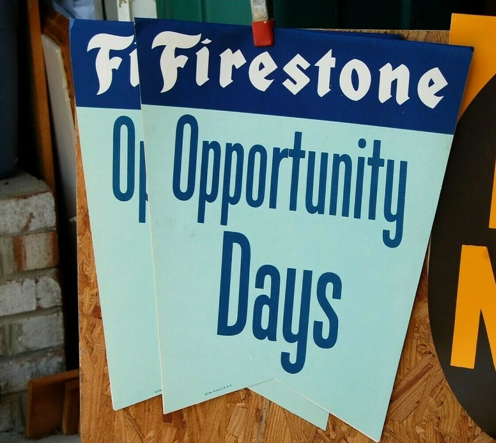5 VINTAGE FIRESTONE TIRE ADVERTISING SIGNS DISPLAY Gas Station Buy Now-Pay Later Check Paper Banners, double sided and designed to hang An old tire center went out of business after 70 years. I believe these are maybe 50s 60s. 2 Firestone signs and 1 each of the others. All double sided. Never hung or used, so new old stock stock Listing is for all 5 signs, all about 15 inches across Took pictures in the garage because the wind was intolerable today. These I will mail in a mailing tube I will list others and will combine for shipping.