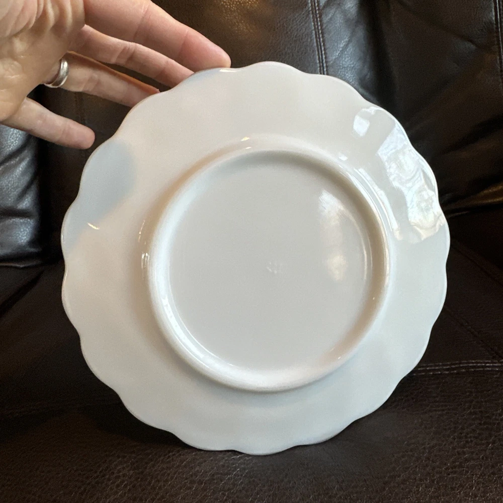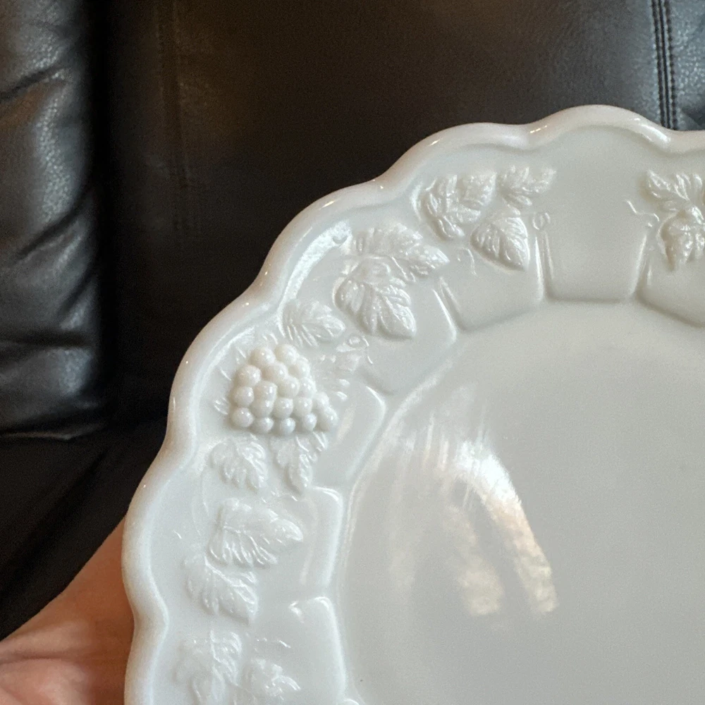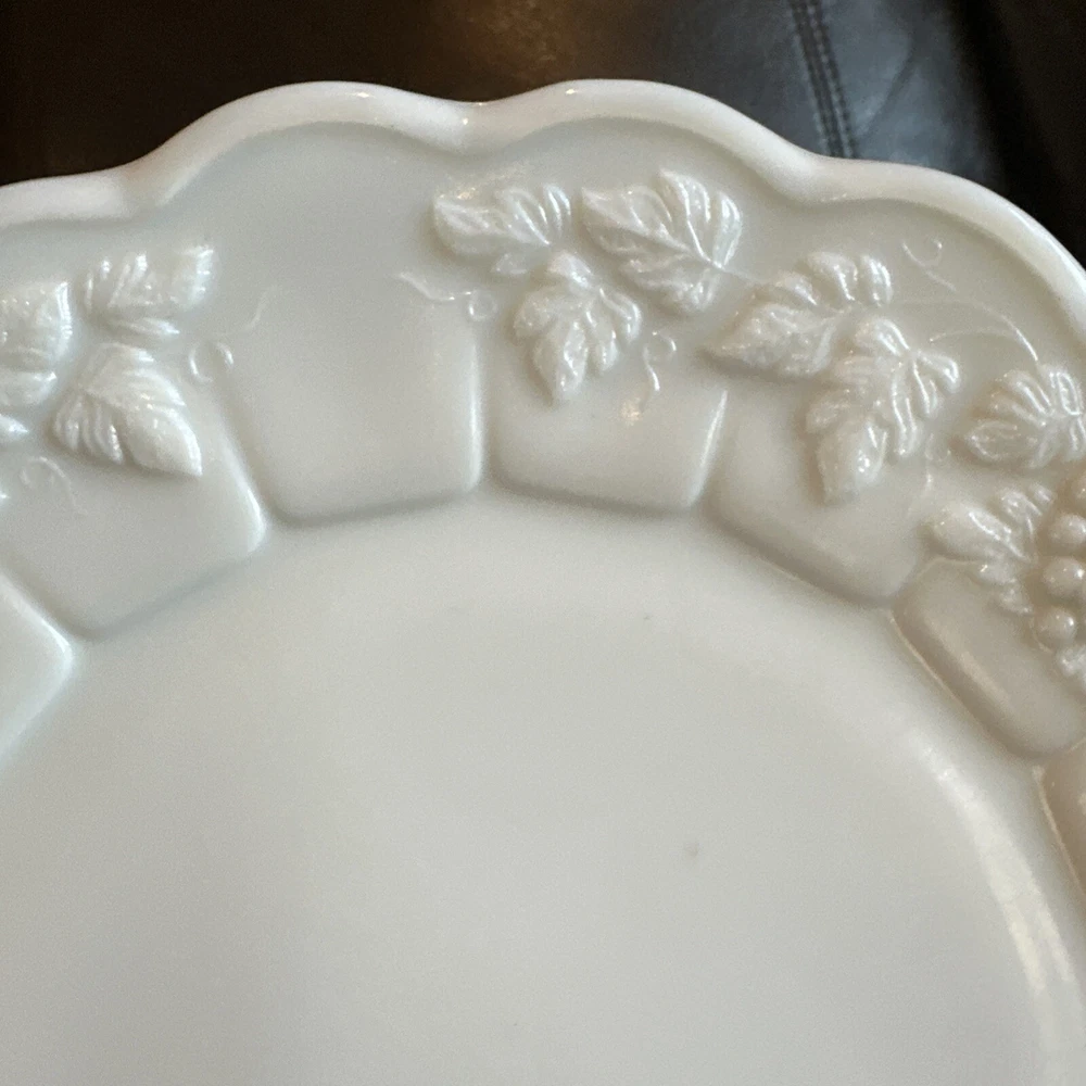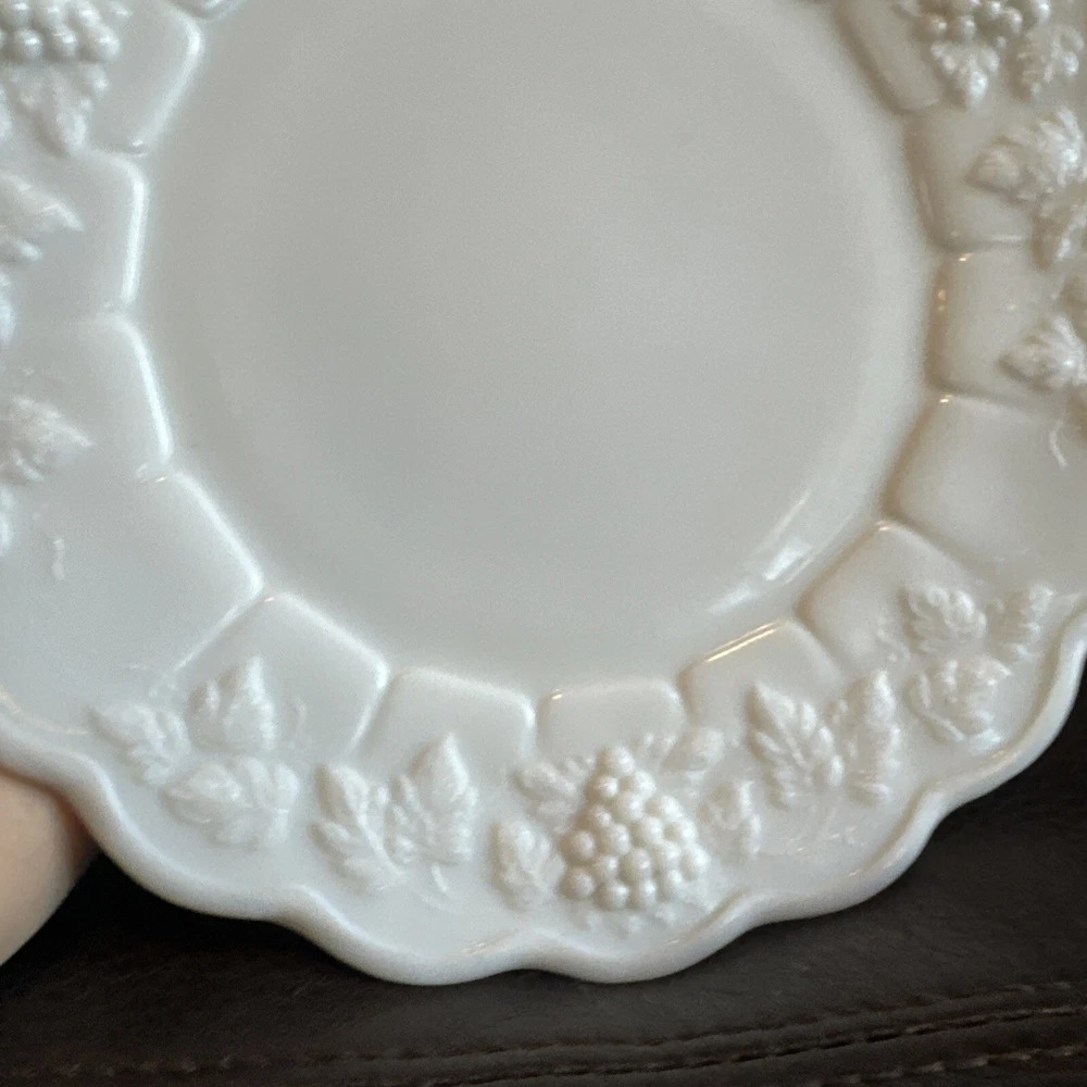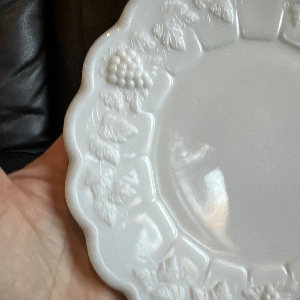 This beautiful Westmoreland milk glass plate is a vintage piece from the mid-20th century. The 6 1/4 inch round plate features an embossed and scalloped edge design with a decorative paneled grape pattern. The white plate is perfect for any occasion, whether it's a love and romance dinner, a bridal shower, or a holiday gathering. The plate is an original and authentic piece, made in the United States with a pressed glass production style. It's recommended to hand wash only for care instructions. The plate is a great addition to any eclectic style decor and is perfect for serving bread, butter, dessert, or any other dish. Get this unique piece now and add a touch of old-world charm to your home.