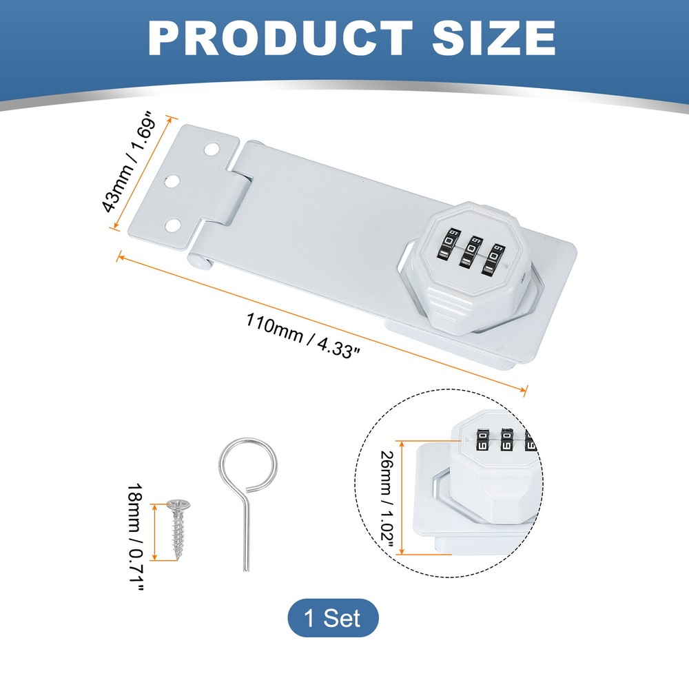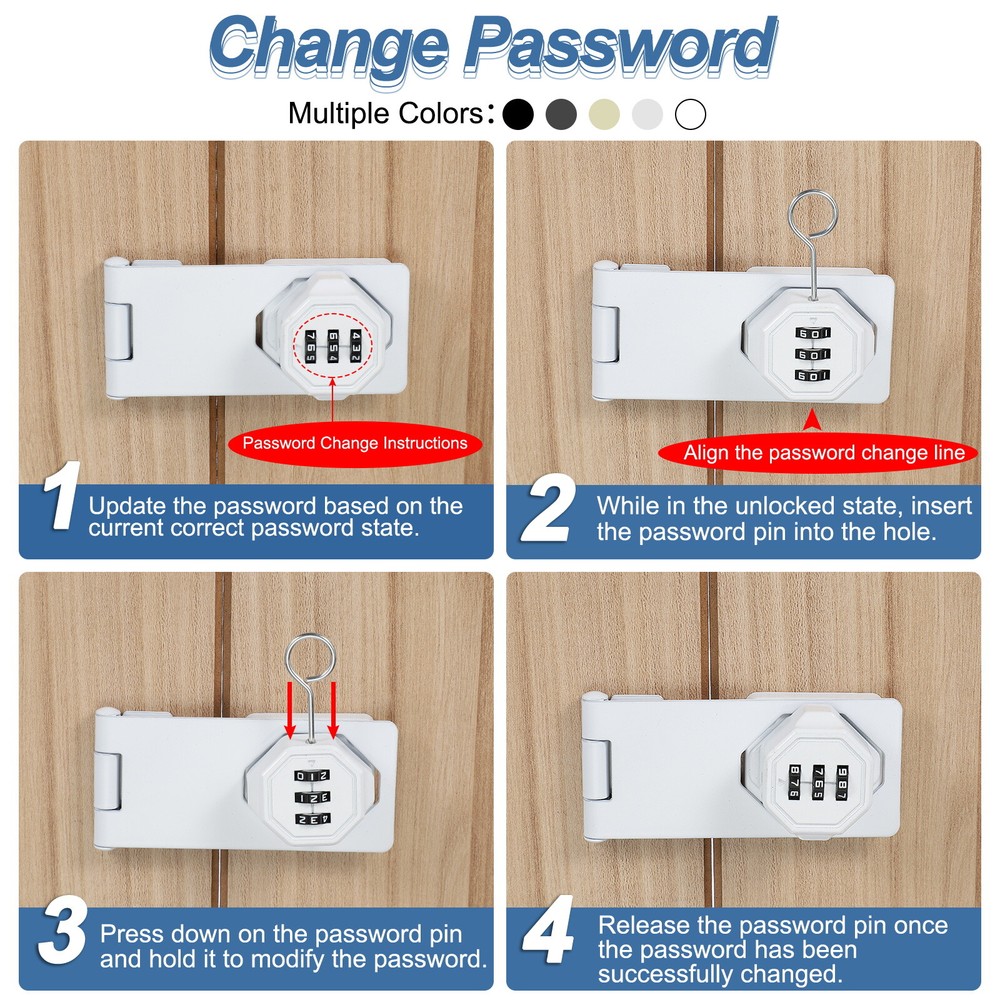 Document What is this?Code rotary hasp locks great use for main doors, sliding doors, sheds, cabins, lockers, windows, cabinets, drawers, kitchens, barn doors, etc.What will I get?The Bifold Door Lock Sizes: 110 x 43 x 26 mm / 4.33 x 1.69 x 1.02 Inch (L*W*H), Screw Length: 18 mm / 0.7 Inch.In the package of: 1 x Closet Lock, 7 x Screw, 1 x Password PinIs there any advantages of the product?Cabinet locks are made of zinc alloy and the surface is electroplated and polished, with a thickened base, corrosion-resistant, have smooth edges, and turn smoothly without jamming. Keyless design, and can be used for a long time, no longer need to worry about losing your key.How to use it?The door latch lock can be installed at a right angle of 90 degrees or a flat surface of 180 degrees, the password can be set or modified when the lock is in the unlocked state.What should I notice?The initial password is 000. (Refer to the manual for use) Password Rotary Hasp Locks Mechanical Cabinet Latch Locks 5" No Drilling White What is this? Code rotary hasp locks great use for main doors, sliding doors, sheds, cabins, lockers, windows, cabinets, drawers, kitchens, barn doors, etc. What will I get? The Bifold Door Lock Sizes: 110 x 43 x 26 mm / 4.33 x 1.69 x 1.02 Inch (L*W*H), Screw Length: 18 mm / 0.7 Inch. In the package of: 1 x Closet Lock, 7 x Screw, 1 x Password Pin Is there any advantages of the product? Cabinet locks are made of zinc alloy and the surface is electroplated and polished, with a thickened base, corrosion-resistant, have smooth edges, and turn smoothly without jamming. Keyless design, and can be used for a long time, no longer need to worry about losing your key. How to use it? The door latch lock can be installed at a right angle of 90 degrees or a flat surface of 180 degrees, the password can be set or modified when the lock is in the unlocked state. What should I notice? The initial password is 000. (Refer to the manual for use) Hot Item Payment 1.We accept eBay payment . 2.Payment must be received within 7 business days of auction closing. Shipping 1.We ship to your eBay or Paypal address. Please make sure your eBay and Paypal address is correct before you pay. 2.Items will be shipped within 1-3 business day when we received payment. 3.Delivery time depends on destination and other factors. Description Policy Password Rotary Hasp Locks Mechanical Cabinet Latch Locks 5" No Drilling White What is this? Code rotary hasp locks great use for main doors, sliding doors, sheds, cabins, lockers, windows, cabinets, drawers, kitchens, barn doors, etc. What will I get? The Bifold Door Lock Sizes: 110 x 43 x 26 mm / 4.33 x 1.69 x 1.02 Inch (L*W*H), Screw Length: 18 mm / 0.7 Inch. In the package of: 1 x Closet Lock, 7 x Screw, 1 x Password Pin Is there any advantages of the product? Cabinet locks are made of zinc alloy and the surface is electroplated and polished, with a thickened base, corrosion-resistant, have smooth edges, and turn smoothly without jamming. Keyless design, and can be used for a long time, no longer need to worry about losing your key. How to use it? The door latch lock can be installed at a right angle of 90 degrees or a flat surface of 180 degrees, the password can be set or modified when the lock is in the unlocked state. What should I notice? The initial password is 000. (Refer to the manual for use) Hot Item Payment 1.We accept eBay payment . 2.Payment must be received within 7 business days of auction closing. Shipping 1.We ship to your eBay or Paypal address. Please make sure your eBay and Paypal address is correct before you pay. 2.Items will be shipped within 1-3 business day when we received payment. 3.Delivery time depends on destination and other factors.