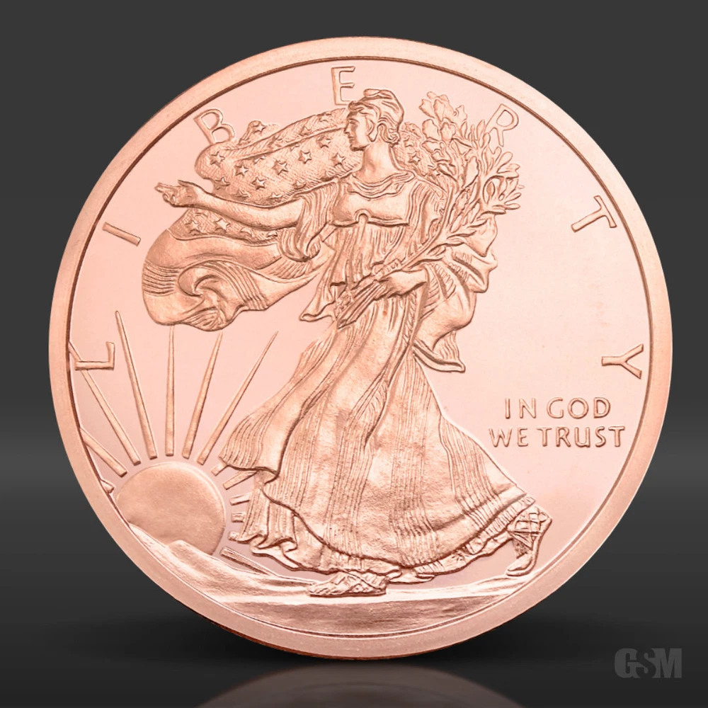Silver Rounds & Bars Copper Rounds Would you like to receive updates about new items, sales and more? Sign up for our newsletter now! 5 oz Walking Liberty Copper Round .999 Fine Copper Bullion 5 AVDP Ounce The 5 AVDP ounce Walking Liberty Copper Round by Golden State Mint are popular choice among first-time buyers or those just adding to their stack. These rounds are made in the USA, struck in .999 fine copper bullion The design of these rounds features a full-length figure of Liberty, the folds of her dress flying to the breeze as a background, progressing in full stride toward the dawn of a new day carrying branches of laurel and oak, symbolical of civil and military glory. The hand of the figure is outstretched in bestowal of the spirit of liberty. The reverse of the half dollar shows an eagle perched high upon a mountain crag, wings outstretched.These privately minted rounds or medallions were made in the USA by Golden State Mint. Investors are able to purchase directly from GSM, rather than buying sovereign minted coins which carry a much higher premium as they are sold between middle-men before they're available for retail purchase. Get more for your investment dollar, and purchase rounds or medallions directly from Golden State Mint! If you liked this product, you should check out our 1 oz Silver Standing Liberty, 1/4 oz Copper Walking Liberty, and 1/2 oz Copper Walking Liberty. Diameter (≈): 64 mm | 2.519" Thickness (≈): 6.07 mm | 0.238" Solid, pure .999 Fine Copper. No plating or coating. Golden State Mint is a private mint in the USA and the manufacturer of these products. All GSM-minted products are produced in-house and never resold so we always know we are offering a new and quality item. That is what “Mint Fresh – Direct to You” means. Our products are solid and pure metal and never plated. We specialize in ISO-certified and IRA-approved precious metals. Our reputation in the precious metal industry spans many decades and GSM is recognized as an industry leader known for our high quality and competitive pricing. Our products are often found available by other resellers. Please review product details closely and be wary of anything that looks too good to be true, it may be.