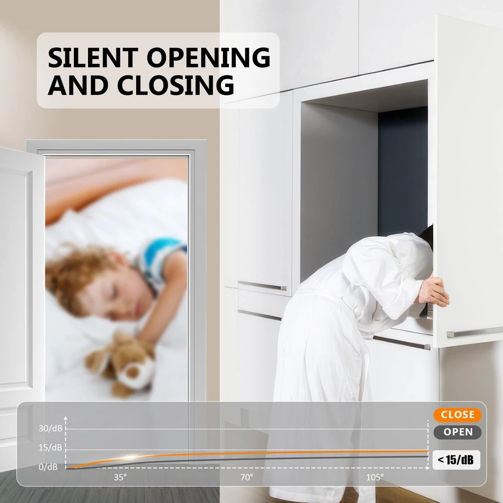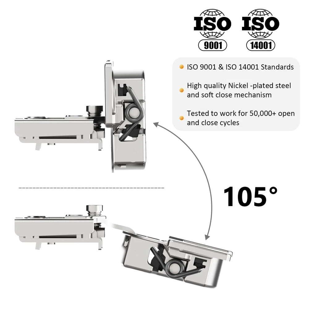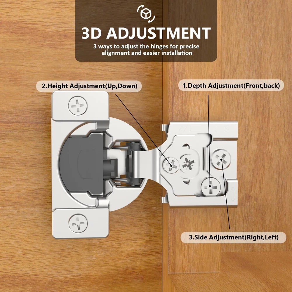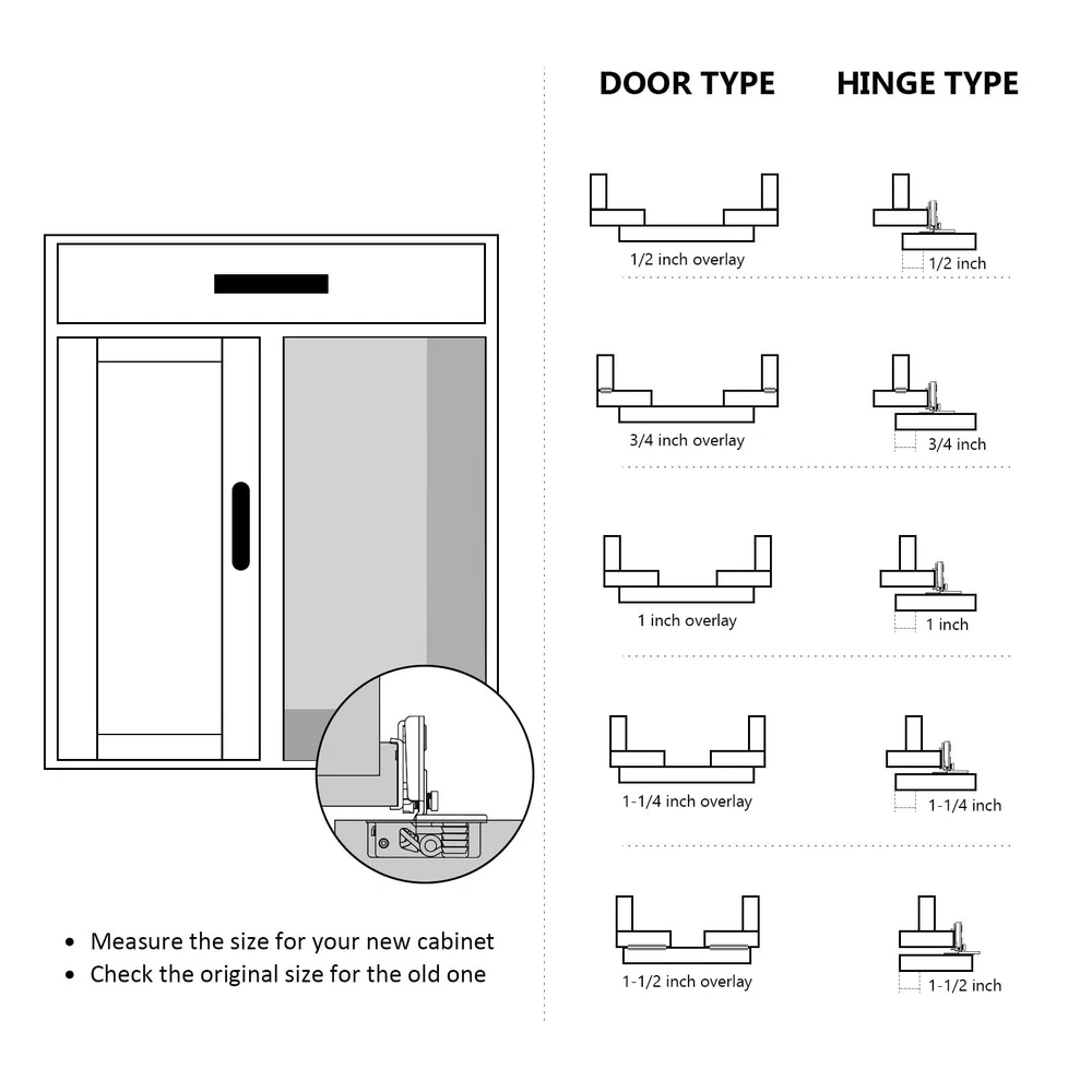Durable Material: The heavy-duty soft closing hinges are made of solid steel. The hidden cabinet hinges are made of solid metal material. The damping mechanism and spring are strong, making the hinge operate long-lasting. The soft self-closing hinges are hidden types. It's whether you prefer modernity or traditional touches. 1/2" Overlay Soft Close Hinges:Each cabinet hinge has a built-in damper that creates a self-closing action that reduces the closing speed, which can protect your fingers. Heavy-duty hinges feature a stainless steel finish that has been tested for durability hundreds of thousands of times. Suitable for face frame and frameless cabinets. Such as kitchen cabinet doors, closets, TV cabinets, bookcases, wine cabinets. PRODUCTS SPECIFICATION: Soft close; Opening angle:105°; Overlay: 1/2"; Cup diameter:35mm,depth:11.6mm, Screw holes distance:(45mm). Material: Cold-rolled Steel, Surface finish:Nickel-plated.Each slow-closing cabinet hinge comes with 2 easy-to-install dowels and 3 self-tapping wood screws to ensure a perfect fit. How to choose the right hinge:For FACE FRAME cabinet, the hinges will overlay 1/2" of the frame. For FRAMELESS cabinet, the hinges will overlay 1/2" of side panel. You must choose the cabinet hinges that fit the side thickness of your cabinet(measure the distance the door panel overlaps the cabinet face). For example, if the thickness of the cabinet side panel is 1/2", then you should choose the corresponding 1/2" hinge.